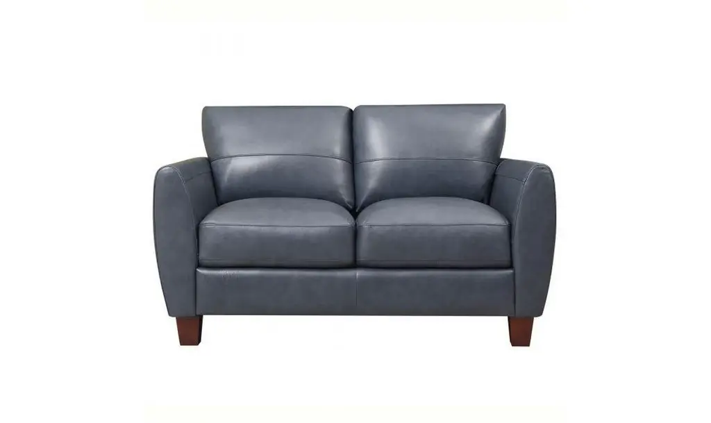 The Leather Italia Traverse Traditional Loveseat in Blue Leather blends timeless design with modern comfort. Upholstered in luxurious top grain leather, this loveseat introduces a sophisticated blue hue to your living space. The attached seat and back cushions ensure a tidy appearance, enhanced by additional foam for shaping and high resilience polyurethane foam for plush comfort. The loveseat features high resiliency elastic webbing supporting the back cushions, and the seat platform is lined with cloth and elastic cloth to insulate the springs from the foam. The sinuous steel spring suspension provides robust support, while multiple rows of encapsulated coil springs inside the seat core enhance durability and comfort. Constructed with premium kiln-dried hardwood laminate, the loveseat boasts a polyurethane roll for edge protection and support. All outside panels are fully padded, adding to the robust structure. The fiber wrap and blown fiber filling offer additional stress relief and support, making this loveseat a perfect blend of elegance and comfort.