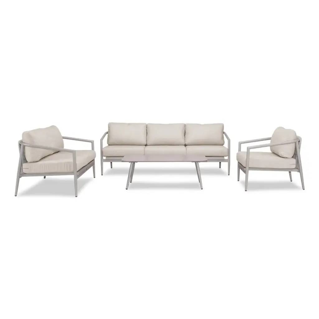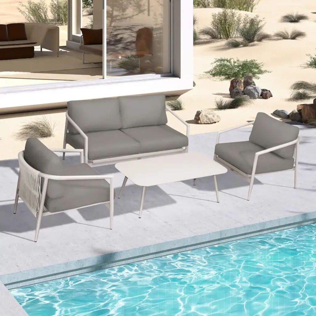 "Meet your new favorite hangout - our mid-century inspired sofa loveseat set. Crafted with a thick gauge, powder-coated aluminum frame, it's both durable and delightful. The set includes a sofa, loveseat, and chair, all featuring deep seating design and water, mold, mildew, and fade-resistant Sunbrella cushions. Just imagine lounging with loved ones on these foam-filled cushions, offering an enticing blend of support and comfort. Plus, the cushion covers are machine-washable so spills are no sweat! Let's not forget the unique interwoven design - it's all about the details."