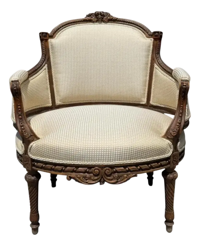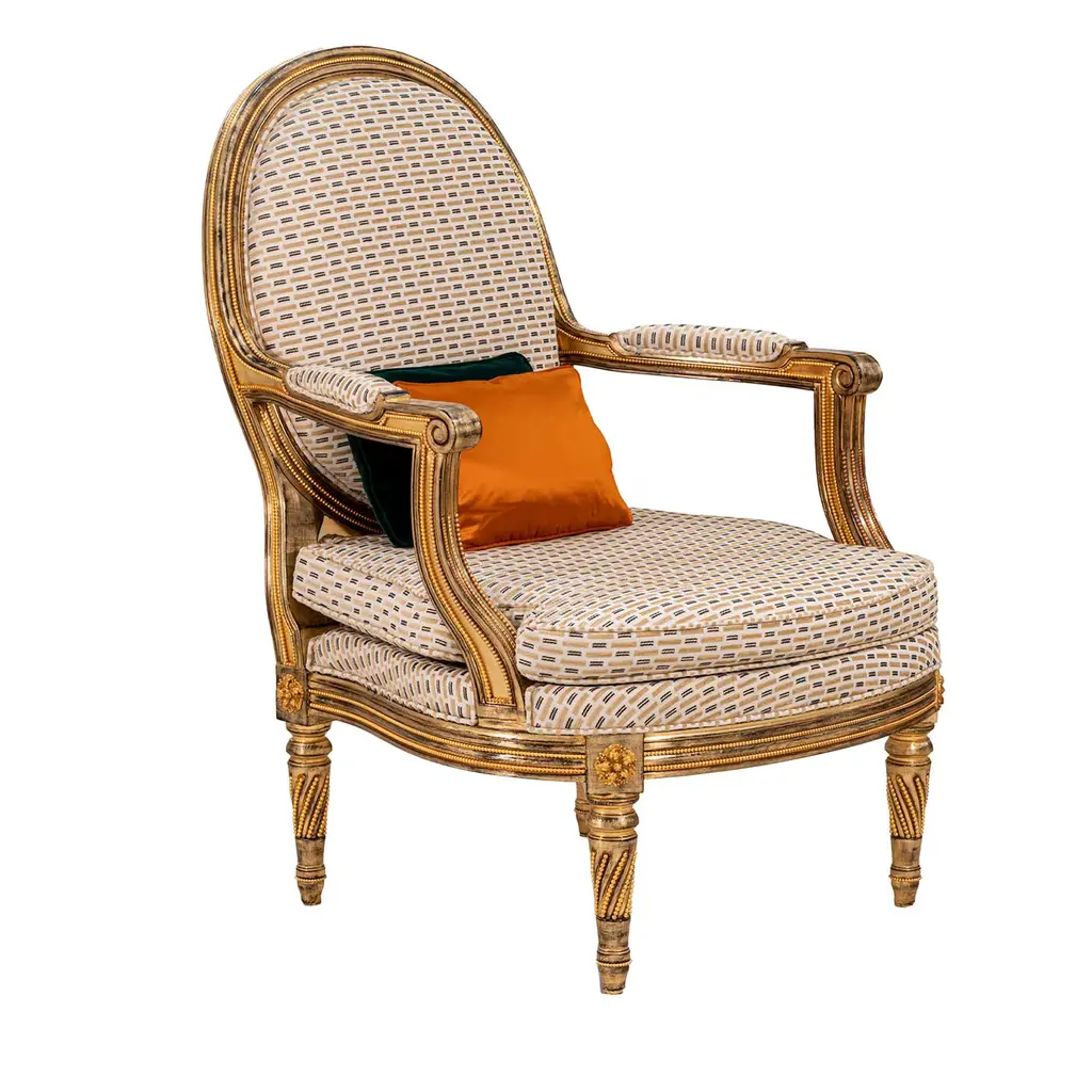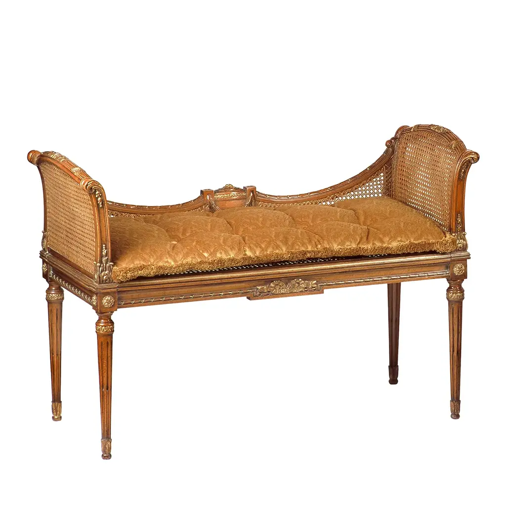 An exquisite piece for a cozy and intimate nook, this loveseat is a flawless reproduction of an authentic Louis XVI design approximately dating to 1774-1793. The richly handcarved beech silhouette is enhanced by a patina-ivory lacquer, a quiet chromatic choice enlivened by the patterned golden fabric covering the cushioned seat, backrest, and armrests.