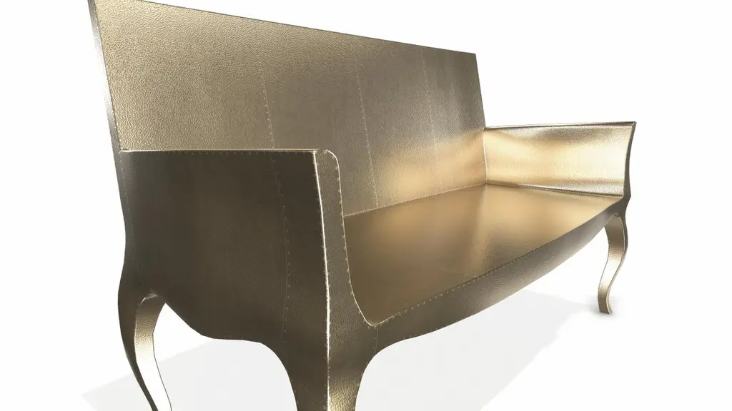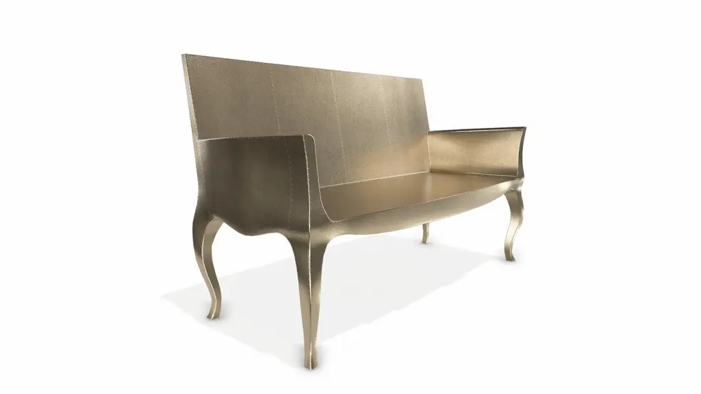 Louise Settee from our Louise Collection. The renowned designer Paul Mathieu chose the name “Louise Console” when he created his more feminine version of Louis XV (1730-1760) furniture. The characteristic cabriole leg, curving outward at the knee and inward towards the foot in an "S" shape was born during this period. It is during the same era that English furniture makers produced the Queen Anne and Chippendale styles.Crafted with utmost care and attention to detail, these Louise Settee are made to order and are available in twelve metal clad finishes, ensuring that you can choose the perfect one to match your individual style and taste. The use of high-quality materials and expert craftsmanship ensure that each Art Deco Louis Card Tables is not only beautiful but also a true piece of Art.The curved legs and side arms of this Art Deco Louise Settee are hand carved from solid pieces of teak. Pattern makers trace and cut complex forms that will cover the chair in a skin of copper, white bronze, brass or antiqued white bronze The metal finishes will tarnish over time. Regular non-abrasive household metal polishes can be used to restore the original luster.Overall, if you're looking for a piece of furniture that combines luxury, comfort, and style, then the Art Deco Louise Settee is an excellent choice. With its distinctive curved profile and multiple finish options, this Chair set is sure to elevate the look of any room it is placed in, and be a beloved addition to your home for years to come.The images shown in this listing are shot in different lighting conditions and/or are 3D illustrations. We encourage our customers to please request a sample or a full sample set of 12 finishes so that they can experience the finish first hand. ouise Settee Art Deco Benches in Fine Hammered Brass by Paul Mathieu for Stephaine OdegardSize- 52"L x 23"W x 33"HMaterials - Brass, Metal sheet, Teak, Wood, MetalTechniques: Hand-Crafted, Hand-Carved, Metal Work, Wood Work, Metal Wrapping, PolishedPlease note that moisture in air, sudden change in temperature and natural movement of wood over time causes the metal to wrinkle or bubble up. We use well seasoned, reclaimed teak and high quality marine grade MDF (wherever technically possible) to avoid and delay the mentioned changes. However a perfect stability of metal cannot be guaranteed. Please note that our smooth finish metal clad pieces will have some unavoidable tool marks. This is proof that everything is done by hand. The smooth finish will not come out like a machine made perfect surface and the master Artisan will do their best to make it look as good/clean/stable/perfect as he possibly can.The antique white bronze finish is hand done by using an acidic chemical over the white bronze finish to recreate a natural patination. Like with the natural patination of silver, copper, or brass, the final result and color uniformity of the patina cannot be guaranteed. The goal of this finish is to achieve rainbow-like shades with dull, shiny, cloudy, and streaky patches to give an illusion of antiquing. Please note:None of our metal clad pieces are treated with a protective “finish” thus enabling the items to age naturally over time. We will of course polish them well before we pack them. a) Copper oxidizes faster than the other metals. In six to twelve months it will most likely lose its shine and will gradually turn to different shades of brown and/or green/blue. This aging process and its effect is referred to as verdigris. After a year the piece should not change much more. Copper does not rust, but does require periodic cleaning in order to retain its original shine if that the preferred option. ('BRASSO' or any known copper polish can be used to polish copper).b) Brass retains its shine for far longer than others, but will tarnish if not cleaned on occasion. ('BRASSO' is made to polish brass).c) White bronze, has the least tendency to show age or tarnish. If kept in a controlled climate, this metal will hold its shine for years. It can be cleaned with a cleanser and polished with a cloth. d) The antiqued white bronze finish will react with the natural elements the fastest in the beginning but it too will stop reacting and will settle down in a stable state like copper after 6-12 months. Since it is already antiqued and looked like it is tarnished, as described in an earlier message, this fast reaction will not change the over all look. In that way this surface is most forgiving. The images shown in this listing are shot in different lighting conditions and/or are 3D illustrations. We encourage our customers to please request a sample or a full sample set of 12 finishes so that they can experience the finish first hand.