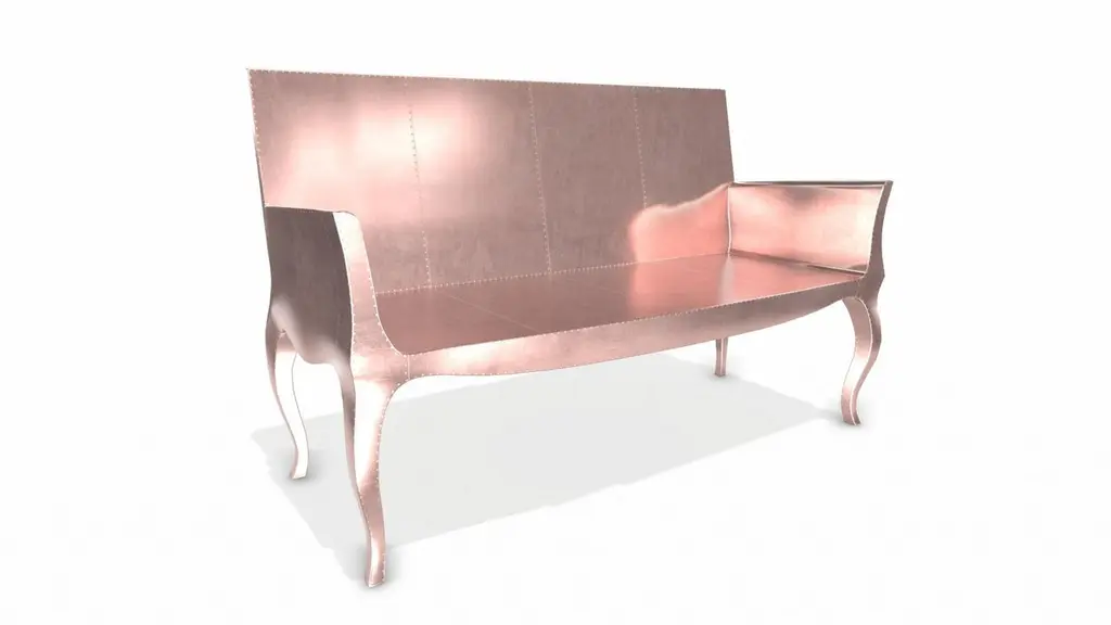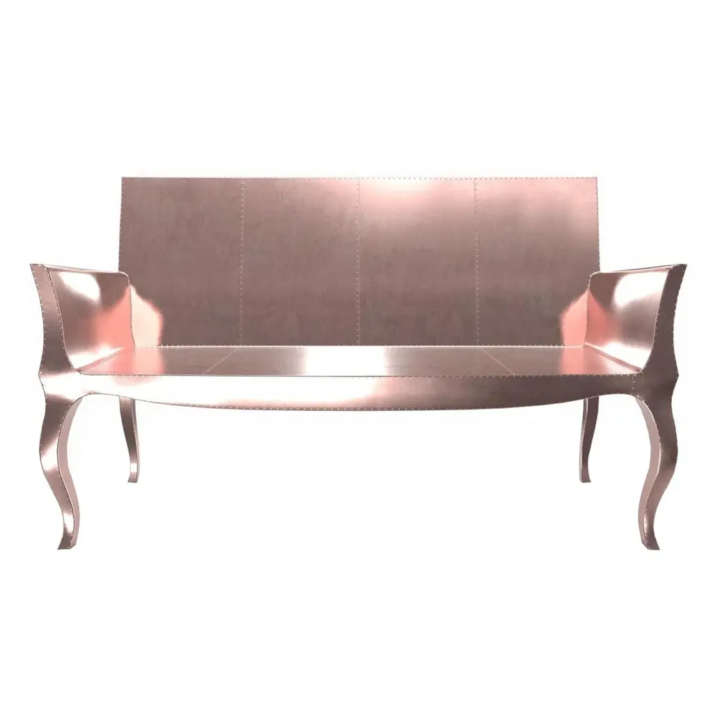 Louise Settee from our Louise Collection. The renowned designer Paul Mathieu chose the name “Louise Console” when he created his more feminine version of Louis XV (1730-1760) furniture. The characteristic cabriole leg, curving outward at the knee and inward towards the foot in an "S" shape was born during this period. It is during the same era that English furniture makers produced the Queen Anne and Chippendale styles.Crafted with utmost care and attention to detail, these Louise Settee are made to order and are available in twelve metal clad finishes, ensuring that you can choose the perfect one to match your individual style and taste. The use of high-quality materials and expert craftsmanship ensure that each Art Deco Louis Card Tables is not only beautiful but also a true piece of Art.The curved legs and side arms of this Art Deco Louise Settee are hand carved from solid pieces of teak. Pattern makers trace and cut complex forms that will cover the chair in a skin of copper, white bronze, brass or antiqued white bronze The metal finishes will tarnish over time. Regular non-abrasive household metal polishes can be used to restore the original luster.Overall, if you're looking for a piece of furniture that combines luxury, comfort, and style, then the Art Deco Louise Settee is an excellent choice. With its distinctive curved profile and multiple finish options, this Chair set is sure to elevate the look of any room it is placed in, and be a beloved addition to your home for years to come.The images shown in this listing are shot in different lighting conditions and/or are 3D illustrations. We encourage our customers to please request a sample or a full sample set of 12 finishes so that they can experience the finish first hand. Louise Settee Art Deco Benches in Smooth Copper by Paul Mathieu for Stephaine OdegardSize- 52"L x 23"W x 33"HMaterials - Copper, Metal sheet, Teak, Wood, MetalTechniques: Hand-Crafted, Hand-Carved, Metal Work, Wood Work, Metal Wrapping, PolishedPlease note that moisture in air, sudden change in temperature and natural movement of wood over time causes the metal to wrinkle or bubble up. We use well seasoned, reclaimed teak and high quality marine grade MDF (wherever technically possible) to avoid and delay the mentioned changes. However a perfect stability of metal cannot be guaranteed. Please note that our smooth finish metal clad pieces will have some unavoidable tool marks. This is proof that everything is done by hand. The smooth finish will not come out like a machine made perfect surface and the master Artisan will do their best to make it look as good/clean/stable/perfect as he possibly can.The antique white bronze finish is hand done by using an acidic chemical over the white bronze finish to recreate a natural patination. Like with the natural patination of silver, copper, or brass, the final result and color uniformity of the patina cannot be guaranteed. The goal of this finish is to achieve rainbow-like shades with dull, shiny, cloudy, and streaky patches to give an illusion of antiquing. Please note:None of our metal clad pieces are treated with a protective “finish” thus enabling the items to age naturally over time. We will of course polish them well before we pack them. a) Copper oxidizes faster than the other metals. In six to twelve months it will most likely lose its shine and will gradually turn to different shades of brown and/or green/blue. This aging process and its effect is referred to as verdigris. After a year the piece should not change much more. Copper does not rust, but does require periodic cleaning in order to retain its original shine if that the preferred option. ('BRASSO' or any known copper polish can be used to polish copper).b) Brass retains its shine for far longer than others, but will tarnish if not cleaned on occasion. ('BRASSO' is made to polish brass).c) White bronze, has the least tendency to show age or tarnish. If kept in a controlled climate, this metal will hold its shine for years. It can be cleaned with a cleanser and polished with a cloth. d) The antiqued white bronze finish will react with the natural elements the fastest in the beginning but it too will stop reacting and will settle down in a stable state like copper after 6-12 months. Since it is already antiqued and looked like it is tarnished, as described in an earlier message, this fast reaction will not change the over all look. In that way this surface is most forgiving. The images shown in this listing are shot in different lighting conditions and/or are 3D illustrations. We encourage our customers to please request a sample or a full sample set of 12 finishes so that they can experience the finish first hand.