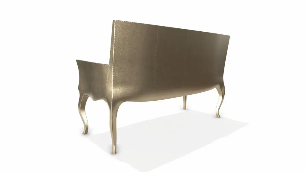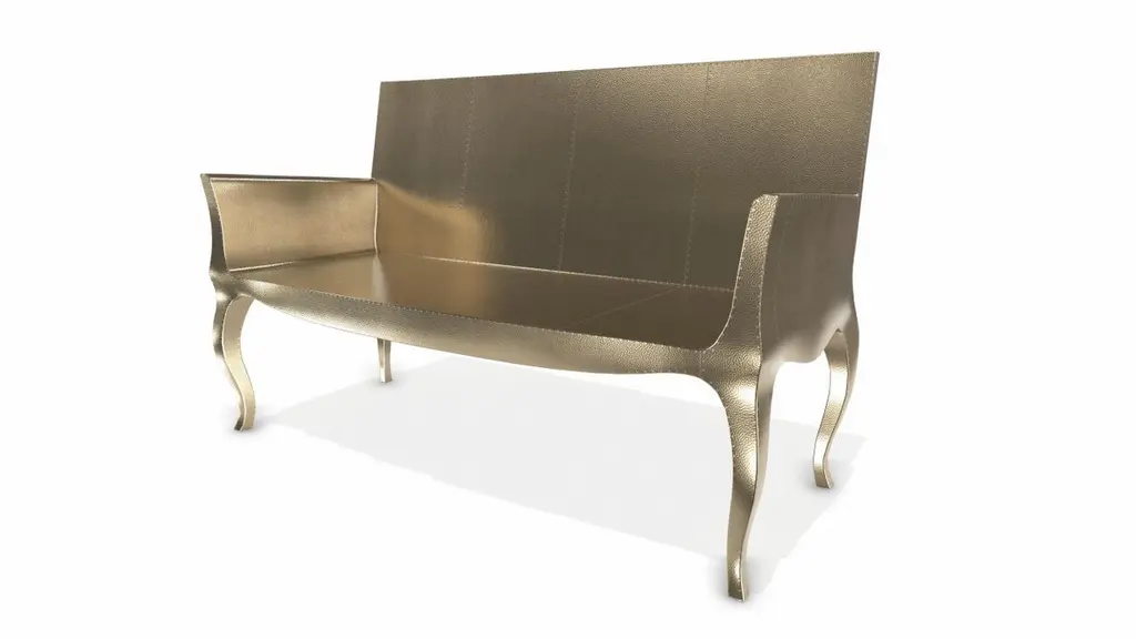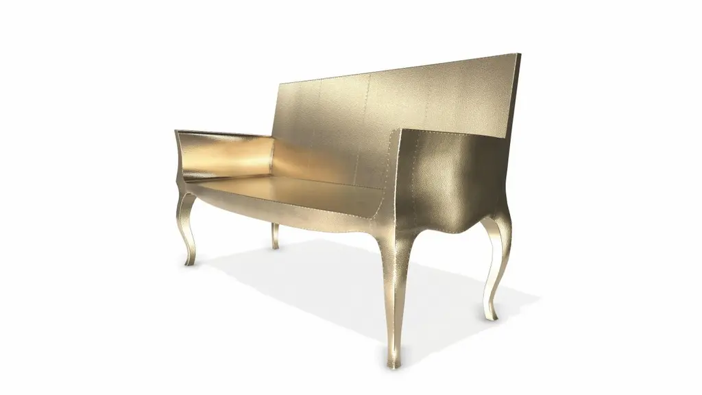 Louise Settee from our Louise Collection. The renowned designer Paul Mathieu chose the name “Louise Console” when he created his more feminine version of Louis XV (1730-1760) furniture. The characteristic cabriole leg, curving outward at the knee and inward towards the foot in an "S" shape was born during this period. It is during the same era that English furniture makers produced the Queen Anne and Chippendale styles.Crafted with utmost care and attention to detail, these Louise Settee are made to order and are available in twelve metal clad finishes, ensuring that you can choose the perfect one to match your individual style and taste. The use of high-quality materials and expert craftsmanship ensure that each Art Deco Louis Card Tables is not only beautiful but also a true piece of Art.The curved legs and side arms of this Art Deco Louise Settee are hand carved from solid pieces of teak. Pattern makers trace and cut complex forms that will cover the chair in a skin of copper, white bronze, brass or antiqued white bronze The metal finishes will tarnish over time. Regular non-abrasive household metal polishes can be used to restore the original luster.Overall, if you're looking for a piece of furniture that combines luxury, comfort, and style, then the Art Deco Louise Settee is an excellent choice. With its distinctive curved profile and multiple finish options, this Chair set is sure to elevate the look of any room it is placed in, and be a beloved addition to your home for years to come.The images shown in this listing are shot in different lighting conditions and/or are 3D illustrations. We encourage our customers to please request a sample or a full sample set of 12 finishes so that they can experience the finish first hand. Louise Settee Art Deco Canapes in Mid. Hammered Brass by Paul Mathieu for Stephaine OdegardSize- 52"L x 23"W x 33"HMaterials - Brass, Metal sheet, Teak, Wood, MetalTechniques: Hand-Crafted, Hand-Carved, Metal Work, Wood Work, Metal Wrapping, PolishedPlease note that moisture in air, sudden change in temperature and natural movement of wood over time causes the metal to wrinkle or bubble up. We use well seasoned, reclaimed teak and high quality marine grade MDF (wherever technically possible) to avoid and delay the mentioned changes. However a perfect stability of metal cannot be guaranteed. Please note that our smooth finish metal clad pieces will have some unavoidable tool marks. This is proof that everything is done by hand. The smooth finish will not come out like a machine made perfect surface and the master Artisan will do their best to make it look as good/clean/stable/perfect as he possibly can.The antique white bronze finish is hand done by using an acidic chemical over the white bronze finish to recreate a natural patination. Like with the natural patination of silver, copper, or brass, the final result and color uniformity of the patina cannot be guaranteed. The goal of this finish is to achieve rainbow-like shades with dull, shiny, cloudy, and streaky patches to give an illusion of antiquing. Please note:None of our metal clad pieces are treated with a protective “finish” thus enabling the items to age naturally over time. We will of course polish them well before we pack them. a) Copper oxidizes faster than the other metals. In six to twelve months it will most likely lose its shine and will gradually turn to different shades of brown and/or green/blue. This aging process and its effect is referred to as verdigris. After a year the piece should not change much more. Copper does not rust, but does require periodic cleaning in order to retain its original shine if that the preferred option. ('BRASSO' or any known copper polish can be used to polish copper).b) Brass retains its shine for far longer than others, but will tarnish if not cleaned on occasion. ('BRASSO' is made to polish brass).c) White bronze, has the least tendency to show age or tarnish. If kept in a controlled climate, this metal will hold its shine for years. It can be cleaned with a cleanser and polished with a cloth. d) The antiqued white bronze finish will react with the natural elements the fastest in the beginning but it too will stop reacting and will settle down in a stable state like copper after 6-12 months. Since it is already antiqued and looked like it is tarnished, as described in an earlier message, this fast reaction will not change the over all look. In that way this surface is most forgiving. The images shown in this listing are shot in different lighting conditions and/or are 3D illustrations. We encourage our customers to please request a sample or a full sample set of 12 finishes so that they can experience the finish first hand.