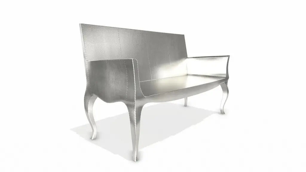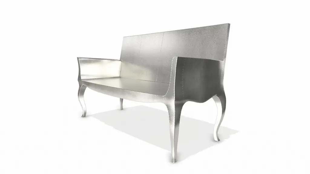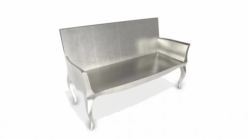 Louise Settee from our Louise Collection. The renowned designer Paul Mathieu chose the name “Louise Console” when he created his more feminine version of Louis XV (1730-1760) furniture. The characteristic cabriole leg, curving outward at the knee and inward towards the foot in an "S" shape was born during this period. It is during the same era that English furniture makers produced the Queen Anne and Chippendale styles.Crafted with utmost care and attention to detail, these Louise Settee are made to order and are available in twelve metal clad finishes, ensuring that you can choose the perfect one to match your individual style and taste. The use of high-quality materials and expert craftsmanship ensure that each Art Deco Louis Card Tables is not only beautiful but also a true piece of Art.The curved legs and side arms of this Art Deco Louise Settee are hand carved from solid pieces of teak. Pattern makers trace and cut complex forms that will cover the chair in a skin of copper, white bronze, brass or antiqued white bronze The metal finishes will tarnish over time. Regular non-abrasive household metal polishes can be used to restore the original luster.Overall, if you're looking for a piece of furniture that combines luxury, comfort, and style, then the Art Deco Louise Settee is an excellent choice. With its distinctive curved profile and multiple finish options, this Chair set is sure to elevate the look of any room it is placed in, and be a beloved addition to your home for years to come.The images shown in this listing are shot in different lighting conditions and/or are 3D illustrations. We encourage our customers to please request a sample or a full sample set of 12 finishes so that they can experience the finish first hand. LLouise Settee Art Deco Canapes in Mid. Hammered White Bronze by Paul Mathieu for Stephaine OdegardSize- 52"L x 23"W x 33"HMaterials - White Bronze, Metal sheet, Teak, Wood, MetalTechniques: Hand-Crafted, Hand-Carved, Metal Work, Wood Work, Metal Wrapping, PolishedPlease note that moisture in air, sudden change in temperature and natural movement of wood over time causes the metal to wrinkle or bubble up. We use well seasoned, reclaimed teak and high quality marine grade MDF (wherever technically possible) to avoid and delay the mentioned changes. However a perfect stability of metal cannot be guaranteed. Please note that our smooth finish metal clad pieces will have some unavoidable tool marks. This is proof that everything is done by hand. The smooth finish will not come out like a machine made perfect surface and the master Artisan will do their best to make it look as good/clean/stable/perfect as he possibly can.The antique white bronze finish is hand done by using an acidic chemical over the white bronze finish to recreate a natural patination. Like with the natural patination of silver, copper, or brass, the final result and color uniformity of the patina cannot be guaranteed. The goal of this finish is to achieve rainbow-like shades with dull, shiny, cloudy, and streaky patches to give an illusion of antiquing. Please note:None of our metal clad pieces are treated with a protective “finish” thus enabling the items to age naturally over time. We will of course polish them well before we pack them. a) Copper oxidizes faster than the other metals. In six to twelve months it will most likely lose its shine and will gradually turn to different shades of brown and/or green/blue. This aging process and its effect is referred to as verdigris. After a year the piece should not change much more. Copper does not rust, but does require periodic cleaning in order to retain its original shine if that the preferred option. ('BRASSO' or any known copper polish can be used to polish copper).b) Brass retains its shine for far longer than others, but will tarnish if not cleaned on occasion. ('BRASSO' is made to polish brass).c) White bronze, has the least tendency to show age or tarnish. If kept in a controlled climate, this metal will hold its shine for years. It can be cleaned with a cleanser and polished with a cloth. d) The antiqued white bronze finish will react with the natural elements the fastest in the beginning but it too will stop reacting and will settle down in a stable state like copper after 6-12 months. Since it is already antiqued and looked like it is tarnished, as described in an earlier message, this fast reaction will not change the over all look. In that way this surface is most forgiving. The images shown in this listing are shot in different lighting conditions and/or are 3D illustrations. We encourage our customers to please request a sample or a full sample set of 12 finishes so that they can experience the finish first hand.