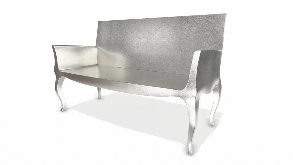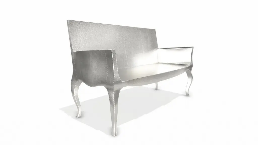 Louise Settee from our Louise Collection. The renowned designer Paul Mathieu chose the name “Louise Console” when he created his more feminine version of Louis XV (1730-1760) furniture. The characteristic cabriole leg, curving outward at the knee and inward towards the foot in an "S" shape was born during this period. It is during the same era that English furniture makers produced the Queen Anne and Chippendale styles.Crafted with utmost care and attention to detail, these Louise Settee are made to order and are available in twelve metal clad finishes, ensuring that you can choose the perfect one to match your individual style and taste. The use of high-quality materials and expert craftsmanship ensure that each Art Deco Louis Card Tables is not only beautiful but also a true piece of Art.The curved legs and side arms of this Art Deco Louise Settee are hand carved from solid pieces of teak. Pattern makers trace and cut complex forms that will cover the chair in a skin of copper, white bronze, brass or antiqued white bronze The metal finishes will tarnish over time. Regular non-abrasive household metal polishes can be used to restore the original luster.Overall, if you're looking for a piece of furniture that combines luxury, comfort, and style, then the Art Deco Louise Settee is an excellent choice. With its distinctive curved profile and multiple finish options, this Chair set is sure to elevate the look of any room it is placed in, and be a beloved addition to your home for years to come.The images shown in this listing are shot in different lighting conditions and/or are 3D illustrations. We encourage our customers to please request a sample or a full sample set of 12 finishes so that they can experience the finish first hand. Louise Settee Art Deco Chaise Longues in Fine Hammered White Bronze by Paul Mathieu for Stephaine OdegardSize- 52"L x 23"W x 33"HMaterials - White Bronze, Metal sheet, Teak, Wood, MetalTechniques: Hand-Crafted, Hand-Carved, Metal Work, Wood Work, Metal Wrapping, PolishedPlease note that moisture in air, sudden change in temperature and natural movement of wood over time causes the metal to wrinkle or bubble up. We use well seasoned, reclaimed teak and high quality marine grade MDF (wherever technically possible) to avoid and delay the mentioned changes. However a perfect stability of metal cannot be guaranteed. Please note that our smooth finish metal clad pieces will have some unavoidable tool marks. This is proof that everything is done by hand. The smooth finish will not come out like a machine made perfect surface and the master Artisan will do their best to make it look as good/clean/stable/perfect as he possibly can.The antique white bronze finish is hand done by using an acidic chemical over the white bronze finish to recreate a natural patination. Like with the natural patination of silver, copper, or brass, the final result and color uniformity of the patina cannot be guaranteed. The goal of this finish is to achieve rainbow-like shades with dull, shiny, cloudy, and streaky patches to give an illusion of antiquing. Please note:None of our metal clad pieces are treated with a protective “finish” thus enabling the items to age naturally over time. We will of course polish them well before we pack them. a) Copper oxidizes faster than the other metals. In six to twelve months it will most likely lose its shine and will gradually turn to different shades of brown and/or green/blue. This aging process and its effect is referred to as verdigris. After a year the piece should not change much more. Copper does not rust, but does require periodic cleaning in order to retain its original shine if that the preferred option. ('BRASSO' or any known copper polish can be used to polish copper).b) Brass retains its shine for far longer than others, but will tarnish if not cleaned on occasion. ('BRASSO' is made to polish brass).c) White bronze, has the least tendency to show age or tarnish. If kept in a controlled climate, this metal will hold its shine for years. It can be cleaned with a cleanser and polished with a cloth. d) The antiqued white bronze finish will react with the natural elements the fastest in the beginning but it too will stop reacting and will settle down in a stable state like copper after 6-12 months. Since it is already antiqued and looked like it is tarnished, as described in an earlier message, this fast reaction will not change the over all look. In that way this surface is most forgiving. The images shown in this listing are shot in different lighting conditions and/or are 3D illustrations. We encourage our customers to please request a sample or a full sample set of 12 finishes so that they can experience the finish first hand.