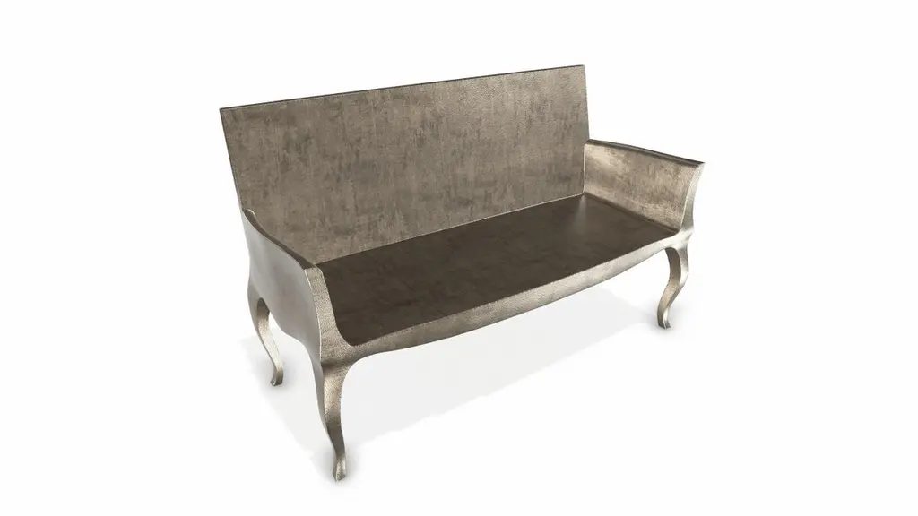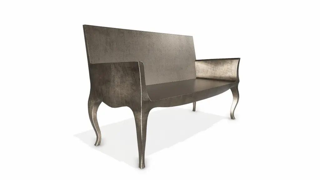 Louise Settee from our Louise Collection. The renowned designer Paul Mathieu chose the name “Louise Console” when he created his more feminine version of Louis XV (1730-1760) furniture. The characteristic cabriole leg, curving outward at the knee and inward towards the foot in an "S" shape was born during this period. It is during the same era that English furniture makers produced the Queen Anne and Chippendale styles.Crafted with utmost care and attention to detail, these Louise Settee are made to order and are available in twelve metal clad finishes, ensuring that you can choose the perfect one to match your individual style and taste. The use of high-quality materials and expert craftsmanship ensure that each Art Deco Louis Card Tables is not only beautiful but also a true piece of Art.The curved legs and side arms of this Art Deco Louise Settee are hand carved from solid pieces of teak. Pattern makers trace and cut complex forms that will cover the chair in a skin of copper, white bronze, brass or antiqued white bronze The metal finishes will tarnish over time. Regular non-abrasive household metal polishes can be used to restore the original luster.Overall, if you're looking for a piece of furniture that combines luxury, comfort, and style, then the Art Deco Louise Settee is an excellent choice. With its distinctive curved profile and multiple finish options, this Chair set is sure to elevate the look of any room it is placed in, and be a beloved addition to your home for years to come.The images shown in this listing are shot in different lighting conditions and/or are 3D illustrations. We encourage our customers to please request a sample or a full sample set of 12 finishes so that they can experience the finish first hand. Louise Settee Art Deco Chaise Longues in Mid. Hammered Antique Bronze by Paul Mathieu for Stephaine OdegardSize- 52"L x 23"W x 33"HMaterials - Antique Bronze, Metal sheet, Teak, Wood, MetalTechniques: Hand-Crafted, Hand-Carved, Metal Work, Wood Work, Metal Wrapping, PolishedPlease note that moisture in air, sudden change in temperature and natural movement of wood over time causes the metal to wrinkle or bubble up. We use well seasoned, reclaimed teak and high quality marine grade MDF (wherever technically possible) to avoid and delay the mentioned changes. However a perfect stability of metal cannot be guaranteed. Please note that our smooth finish metal clad pieces will have some unavoidable tool marks. This is proof that everything is done by hand. The smooth finish will not come out like a machine made perfect surface and the master Artisan will do their best to make it look as good/clean/stable/perfect as he possibly can.The antique white bronze finish is hand done by using an acidic chemical over the white bronze finish to recreate a natural patination. Like with the natural patination of silver, copper, or brass, the final result and color uniformity of the patina cannot be guaranteed. The goal of this finish is to achieve rainbow-like shades with dull, shiny, cloudy, and streaky patches to give an illusion of antiquing. Please note:None of our metal clad pieces are treated with a protective “finish” thus enabling the items to age naturally over time. We will of course polish them well before we pack them. a) Copper oxidizes faster than the other metals. In six to twelve months it will most likely lose its shine and will gradually turn to different shades of brown and/or green/blue. This aging process and its effect is referred to as verdigris. After a year the piece should not change much more. Copper does not rust, but does require periodic cleaning in order to retain its original shine if that the preferred option. ('BRASSO' or any known copper polish can be used to polish copper).b) Brass retains its shine for far longer than others, but will tarnish if not cleaned on occasion. ('BRASSO' is made to polish brass).c) White bronze, has the least tendency to show age or tarnish. If kept in a controlled climate, this metal will hold its shine for years. It can be cleaned with a cleanser and polished with a cloth. d) The antiqued white bronze finish will react with the natural elements the fastest in the beginning but it too will stop reacting and will settle down in a stable state like copper after 6-12 months. Since it is already antiqued and looked like it is tarnished, as described in an earlier message, this fast reaction will not change the over all look. In that way this surface is most forgiving. The images shown in this listing are shot in different lighting conditions and/or are 3D illustrations. We encourage our customers to please request a sample or a full sample set of 12 finishes so that they can experience the finish first hand.
