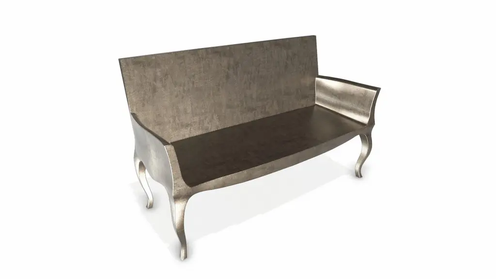 Louise Settee from our Louise Collection. The renowned designer Paul Mathieu chose the name “Louise Console” when he created his more feminine version of Louis XV (1730-1760) furniture. The characteristic cabriole leg, curving outward at the knee and inward towards the foot in an "S" shape was born during this period. It is during the same era that English furniture makers produced the Queen Anne and Chippendale styles.Crafted with utmost care and attention to detail, these Louise Settee are made to order and are available in twelve metal clad finishes, ensuring that you can choose the perfect one to match your individual style and taste. The use of high-quality materials and expert craftsmanship ensure that each Art Deco Louis Card Tables is not only beautiful but also a true piece of Art.The curved legs and side arms of this Art Deco Louise Settee are hand carved from solid pieces of teak. Pattern makers trace and cut complex forms that will cover the chair in a skin of copper, white bronze, brass or antiqued white bronze The metal finishes will tarnish over time. Regular non-abrasive household metal polishes can be used to restore the original luster.Overall, if you're looking for a piece of furniture that combines luxury, comfort, and style, then the Art Deco Louise Settee is an excellent choice. With its distinctive curved profile and multiple finish options, this Chair set is sure to elevate the look of any room it is placed in, and be a beloved addition to your home for years to come.The images shown in this listing are shot in different lighting conditions and/or are 3D illustrations. We encourage our customers to please request a sample or a full sample set of 12 finishes so that they can experience the finish first hand. Louise Settee Art Deco Daybeds in Fine Hammered Antique Bronze by Paul MathieuSize- 52"L x 23"W x 33"HMaterials - Antique Bronze, Metal sheet, Teak, Wood, MetalTechniques: Hand-Crafted, Hand-Carved, Metal Work, Wood Work, Metal Wrapping, PolishedPlease note that moisture in air, sudden change in temperature and natural movement of wood over time causes the metal to wrinkle or bubble up. We use well seasoned, reclaimed teak and high quality marine grade MDF (wherever technically possible) to avoid and delay the mentioned changes. However a perfect stability of metal cannot be guaranteed. Please note that our smooth finish metal clad pieces will have some unavoidable tool marks. This is proof that everything is done by hand. The smooth finish will not come out like a machine made perfect surface and the master Artisan will do their best to make it look as good/clean/stable/perfect as he possibly can.The antique white bronze finish is hand done by using an acidic chemical over the white bronze finish to recreate a natural patination. Like with the natural patination of silver, copper, or brass, the final result and color uniformity of the patina cannot be guaranteed. The goal of this finish is to achieve rainbow-like shades with dull, shiny, cloudy, and streaky patches to give an illusion of antiquing. Please note:None of our metal clad pieces are treated with a protective “finish” thus enabling the items to age naturally over time. We will of course polish them well before we pack them. a) Copper oxidizes faster than the other metals. In six to twelve months it will most likely lose its shine and will gradually turn to different shades of brown and/or green/blue. This aging process and its effect is referred to as verdigris. After a year the piece should not change much more. Copper does not rust, but does require periodic cleaning in order to retain its original shine if that the preferred option. ('BRASSO' or any known copper polish can be used to polish copper).b) Brass retains its shine for far longer than others, but will tarnish if not cleaned on occasion. ('BRASSO' is made to polish brass).c) White bronze, has the least tendency to show age or tarnish. If kept in a controlled climate, this metal will hold its shine for years. It can be cleaned with a cleanser and polished with a cloth. d) The antiqued white bronze finish will react with the natural elements the fastest in the beginning but it too will stop reacting and will settle down in a stable state like copper after 6-12 months. Since it is already antiqued and looked like it is tarnished, as described in an earlier message, this fast reaction will not change the over all look. In that way this surface is most forgiving. The images shown in this listing are shot in different lighting conditions and/or are 3D illustrations. We encourage our customers to please request a sample or a full sample set of 12 finishes so that they can experience the finish first hand.