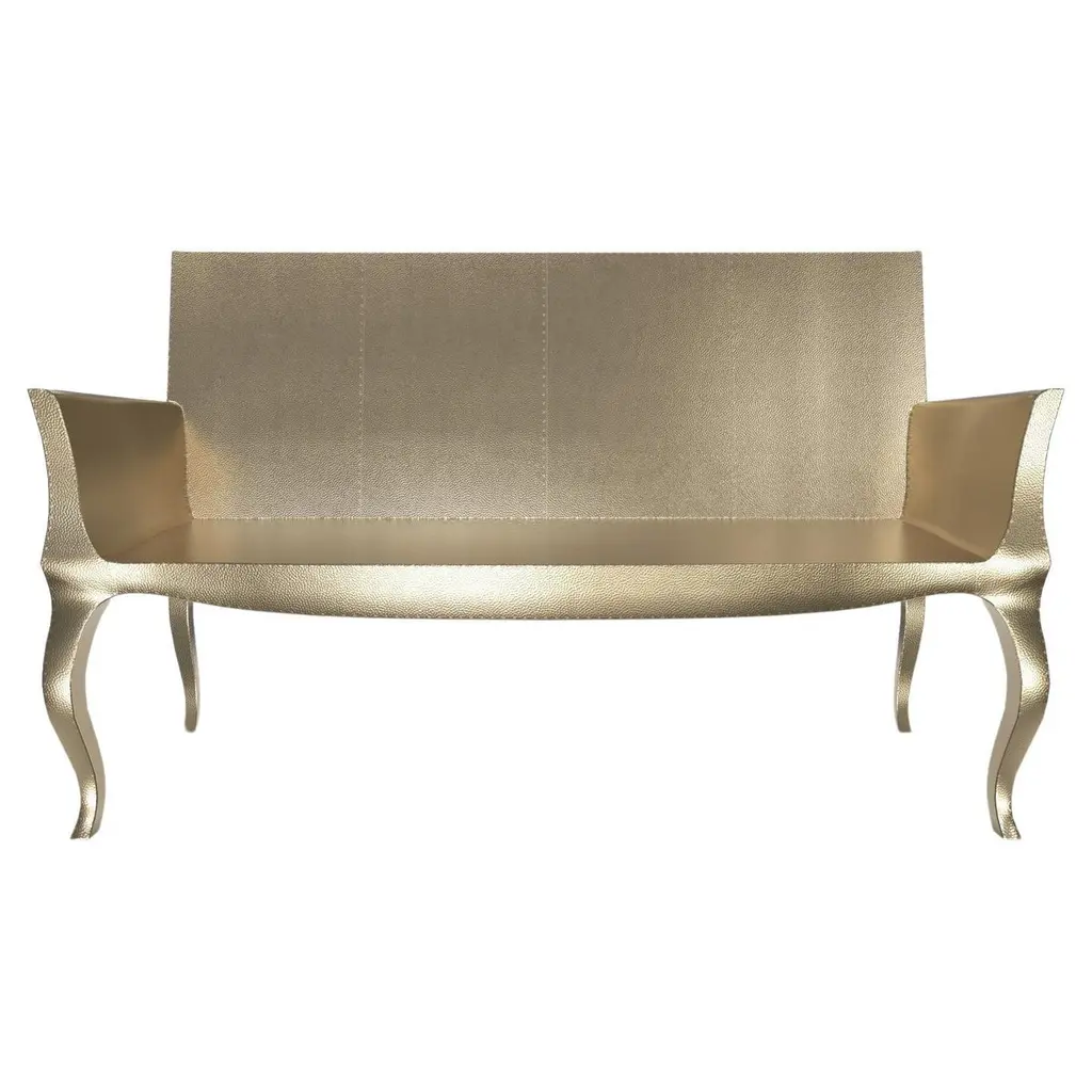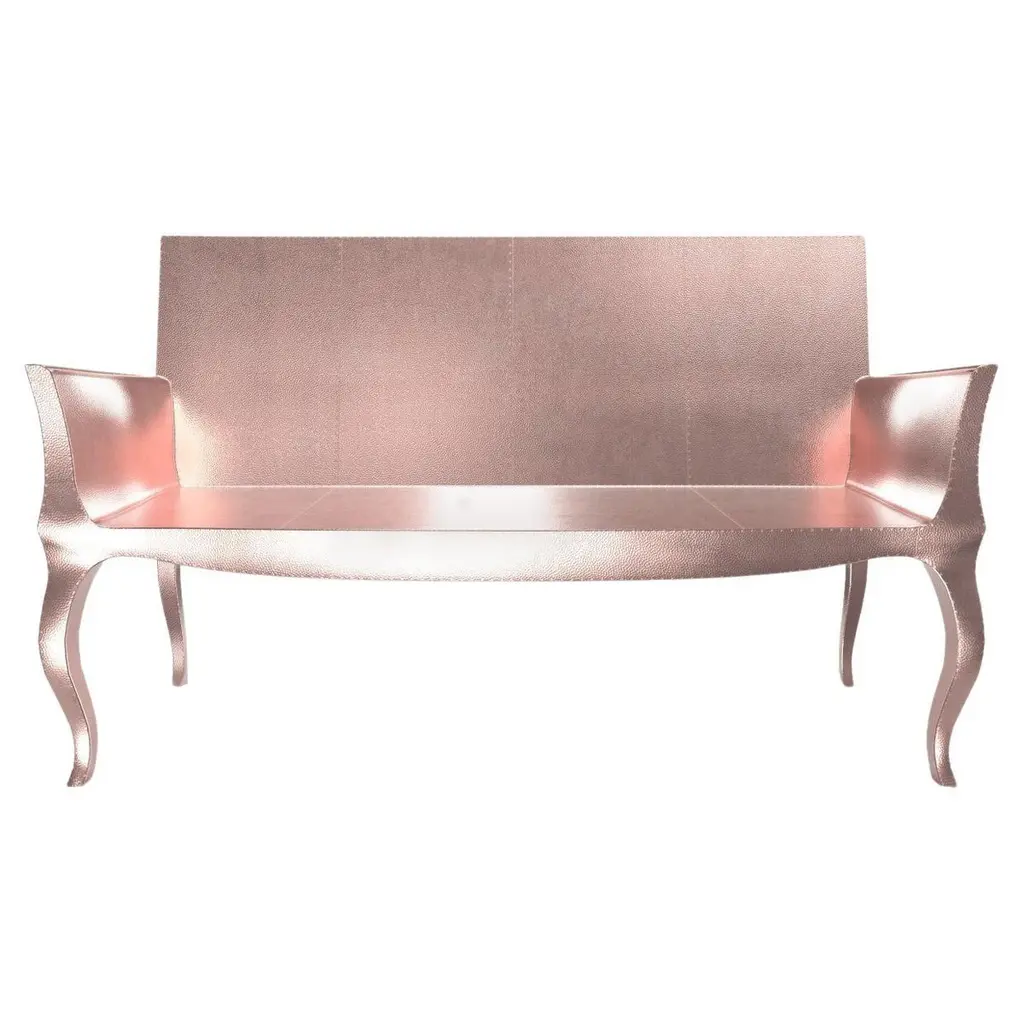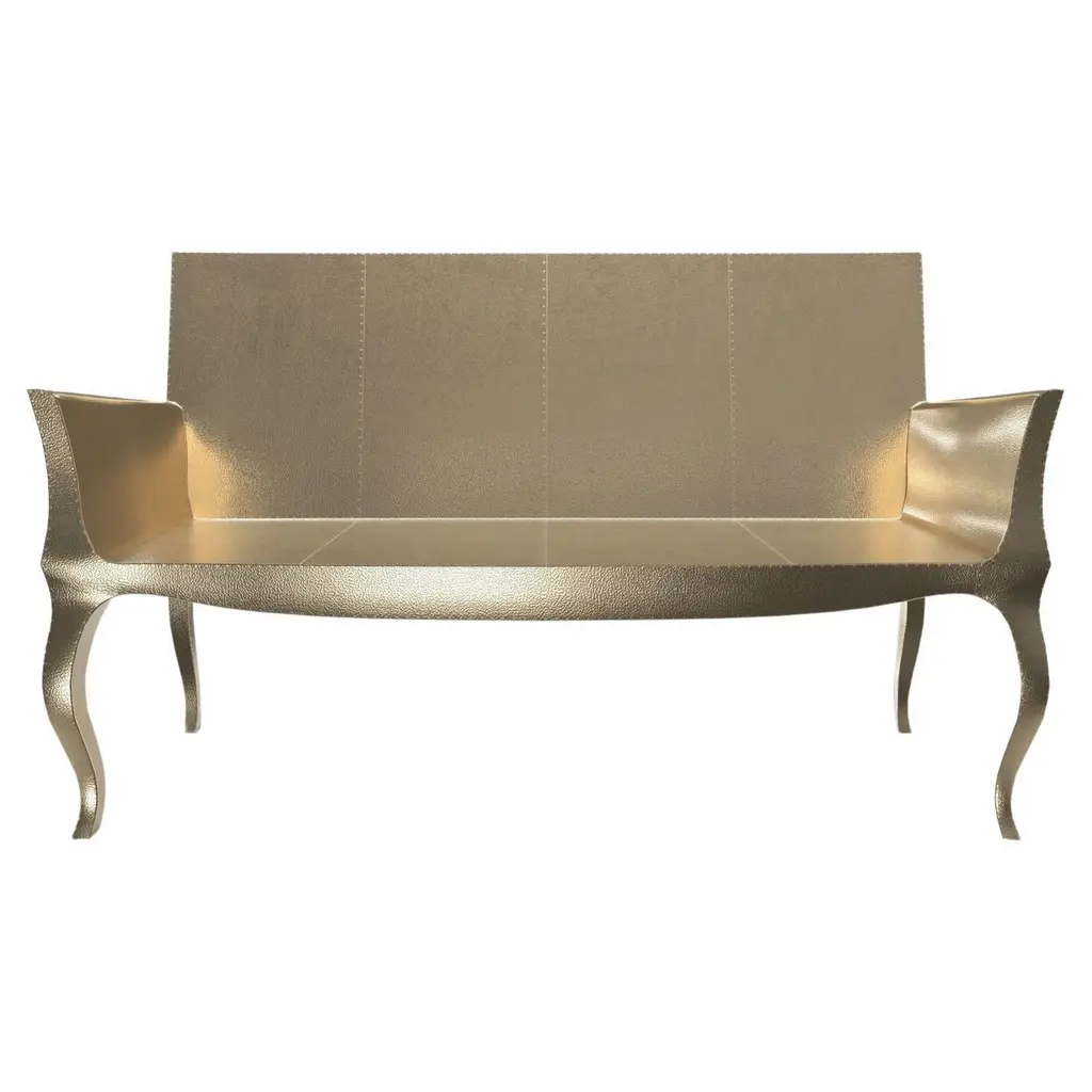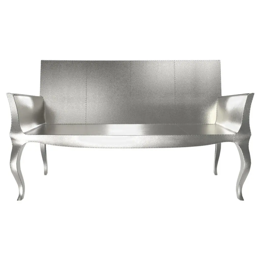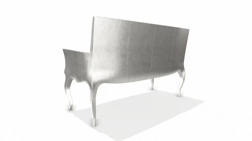 Louise Settee from our Louise Collection. The renowned designer Paul Mathieu chose the name “Louise Console” when he created his more feminine version of Louis XV (1730-1760) furniture. The characteristic cabriole leg, curving outward at the knee and inward towards the foot in an "S" shape was born during this period. It is during the same era that English furniture makers produced the Queen Anne and Chippendale styles.Crafted with utmost care and attention to detail, these Louise Settee are made to order and are available in twelve metal clad finishes, ensuring that you can choose the perfect one to match your individual style and taste. The use of high-quality materials and expert craftsmanship ensure that each Art Deco Louis Card Tables is not only beautiful but also a true piece of Art.The curved legs and side arms of this Art Deco Louise Settee are hand carved from solid pieces of teak. Pattern makers trace and cut complex forms that will cover the chair in a skin of copper, white bronze, brass or antiqued white bronze The metal finishes will tarnish over time. Regular non-abrasive household metal polishes can be used to restore the original luster.Overall, if you're looking for a piece of furniture that combines luxury, comfort, and style, then the Art Deco Louise Settee is an excellent choice. With its distinctive curved profile and multiple finish options, this Chair set is sure to elevate the look of any room it is placed in, and be a beloved addition to your home for years to come.The images shown in this listing are shot in different lighting conditions and/or are 3D illustrations. We encourage our customers to please request a sample or a full sample set of 12 finishes so that they can experience the finish first hand. Louise Settee Art Deco Daybeds in Fine Hammered White Bronze by Paul Mathieu for Stephaine OdegardSize- 52"L x 23"W x 33"HMaterials - White Bronze, Metal sheet, Teak, Wood, MetalTechniques: Hand-Crafted, Hand-Carved, Metal Work, Wood Work, Metal Wrapping, PolishedPlease note that moisture in air, sudden change in temperature and natural movement of wood over time causes the metal to wrinkle or bubble up. We use well seasoned, reclaimed teak and high quality marine grade MDF (wherever technically possible) to avoid and delay the mentioned changes. However a perfect stability of metal cannot be guaranteed. Please note that our smooth finish metal clad pieces will have some unavoidable tool marks. This is proof that everything is done by hand. The smooth finish will not come out like a machine made perfect surface and the master Artisan will do their best to make it look as good/clean/stable/perfect as he possibly can.The antique white bronze finish is hand done by using an acidic chemical over the white bronze finish to recreate a natural patination. Like with the natural patination of silver, copper, or brass, the final result and color uniformity of the patina cannot be guaranteed. The goal of this finish is to achieve rainbow-like shades with dull, shiny, cloudy, and streaky patches to give an illusion of antiquing. Please note:None of our metal clad pieces are treated with a protective “finish” thus enabling the items to age naturally over time. We will of course polish them well before we pack them. a) Copper oxidizes faster than the other metals. In six to twelve months it will most likely lose its shine and will gradually turn to different shades of brown and/or green/blue. This aging process and its effect is referred to as verdigris. After a year the piece should not change much more. Copper does not rust, but does require periodic cleaning in order to retain its original shine if that the preferred option. ('BRASSO' or any known copper polish can be used to polish copper).b) Brass retains its shine for far longer than others, but will tarnish if not cleaned on occasion. ('BRASSO' is made to polish brass).c) White bronze, has the least tendency to show age or tarnish. If kept in a controlled climate, this metal will hold its shine for years. It can be cleaned with a cleanser and polished with a cloth. d) The antiqued white bronze finish will react with the natural elements the fastest in the beginning but it too will stop reacting and will settle down in a stable state like copper after 6-12 months. Since it is already antiqued and looked like it is tarnished, as described in an earlier message, this fast reaction will not change the over all look. In that way this surface is most forgiving. The images shown in this listing are shot in different lighting conditions and/or are 3D illustrations. We encourage our customers to please request a sample or a full sample set of 12 finishes so that they can experience the finish first hand.