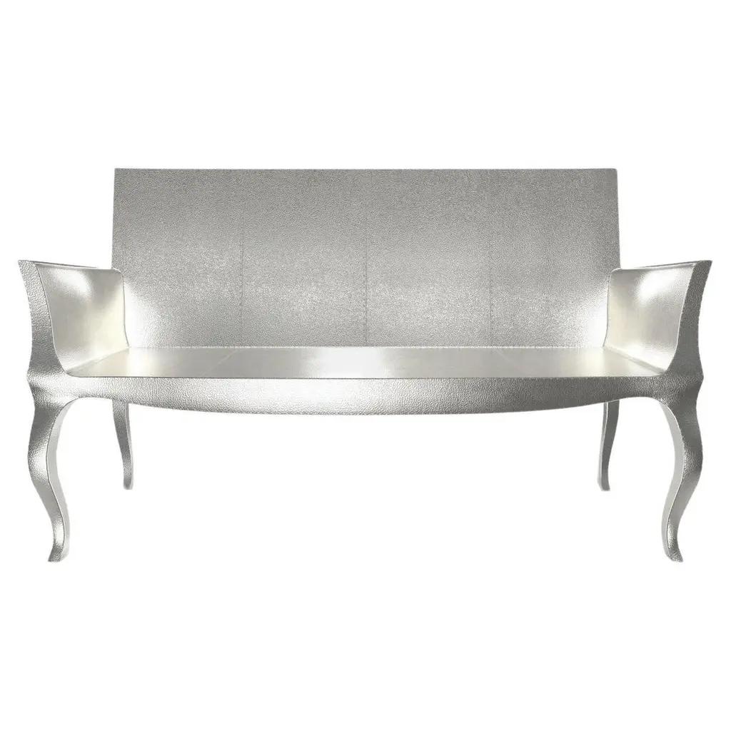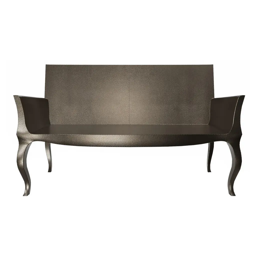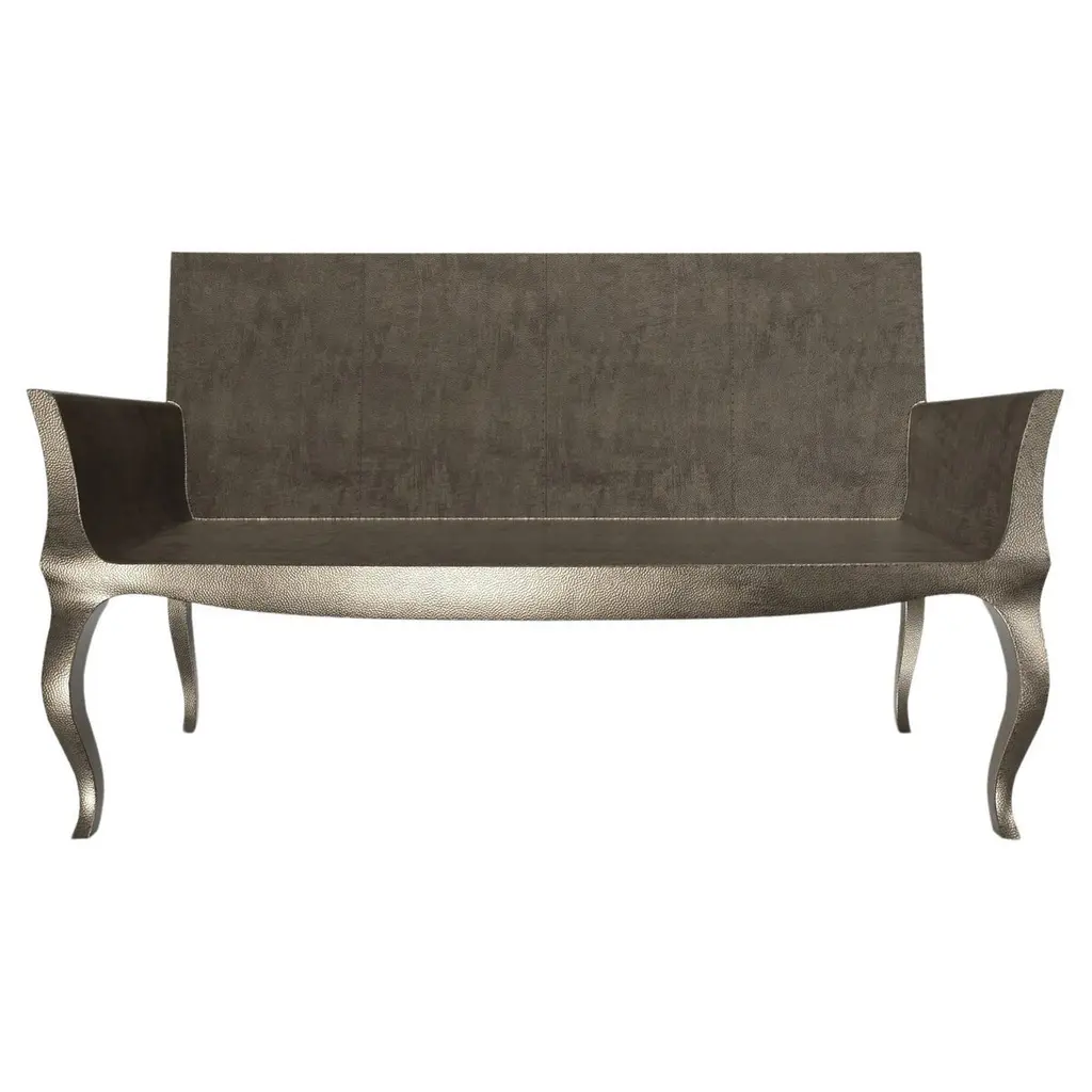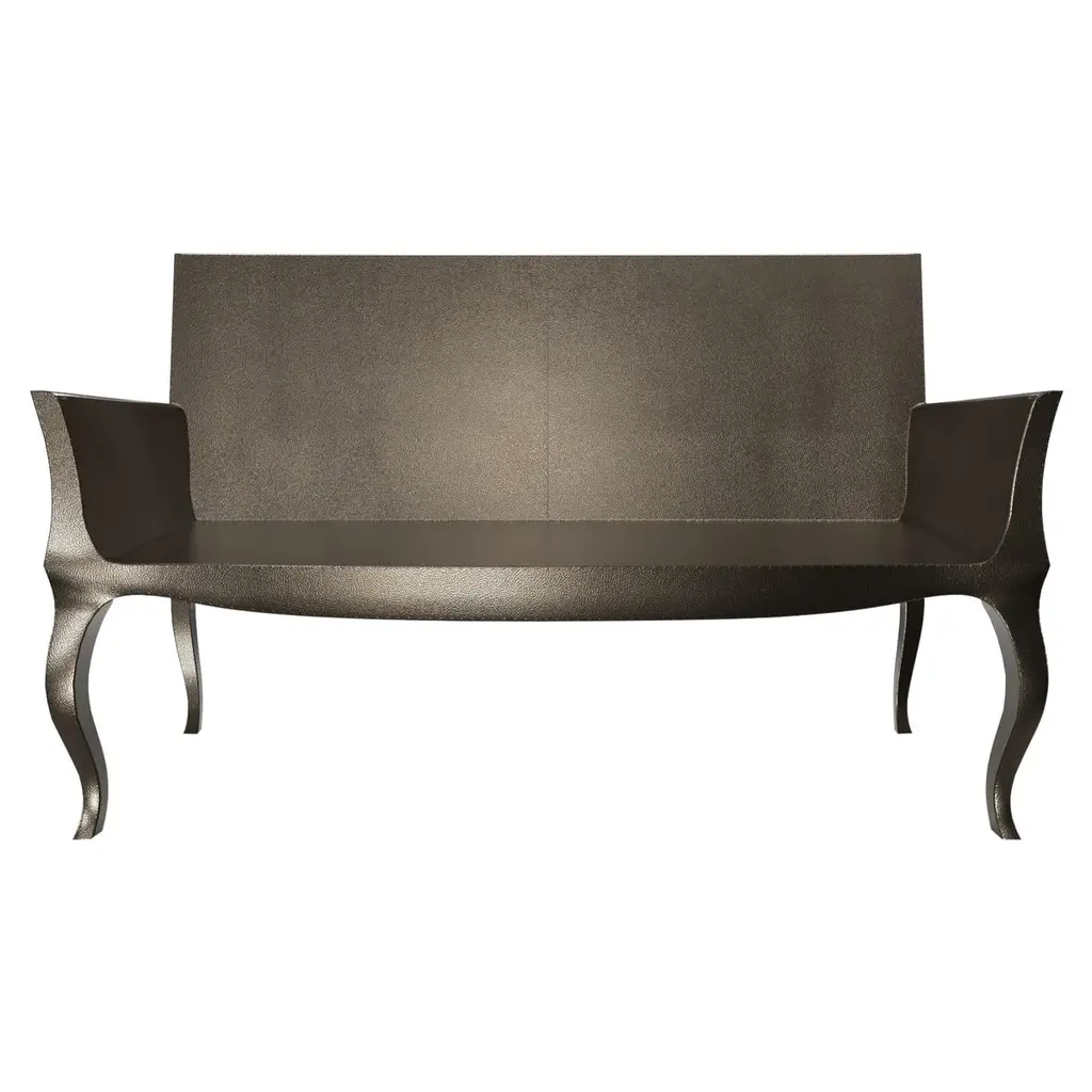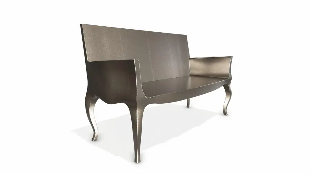 Louise Settee from our Louise Collection. The renowned designer Paul Mathieu chose the name “Louise Console” when he created his more feminine version of Louis XV (1730-1760) furniture. The characteristic cabriole leg, curving outward at the knee and inward towards the foot in an "S" shape was born during this period. It is during the same era that English furniture makers produced the Queen Anne and Chippendale styles.Crafted with utmost care and attention to detail, these Louise Settee are made to order and are available in twelve metal clad finishes, ensuring that you can choose the perfect one to match your individual style and taste. The use of high-quality materials and expert craftsmanship ensure that each Art Deco Louis Card Tables is not only beautiful but also a true piece of Art.The curved legs and side arms of this Art Deco Louise Settee are hand carved from solid pieces of teak. Pattern makers trace and cut complex forms that will cover the chair in a skin of copper, white bronze, brass or antiqued white bronze The metal finishes will tarnish over time. Regular non-abrasive household metal polishes can be used to restore the original luster.Overall, if you're looking for a piece of furniture that combines luxury, comfort, and style, then the Art Deco Louise Settee is an excellent choice. With its distinctive curved profile and multiple finish options, this Chair set is sure to elevate the look of any room it is placed in, and be a beloved addition to your home for years to come.The images shown in this listing are shot in different lighting conditions and/or are 3D illustrations. We encourage our customers to please request a sample or a full sample set of 12 finishes so that they can experience the finish first hand. Louise Settee Art Deco Living Room Sets in Fine Hammered Antique Bronze by Paul MathieuSize- 52"L x 23"W x 33"HMaterials - Antique Bronze, Metal sheet, Teak, Wood, MetalTechniques: Hand-Crafted, Hand-Carved, Metal Work, Wood Work, Metal Wrapping, PolishedPlease note that moisture in air, sudden change in temperature and natural movement of wood over time causes the metal to wrinkle or bubble up. We use well seasoned, reclaimed teak and high quality marine grade MDF (wherever technically possible) to avoid and delay the mentioned changes. However a perfect stability of metal cannot be guaranteed. Please note that our smooth finish metal clad pieces will have some unavoidable tool marks. This is proof that everything is done by hand. The smooth finish will not come out like a machine made perfect surface and the master Artisan will do their best to make it look as good/clean/stable/perfect as he possibly can.The antique white bronze finish is hand done by using an acidic chemical over the white bronze finish to recreate a natural patination. Like with the natural patination of silver, copper, or brass, the final result and color uniformity of the patina cannot be guaranteed. The goal of this finish is to achieve rainbow-like shades with dull, shiny, cloudy, and streaky patches to give an illusion of antiquing. Please note:None of our metal clad pieces are treated with a protective “finish” thus enabling the items to age naturally over time. We will of course polish them well before we pack them. a) Copper oxidizes faster than the other metals. In six to twelve months it will most likely lose its shine and will gradually turn to different shades of brown and/or green/blue. This aging process and its effect is referred to as verdigris. After a year the piece should not change much more. Copper does not rust, but does require periodic cleaning in order to retain its original shine if that the preferred option. ('BRASSO' or any known copper polish can be used to polish copper).b) Brass retains its shine for far longer than others, but will tarnish if not cleaned on occasion. ('BRASSO' is made to polish brass).c) White bronze, has the least tendency to show age or tarnish. If kept in a controlled climate, this metal will hold its shine for years. It can be cleaned with a cleanser and polished with a cloth. d) The antiqued white bronze finish will react with the natural elements the fastest in the beginning but it too will stop reacting and will settle down in a stable state like copper after 6-12 months. Since it is already antiqued and looked like it is tarnished, as described in an earlier message, this fast reaction will not change the over all look. In that way this surface is most forgiving. The images shown in this listing are shot in different lighting conditions and/or are 3D illustrations. We encourage our customers to please request a sample or a full sample set of 12 finishes so that they can experience the finish first hand.