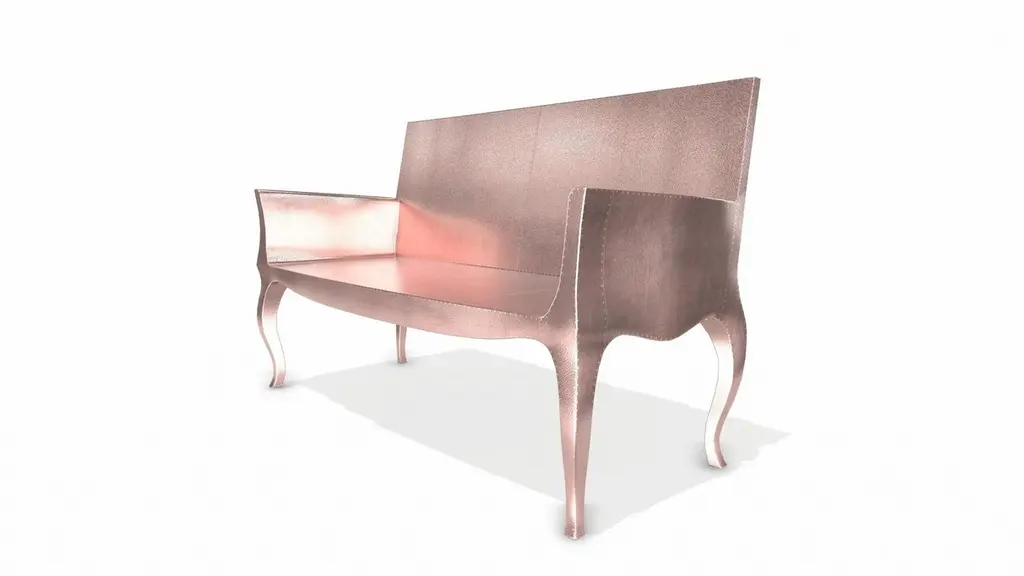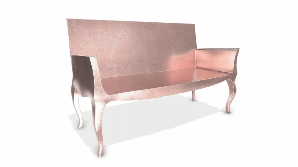 Louise Settee from our Louise Collection. The renowned designer Paul Mathieu chose the name “Louise Console” when he created his more feminine version of Louis XV (1730-1760) furniture. The characteristic cabriole leg, curving outward at the knee and inward towards the foot in an "S" shape was born during this period. It is during the same era that English furniture makers produced the Queen Anne and Chippendale styles.Crafted with utmost care and attention to detail, these Louise Settee are made to order and are available in twelve metal clad finishes, ensuring that you can choose the perfect one to match your individual style and taste. The use of high-quality materials and expert craftsmanship ensure that each Art Deco Louis Card Tables is not only beautiful but also a true piece of Art.The curved legs and side arms of this Art Deco Louise Settee are hand carved from solid pieces of teak. Pattern makers trace and cut complex forms that will cover the chair in a skin of copper, white bronze, brass or antiqued white bronze The metal finishes will tarnish over time. Regular non-abrasive household metal polishes can be used to restore the original luster.Overall, if you're looking for a piece of furniture that combines luxury, comfort, and style, then the Art Deco Louise Settee is an excellent choice. With its distinctive curved profile and multiple finish options, this Chair set is sure to elevate the look of any room it is placed in, and be a beloved addition to your home for years to come.The images shown in this listing are shot in different lighting conditions and/or are 3D illustrations. We encourage our customers to please request a sample or a full sample set of 12 finishes so that they can experience the finish first hand. Louise Settee Art Deco Living Room Sets in Fine Hammered Copper by Paul Mathieu for Stephaine OdegardSize- 52"L x 23"W x 33"HMaterials - Copper, Metal sheet, Teak, Wood, MetalTechniques: Hand-Crafted, Hand-Carved, Metal Work, Wood Work, Metal Wrapping, PolishedPlease note that moisture in air, sudden change in temperature and natural movement of wood over time causes the metal to wrinkle or bubble up. We use well seasoned, reclaimed teak and high quality marine grade MDF (wherever technically possible) to avoid and delay the mentioned changes. However a perfect stability of metal cannot be guaranteed. Please note that our smooth finish metal clad pieces will have some unavoidable tool marks. This is proof that everything is done by hand. The smooth finish will not come out like a machine made perfect surface and the master Artisan will do their best to make it look as good/clean/stable/perfect as he possibly can.The antique white bronze finish is hand done by using an acidic chemical over the white bronze finish to recreate a natural patination. Like with the natural patination of silver, copper, or brass, the final result and color uniformity of the patina cannot be guaranteed. The goal of this finish is to achieve rainbow-like shades with dull, shiny, cloudy, and streaky patches to give an illusion of antiquing. Please note:None of our metal clad pieces are treated with a protective “finish” thus enabling the items to age naturally over time. We will of course polish them well before we pack them. a) Copper oxidizes faster than the other metals. In six to twelve months it will most likely lose its shine and will gradually turn to different shades of brown and/or green/blue. This aging process and its effect is referred to as verdigris. After a year the piece should not change much more. Copper does not rust, but does require periodic cleaning in order to retain its original shine if that the preferred option. ('BRASSO' or any known copper polish can be used to polish copper).b) Brass retains its shine for far longer than others, but will tarnish if not cleaned on occasion. ('BRASSO' is made to polish brass).c) White bronze, has the least tendency to show age or tarnish. If kept in a controlled climate, this metal will hold its shine for years. It can be cleaned with a cleanser and polished with a cloth. d) The antiqued white bronze finish will react with the natural elements the fastest in the beginning but it too will stop reacting and will settle down in a stable state like copper after 6-12 months. Since it is already antiqued and looked like it is tarnished, as described in an earlier message, this fast reaction will not change the over all look. In that way this surface is most forgiving. The images shown in this listing are shot in different lighting conditions and/or are 3D illustrations. We encourage our customers to please request a sample or a full sample set of 12 finishes so that they can experience the finish first hand.