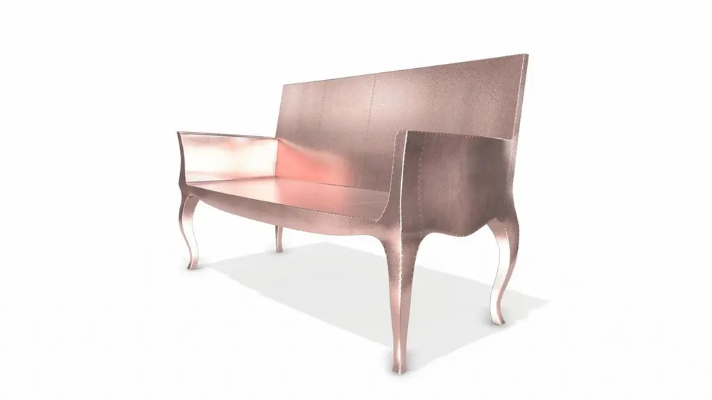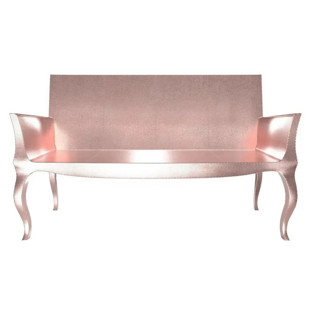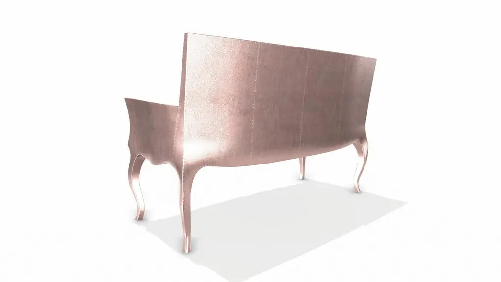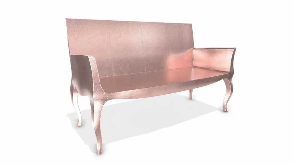 Louise Settee from our Louise Collection. The renowned designer Paul Mathieu chose the name “Louise Console” when he created his more feminine version of Louis XV (1730-1760) furniture. The characteristic cabriole leg, curving outward at the knee and inward towards the foot in an "S" shape was born during this period. It is during the same era that English furniture makers produced the Queen Anne and Chippendale styles.Crafted with utmost care and attention to detail, these Louise Settee are made to order and are available in twelve metal clad finishes, ensuring that you can choose the perfect one to match your individual style and taste. The use of high-quality materials and expert craftsmanship ensure that each Art Deco Louis Card Tables is not only beautiful but also a true piece of Art.The curved legs and side arms of this Art Deco Louise Settee are hand carved from solid pieces of teak. Pattern makers trace and cut complex forms that will cover the chair in a skin of copper, white bronze, brass or antiqued white bronze The metal finishes will tarnish over time. Regular non-abrasive household metal polishes can be used to restore the original luster.Overall, if you're looking for a piece of furniture that combines luxury, comfort, and style, then the Art Deco Louise Settee is an excellent choice. With its distinctive curved profile and multiple finish options, this Chair set is sure to elevate the look of any room it is placed in, and be a beloved addition to your home for years to come.The images shown in this listing are shot in different lighting conditions and/or are 3D illustrations. We encourage our customers to please request a sample or a full sample set of 12 finishes so that they can experience the finish first hand. Louise Settee Art Deco Living Room Sets in Mid. Hammered Copper by Paul Mathieu for Stephaine OdegardSize- 52"L x 23"W x 33"HMaterials - Copper, Metal sheet, Teak, Wood, MetalTechniques: Hand-Crafted, Hand-Carved, Metal Work, Wood Work, Metal Wrapping, PolishedPlease note that moisture in air, sudden change in temperature and natural movement of wood over time causes the metal to wrinkle or bubble up. We use well seasoned, reclaimed teak and high quality marine grade MDF (wherever technically possible) to avoid and delay the mentioned changes. However a perfect stability of metal cannot be guaranteed. Please note that our smooth finish metal clad pieces will have some unavoidable tool marks. This is proof that everything is done by hand. The smooth finish will not come out like a machine made perfect surface and the master Artisan will do their best to make it look as good/clean/stable/perfect as he possibly can.The antique white bronze finish is hand done by using an acidic chemical over the white bronze finish to recreate a natural patination. Like with the natural patination of silver, copper, or brass, the final result and color uniformity of the patina cannot be guaranteed. The goal of this finish is to achieve rainbow-like shades with dull, shiny, cloudy, and streaky patches to give an illusion of antiquing. Please note:None of our metal clad pieces are treated with a protective “finish” thus enabling the items to age naturally over time. We will of course polish them well before we pack them. a) Copper oxidizes faster than the other metals. In six to twelve months it will most likely lose its shine and will gradually turn to different shades of brown and/or green/blue. This aging process and its effect is referred to as verdigris. After a year the piece should not change much more. Copper does not rust, but does require periodic cleaning in order to retain its original shine if that the preferred option. ('BRASSO' or any known copper polish can be used to polish copper).b) Brass retains its shine for far longer than others, but will tarnish if not cleaned on occasion. ('BRASSO' is made to polish brass).c) White bronze, has the least tendency to show age or tarnish. If kept in a controlled climate, this metal will hold its shine for years. It can be cleaned with a cleanser and polished with a cloth. d) The antiqued white bronze finish will react with the natural elements the fastest in the beginning but it too will stop reacting and will settle down in a stable state like copper after 6-12 months. Since it is already antiqued and looked like it is tarnished, as described in an earlier message, this fast reaction will not change the over all look. In that way this surface is most forgiving. The images shown in this listing are shot in different lighting conditions and/or are 3D illustrations. We encourage our customers to please request a sample or a full sample set of 12 finishes so that they can experience the finish first hand.