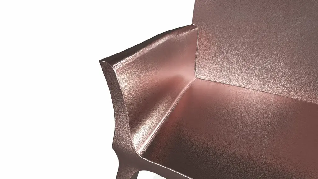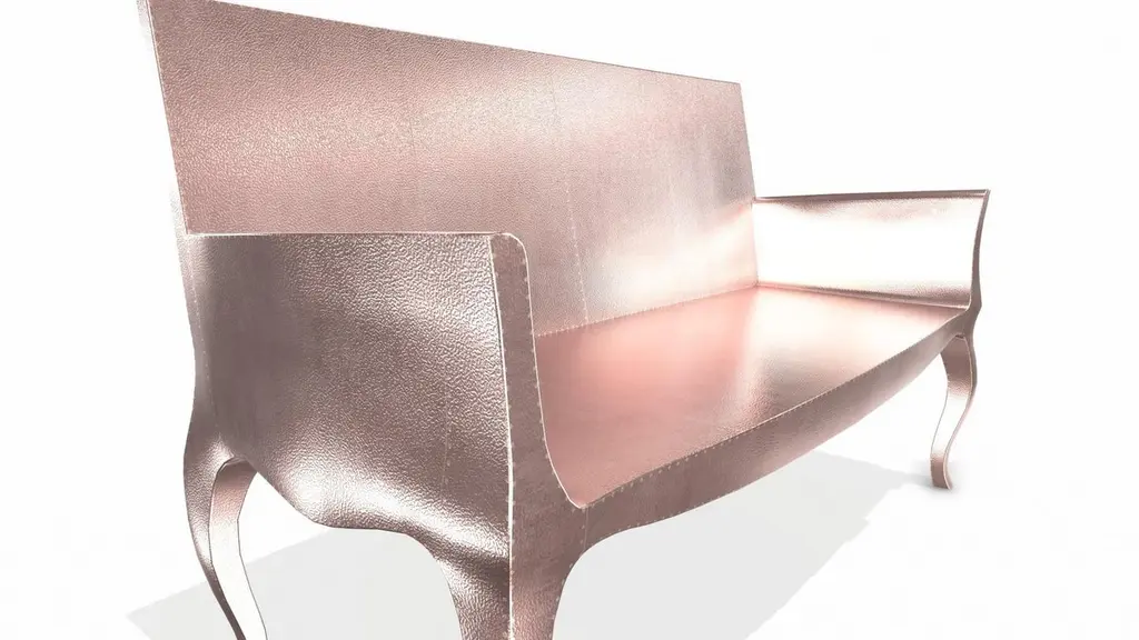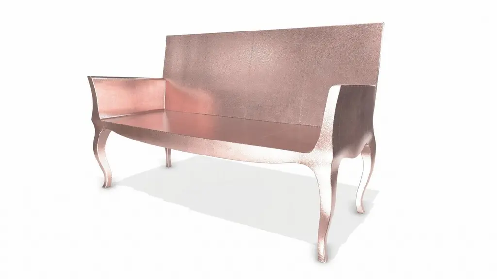 Louise Settee from our Louise Collection. The renowned designer Paul Mathieu chose the name “Louise Console” when he created his more feminine version of Louis XV (1730-1760) furniture. The characteristic cabriole leg, curving outward at the knee and inward towards the foot in an "S" shape was born during this period. It is during the same era that English furniture makers produced the Queen Anne and Chippendale styles.Crafted with utmost care and attention to detail, these Louise Settee are made to order and are available in twelve metal clad finishes, ensuring that you can choose the perfect one to match your individual style and taste. The use of high-quality materials and expert craftsmanship ensure that each Art Deco Louis Card Tables is not only beautiful but also a true piece of Art.The curved legs and side arms of this Art Deco Louise Settee are hand carved from solid pieces of teak. Pattern makers trace and cut complex forms that will cover the chair in a skin of copper, white bronze, brass or antiqued white bronze The metal finishes will tarnish over time. Regular non-abrasive household metal polishes can be used to restore the original luster.Overall, if you're looking for a piece of furniture that combines luxury, comfort, and style, then the Art Deco Louise Settee is an excellent choice. With its distinctive curved profile and multiple finish options, this Chair set is sure to elevate the look of any room it is placed in, and be a beloved addition to your home for years to come.The images shown in this listing are shot in different lighting conditions and/or are 3D illustrations. We encourage our customers to please request a sample or a full sample set of 12 finishes so that they can experience the finish first hand. Louise Settee Art Deco Loveseats in Fine Hammered Copper by Paul Mathieu for Stephaine OdegardSize- 52"L x 23"W x 33"HMaterials - Copper, Metal sheet, Teak, Wood, MetalTechniques: Hand-Crafted, Hand-Carved, Metal Work, Wood Work, Metal Wrapping, PolishedPlease note that moisture in air, sudden change in temperature and natural movement of wood over time causes the metal to wrinkle or bubble up. We use well seasoned, reclaimed teak and high quality marine grade MDF (wherever technically possible) to avoid and delay the mentioned changes. However a perfect stability of metal cannot be guaranteed. Please note that our smooth finish metal clad pieces will have some unavoidable tool marks. This is proof that everything is done by hand. The smooth finish will not come out like a machine made perfect surface and the master Artisan will do their best to make it look as good/clean/stable/perfect as he possibly can.The antique white bronze finish is hand done by using an acidic chemical over the white bronze finish to recreate a natural patination. Like with the natural patination of silver, copper, or brass, the final result and color uniformity of the patina cannot be guaranteed. The goal of this finish is to achieve rainbow-like shades with dull, shiny, cloudy, and streaky patches to give an illusion of antiquing. Please note:None of our metal clad pieces are treated with a protective “finish” thus enabling the items to age naturally over time. We will of course polish them well before we pack them. a) Copper oxidizes faster than the other metals. In six to twelve months it will most likely lose its shine and will gradually turn to different shades of brown and/or green/blue. This aging process and its effect is referred to as verdigris. After a year the piece should not change much more. Copper does not rust, but does require periodic cleaning in order to retain its original shine if that the preferred option. ('BRASSO' or any known copper polish can be used to polish copper).b) Brass retains its shine for far longer than others, but will tarnish if not cleaned on occasion. ('BRASSO' is made to polish brass).c) White bronze, has the least tendency to show age or tarnish. If kept in a controlled climate, this metal will hold its shine for years. It can be cleaned with a cleanser and polished with a cloth. d) The antiqued white bronze finish will react with the natural elements the fastest in the beginning but it too will stop reacting and will settle down in a stable state like copper after 6-12 months. Since it is already antiqued and looked like it is tarnished, as described in an earlier message, this fast reaction will not change the over all look. In that way this surface is most forgiving. The images shown in this listing are shot in different lighting conditions and/or are 3D illustrations. We encourage our customers to please request a sample or a full sample set of 12 finishes so that they can experience the finish first hand.