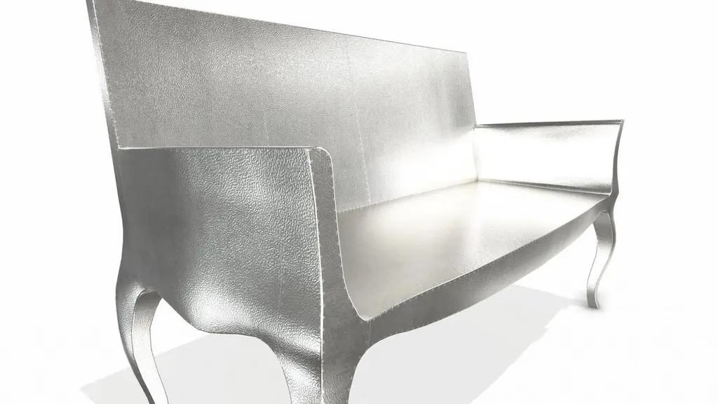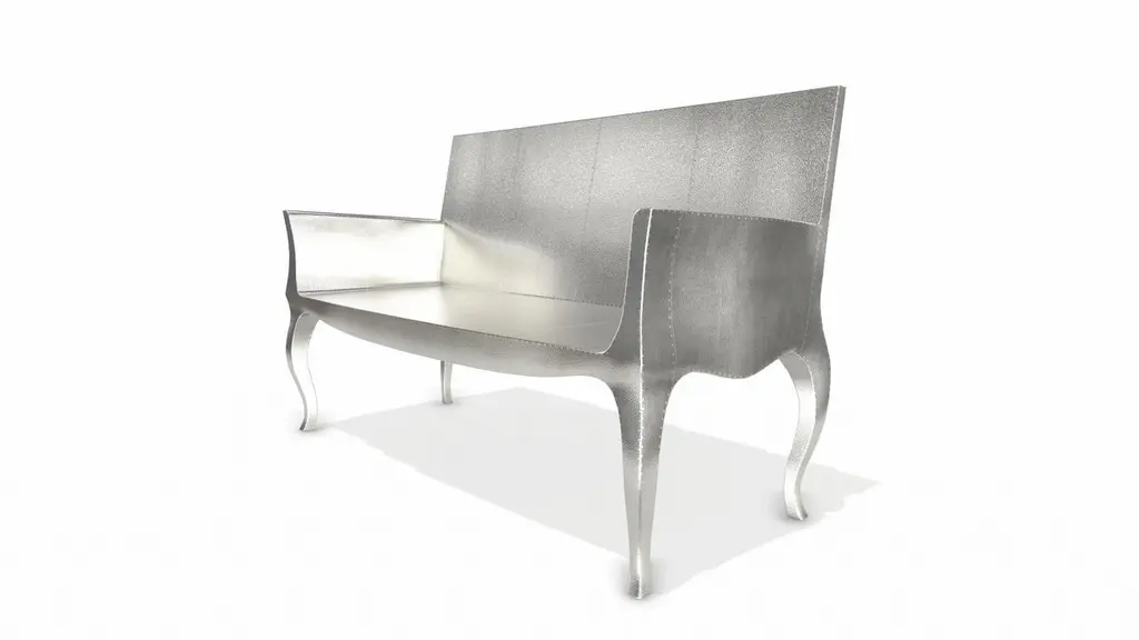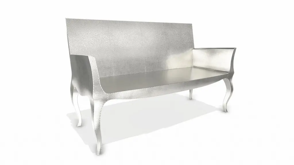 Louise Settee from our Louise Collection. The renowned designer Paul Mathieu chose the name “Louise Console” when he created his more feminine version of Louis XV (1730-1760) furniture. The characteristic cabriole leg, curving outward at the knee and inward towards the foot in an "S" shape was born during this period. It is during the same era that English furniture makers produced the Queen Anne and Chippendale styles.Crafted with utmost care and attention to detail, these Louise Settee are made to order and are available in twelve metal clad finishes, ensuring that you can choose the perfect one to match your individual style and taste. The use of high-quality materials and expert craftsmanship ensure that each Art Deco Louis Card Tables is not only beautiful but also a true piece of Art.The curved legs and side arms of this Art Deco Louise Settee are hand carved from solid pieces of teak. Pattern makers trace and cut complex forms that will cover the chair in a skin of copper, white bronze, brass or antiqued white bronze The metal finishes will tarnish over time. Regular non-abrasive household metal polishes can be used to restore the original luster.Overall, if you're looking for a piece of furniture that combines luxury, comfort, and style, then the Art Deco Louise Settee is an excellent choice. With its distinctive curved profile and multiple finish options, this Chair set is sure to elevate the look of any room it is placed in, and be a beloved addition to your home for years to come.The images shown in this listing are shot in different lighting conditions and/or are 3D illustrations. We encourage our customers to please request a sample or a full sample set of 12 finishes so that they can experience the finish first hand. Louise Settee Art Deco Loveseats in Fine Hammered White Bronze by Paul Mathieu for Stephaine OdegardSize- 52"L x 23"W x 33"HMaterials - White Bronze, Metal sheet, Teak, Wood, MetalTechniques: Hand-Crafted, Hand-Carved, Metal Work, Wood Work, Metal Wrapping, PolishedPlease note that moisture in air, sudden change in temperature and natural movement of wood over time causes the metal to wrinkle or bubble up. We use well seasoned, reclaimed teak and high quality marine grade MDF (wherever technically possible) to avoid and delay the mentioned changes. However a perfect stability of metal cannot be guaranteed. Please note that our smooth finish metal clad pieces will have some unavoidable tool marks. This is proof that everything is done by hand. The smooth finish will not come out like a machine made perfect surface and the master Artisan will do their best to make it look as good/clean/stable/perfect as he possibly can.The antique white bronze finish is hand done by using an acidic chemical over the white bronze finish to recreate a natural patination. Like with the natural patination of silver, copper, or brass, the final result and color uniformity of the patina cannot be guaranteed. The goal of this finish is to achieve rainbow-like shades with dull, shiny, cloudy, and streaky patches to give an illusion of antiquing. Please note:None of our metal clad pieces are treated with a protective “finish” thus enabling the items to age naturally over time. We will of course polish them well before we pack them. a) Copper oxidizes faster than the other metals. In six to twelve months it will most likely lose its shine and will gradually turn to different shades of brown and/or green/blue. This aging process and its effect is referred to as verdigris. After a year the piece should not change much more. Copper does not rust, but does require periodic cleaning in order to retain its original shine if that the preferred option. ('BRASSO' or any known copper polish can be used to polish copper).b) Brass retains its shine for far longer than others, but will tarnish if not cleaned on occasion. ('BRASSO' is made to polish brass).c) White bronze, has the least tendency to show age or tarnish. If kept in a controlled climate, this metal will hold its shine for years. It can be cleaned with a cleanser and polished with a cloth. d) The antiqued white bronze finish will react with the natural elements the fastest in the beginning but it too will stop reacting and will settle down in a stable state like copper after 6-12 months. Since it is already antiqued and looked like it is tarnished, as described in an earlier message, this fast reaction will not change the over all look. In that way this surface is most forgiving. The images shown in this listing are shot in different lighting conditions and/or are 3D illustrations. We encourage our customers to please request a sample or a full sample set of 12 finishes so that they can experience the finish first hand.