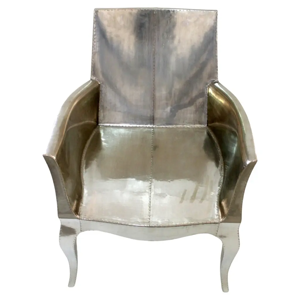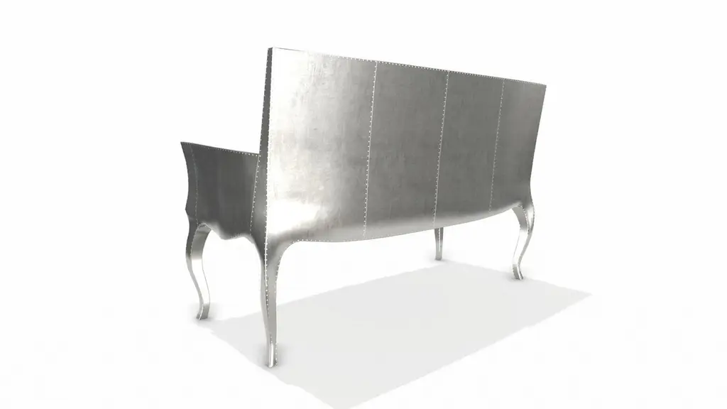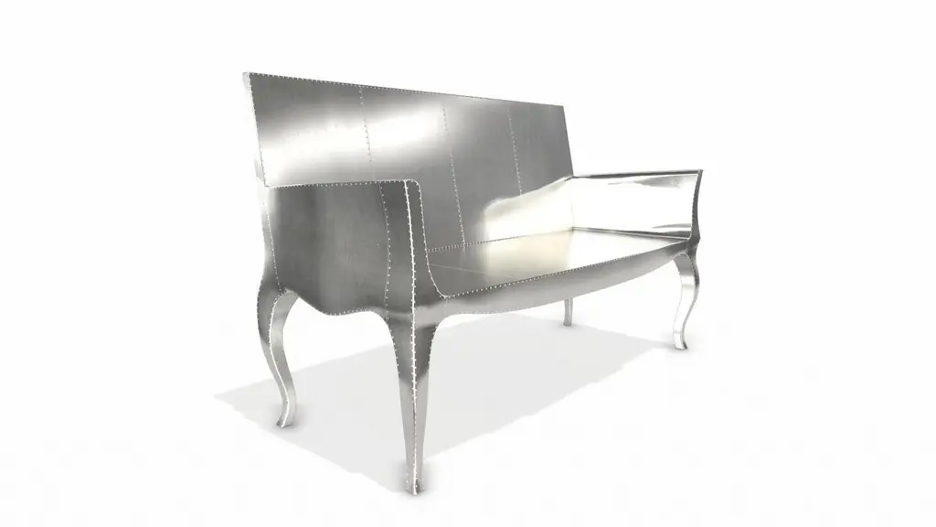 Louise Settee from our Louise Collection. The renowned designer Paul Mathieu chose the name “Louise Console” when he created his more feminine version of Louis XV (1730-1760) furniture. The characteristic cabriole leg, curving outward at the knee and inward towards the foot in an "S" shape was born during this period. It is during the same era that English furniture makers produced the Queen Anne and Chippendale styles.Crafted with utmost care and attention to detail, these Louise Settee are made to order and are available in twelve metal clad finishes, ensuring that you can choose the perfect one to match your individual style and taste. The use of high-quality materials and expert craftsmanship ensure that each Art Deco Louis Card Tables is not only beautiful but also a true piece of Art.The curved legs and side arms of this Art Deco Louise Settee are hand carved from solid pieces of teak. Pattern makers trace and cut complex forms that will cover the chair in a skin of copper, white bronze, brass or antiqued white bronze The metal finishes will tarnish over time. Regular non-abrasive household metal polishes can be used to restore the original luster.Overall, if you're looking for a piece of furniture that combines luxury, comfort, and style, then the Art Deco Louise Settee is an excellent choice. With its distinctive curved profile and multiple finish options, this Chair set is sure to elevate the look of any room it is placed in, and be a beloved addition to your home for years to come.The images shown in this listing are shot in different lighting conditions and/or are 3D illustrations. We encourage our customers to please request a sample or a full sample set of 12 finishes so that they can experience the finish first hand. Louise Settee Art Deco Settees in Smooth White Bronze by Paul Mathieu for Stephaine OdegardSize- 52"L x 23"W x 33"HMaterials - Antique Bronze, Metal sheet, Teak, Wood, MetalTechniques: Hand-Crafted, Hand-Carved, Metal Work, Wood Work, Metal Wrapping, PolishedPlease note that moisture in air, sudden change in temperature and natural movement of wood over time causes the metal to wrinkle or bubble up. We use well seasoned, reclaimed teak and high quality marine grade MDF (wherever technically possible) to avoid and delay the mentioned changes. However a perfect stability of metal cannot be guaranteed. Please note that our smooth finish metal clad pieces will have some unavoidable tool marks. This is proof that everything is done by hand. The smooth finish will not come out like a machine made perfect surface and the master Artisan will do their best to make it look as good/clean/stable/perfect as he possibly can.The antique white bronze finish is hand done by using an acidic chemical over the white bronze finish to recreate a natural patination. Like with the natural patination of silver, copper, or brass, the final result and color uniformity of the patina cannot be guaranteed. The goal of this finish is to achieve rainbow-like shades with dull, shiny, cloudy, and streaky patches to give an illusion of antiquing. Please note:None of our metal clad pieces are treated with a protective “finish” thus enabling the items to age naturally over time. We will of course polish them well before we pack them. a) Copper oxidizes faster than the other metals. In six to twelve months it will most likely lose its shine and will gradually turn to different shades of brown and/or green/blue. This aging process and its effect is referred to as verdigris. After a year the piece should not change much more. Copper does not rust, but does require periodic cleaning in order to retain its original shine if that the preferred option. ('BRASSO' or any known copper polish can be used to polish copper).b) Brass retains its shine for far longer than others, but will tarnish if not cleaned on occasion. ('BRASSO' is made to polish brass).c) White bronze, has the least tendency to show age or tarnish. If kept in a controlled climate, this metal will hold its shine for years. It can be cleaned with a cleanser and polished with a cloth. d) The antiqued white bronze finish will react with the natural elements the fastest in the beginning but it too will stop reacting and will settle down in a stable state like copper after 6-12 months. Since it is already antiqued and looked like it is tarnished, as described in an earlier message, this fast reaction will not change the over all look. In that way this surface is most forgiving. The images shown in this listing are shot in different lighting conditions and/or are 3D illustrations. We encourage our customers to please request a sample or a full sample set of 12 finishes so that they can experience the finish first hand.
