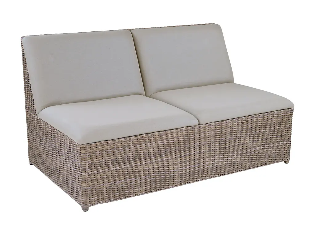 Ludlow mixes materials and textures, creating a design that feels both modern and organic. A low-profile frame wrapped in a light wicker with weathered teak feet and textured Sunbrella fabric creates visual complexity without sacrificing practicality.