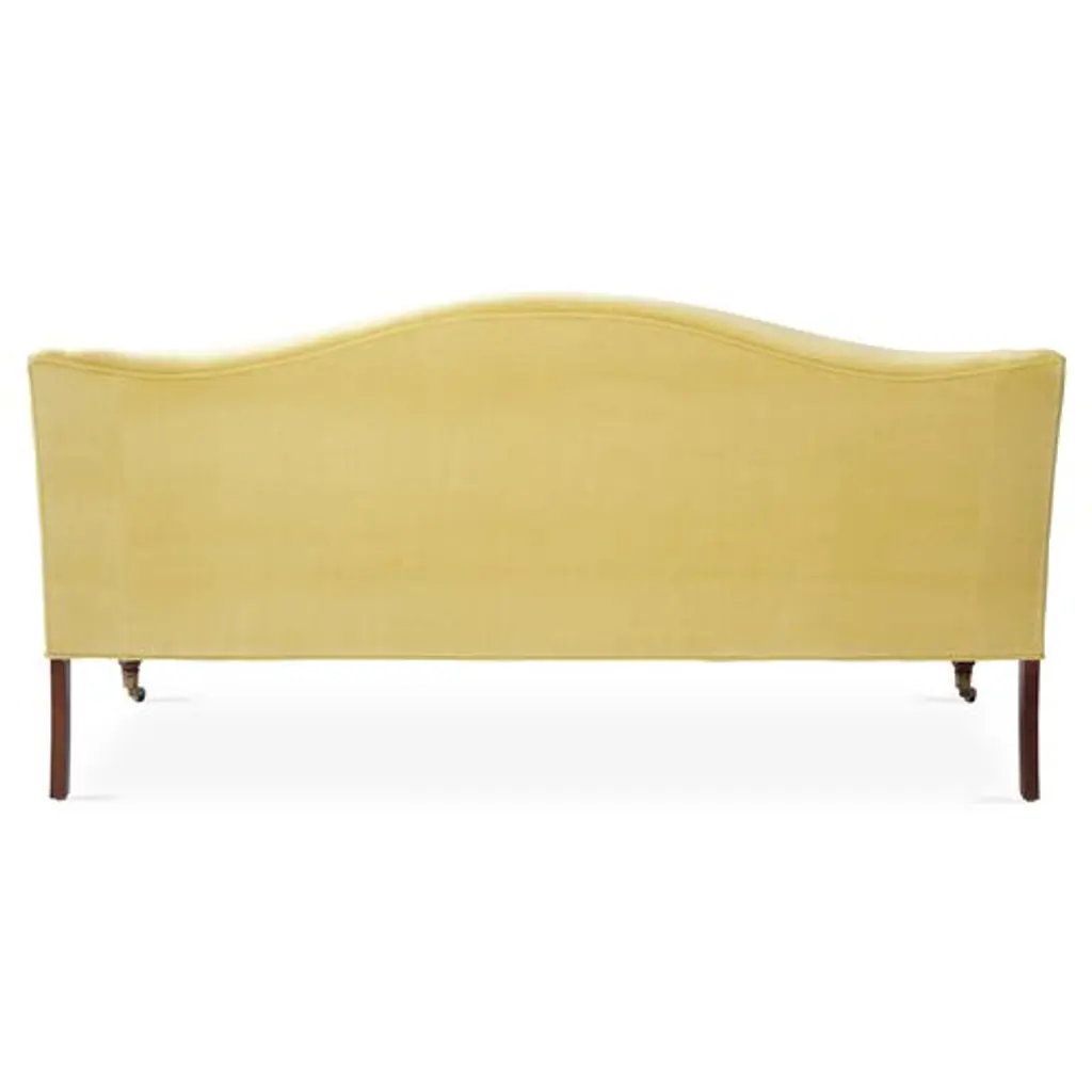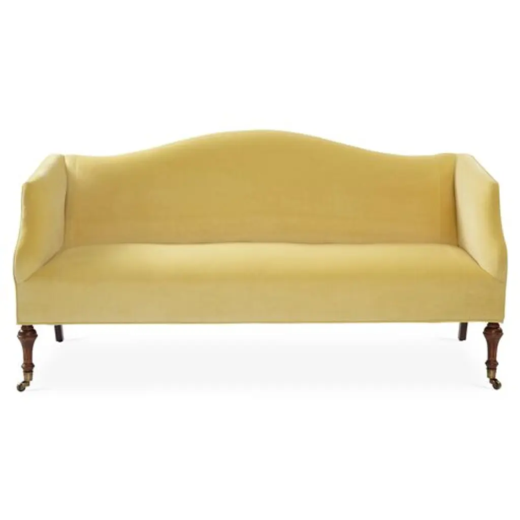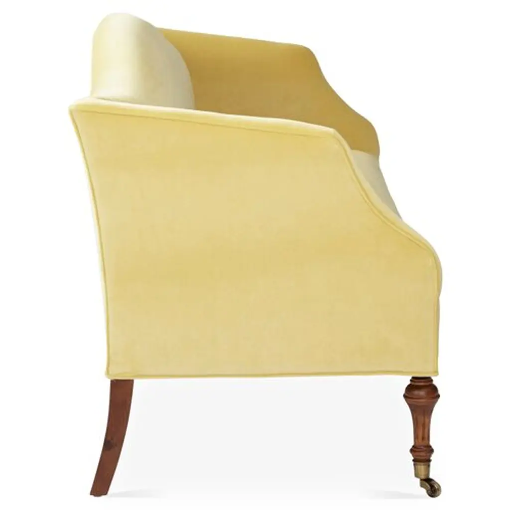 Designed by us and available only at One Kings Lane: Perched on turned hardwood legs with plush canary-yellow velvet upholstery and a down-wrapped fill, this modern camelback settee entices guests with classic details and quality comfort. Brass casters protect floors from scratching and marring and offer easy mobility. Made in the USA.