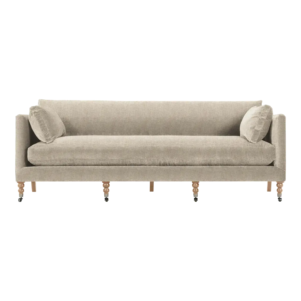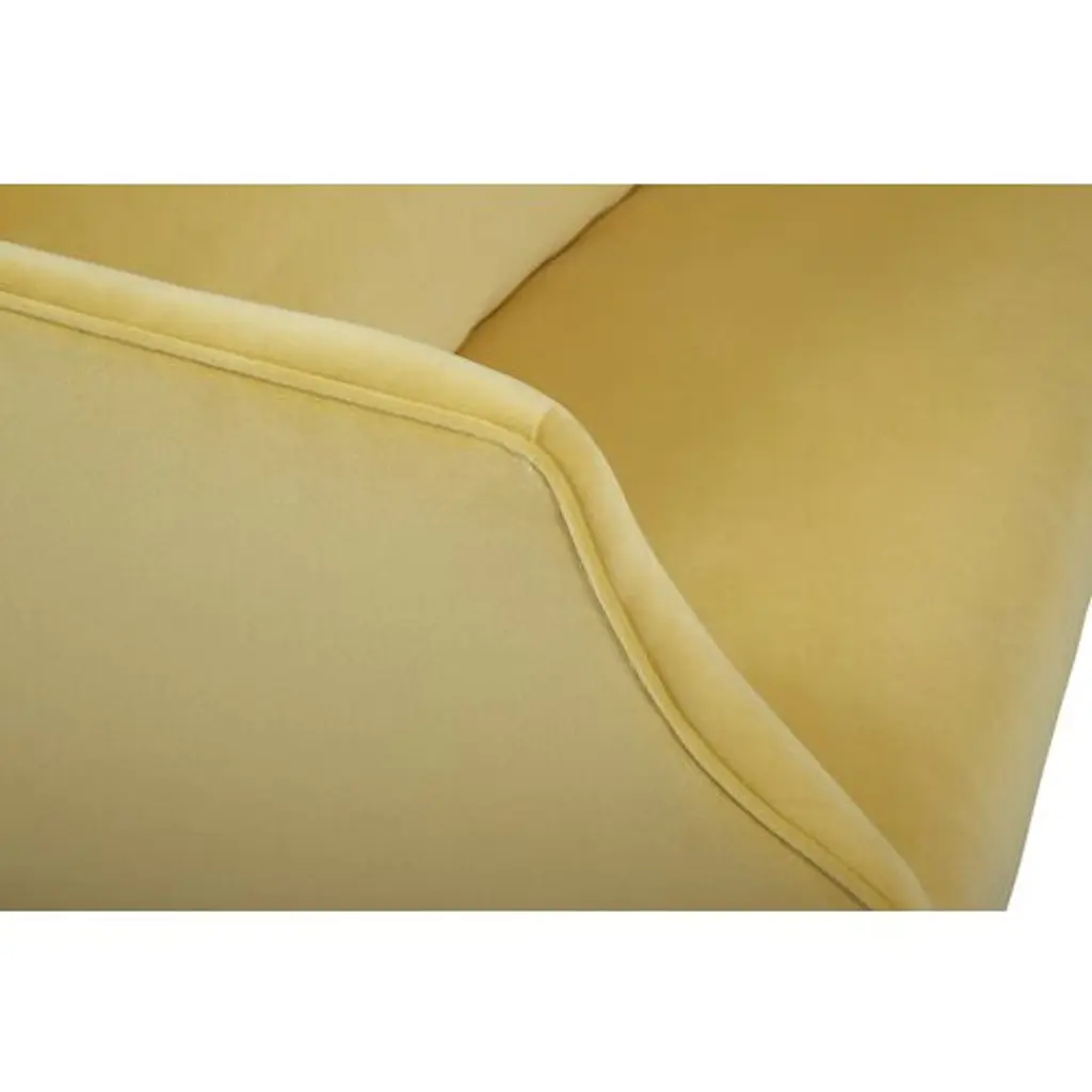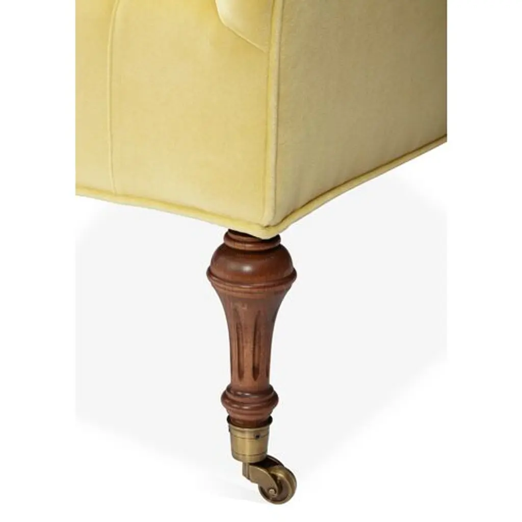 Designed by us and available only at One Kings Lane: Perched on turned hardwood legs with plush canary-yellow velvet upholstery and a down-wrapped fill, this modern camelback settee entices guests with classic details and quality comfort. Brass casters protect floors from scratching and marring and offer easy mobility. Made in the USA.