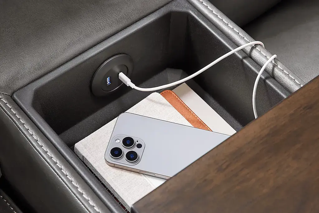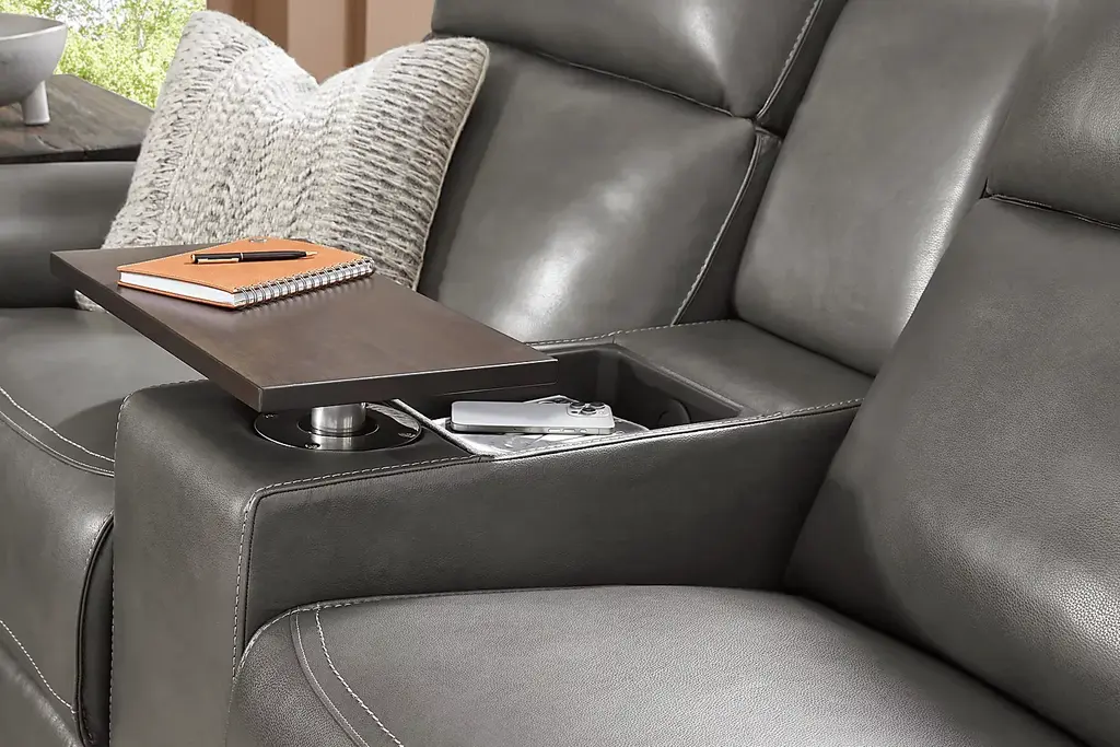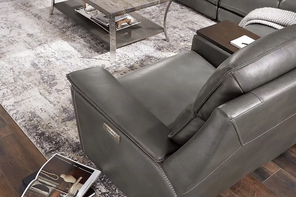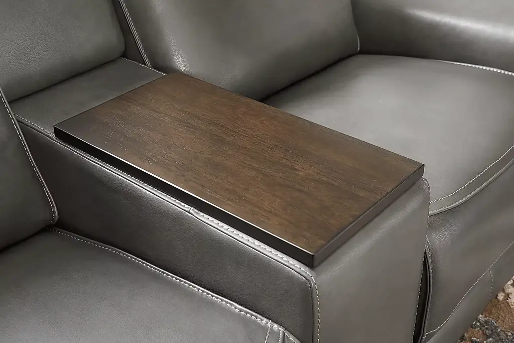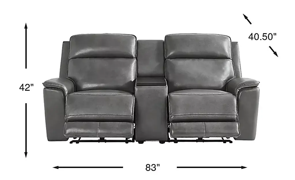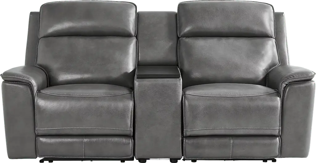 The luxury of a weekend retreat grounded in the familiar calm of home, the Magellan collection's inviting frame blends modern comfort with the refined ease of classic style. Confidently transitional, this loveseat is upholstered in smokey gray top grain leather where the body touches. Deep tufted backs and sumptuously padded track arms deliver cradle-like cushioning, while top-stitched seams accentuate the elegant curves and clean lines that define its handsome silhouette. Dual power reclining features adjustable headrest and footrest for personalized relaxation, along with USB ports on each control panel for added convenience. To enhance the experience, a wood top center console includes hidden storage, cupholders, and built-in charging ports, making every day lounging effortlessly luxurious. Upholstery: Top grain leather where the body touches and vinyl sides and backs. Accent pillow not included.