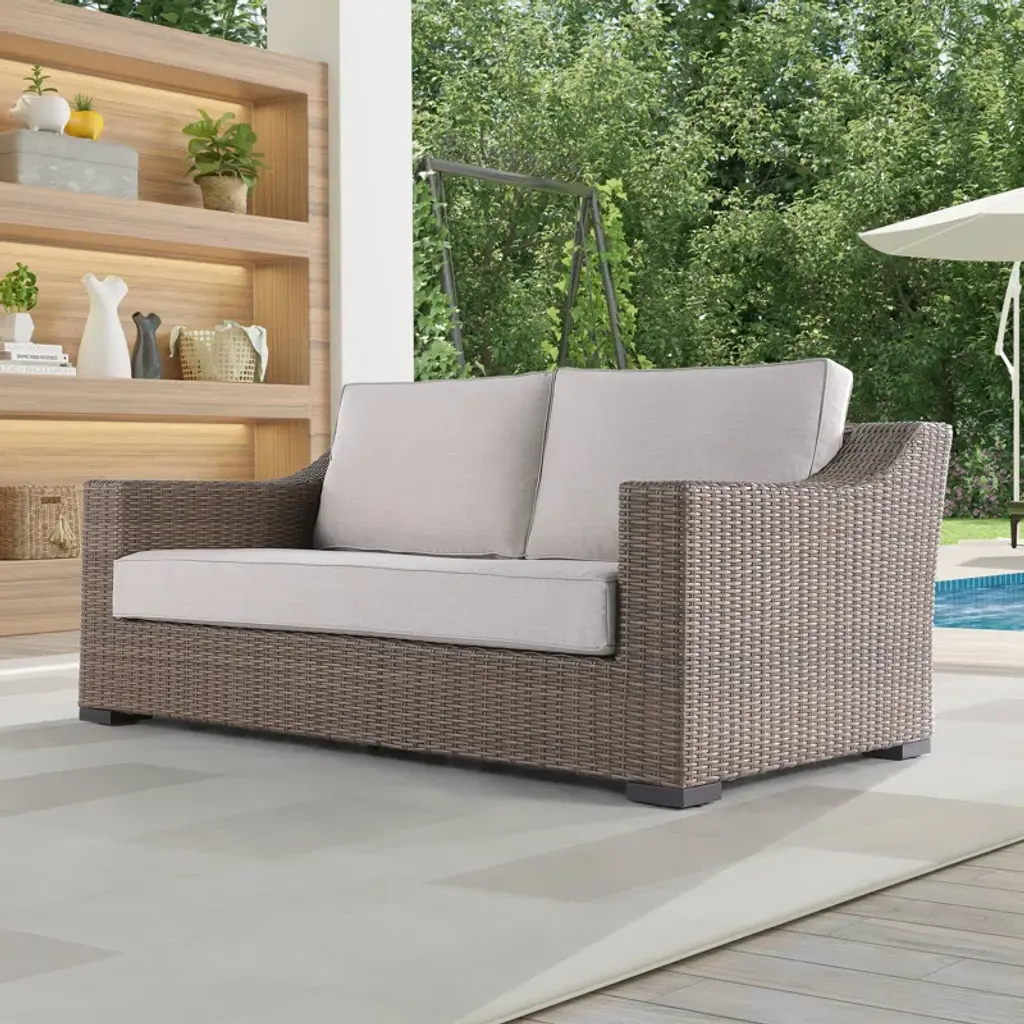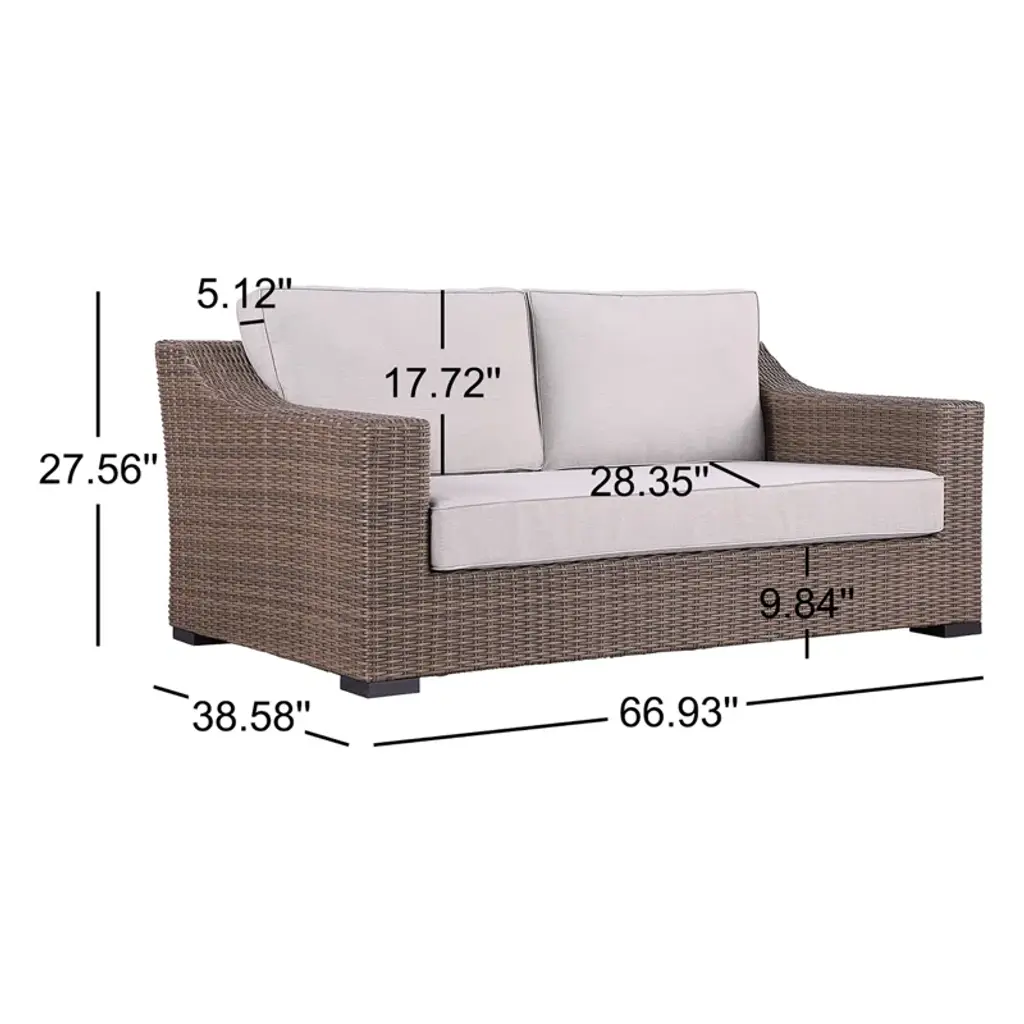 Say hello to the ultimate patio upgrade. This two-seater loveseat, built with an aluminum frame wrapped in polyethylene wicker, is the perfect blend of modern and rustic. Its wide, sloping arms beckon you to sit back and unwind, while the plush foam and polyester-filled cushions provide optimal seating comfort. The wicker exterior and cushion covers are water and UV resistant, promising durability through all seasons. Plus, the cushion covers are removable with a convenient zipper closure. Get ready to take your outdoor relaxation to the next level.
