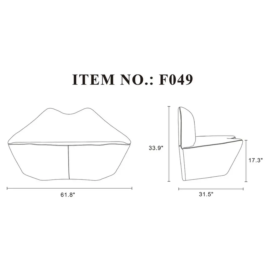 Add a splash of vivaciousness into your decor with the Kiss Loveseat. This stunning piece is hand-upholstered in smooth Faux Leather, taking the iconic image of bold lips and transposing them onto a seat that is expertly designed for lounging. The Kiss infuses fun and whimsy into any decor with it's striking curves and sumptuous design.Modern Kiss Lips Loveseat Perfect for Statement Living Spaces. Measures: 61.8 in. Length, 33.9 in. Height, 31.5 in. Depth.Interior Construction Made of Hardwood. Upholstered in Faux Leather with High Density Foam Filled Padding. Funky Lip Design Fashion Loveseat Sofa. Comfortably Seats 2.Seat Height: 17.3"Delivered to you Fully Assembled! No Assembly Required!61.8 in. Length, 33.9 in. Height, 31.5 in. Depth.