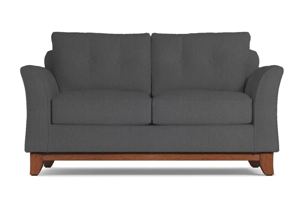 It's not always easy to find comfortable furniture that's also stylish and on trend. That's where Apt2B comes in. We specialize in high-quality modern furniture and we never sacrifice comfort. Who cares how awesome your sofa looks if you can't bear to sit in it? Take our Marco Loveseat, for example. Its flared silhouette and button-tufted cushions rock the modern style, but it's also the perfect spot to relax and watch a movie or grab a quick cat nap. The wooden base is stained in a rich pecan finish that compliments any of the 27 available color choices. And your choice of upholstery includes everything from microfiber, polyblends, basket weaves and more. Apt2B offers a 100-percent satisfaction guarantee. Make yourself comfortable on the Marco Collection. Tufted buttons on the back cushions, and a wood base stained in a rich, espresso finish give it a modern look.