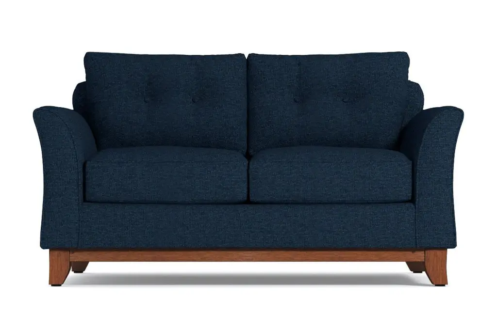 It's not always easy to find comfortable furniture that's also stylish and on trend. That's where Apt2B comes in. We specialize in high-quality modern furniture and we never sacrifice comfort. Who cares how awesome your sofa looks if you can't bear to sit in it? Take our Marco Loveseat, for example. Its flared silhouette and button-tufted cushions rock the modern style, but it's also the perfect spot to relax and watch a movie or grab a quick cat nap. The wooden base is stained in a rich pecan finish that compliments any of the 27 available color choices. And your choice of upholstery includes everything from microfiber, polyblends, basket weaves and more. Apt2B offers a 100-percent satisfaction guarantee. Make yourself comfortable on the Marco Collection. Tufted buttons on the back cushions, and a wood base stained in a rich, espresso finish give it a modern look.