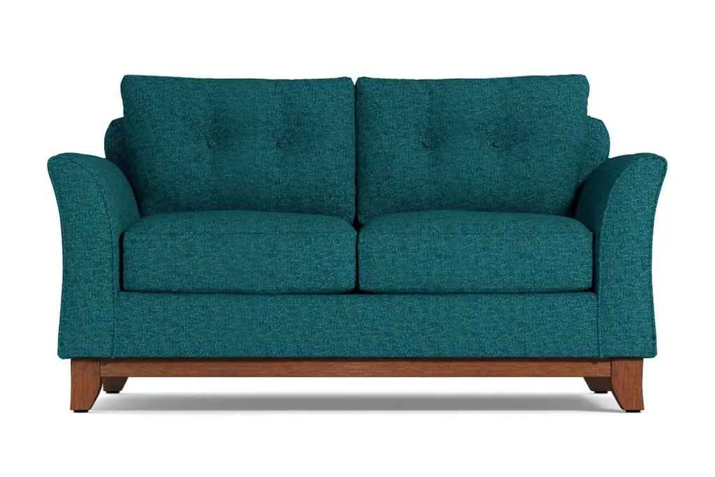 It's not always easy to find comfortable furniture that's also stylish and on trend. That's where Apt2B comes in. We specialize in high-quality modern furniture and we never sacrifice comfort. Who cares how awesome your sofa looks if you can't bear to sit in it? Take our Marco Loveseat, for example. Its flared silhouette and button-tufted cushions rock the modern style, but it's also the perfect spot to relax and watch a movie or grab a quick cat nap. The wooden base is stained in a rich pecan finish that compliments any of the 27 available color choices. And your choice of upholstery includes everything from microfiber, polyblends, basket weaves and more. Apt2B offers a 100-percent satisfaction guarantee. Make yourself comfortable on the Marco Collection. Tufted buttons on the back cushions, and a wood base stained in a rich, espresso finish give it a modern look.