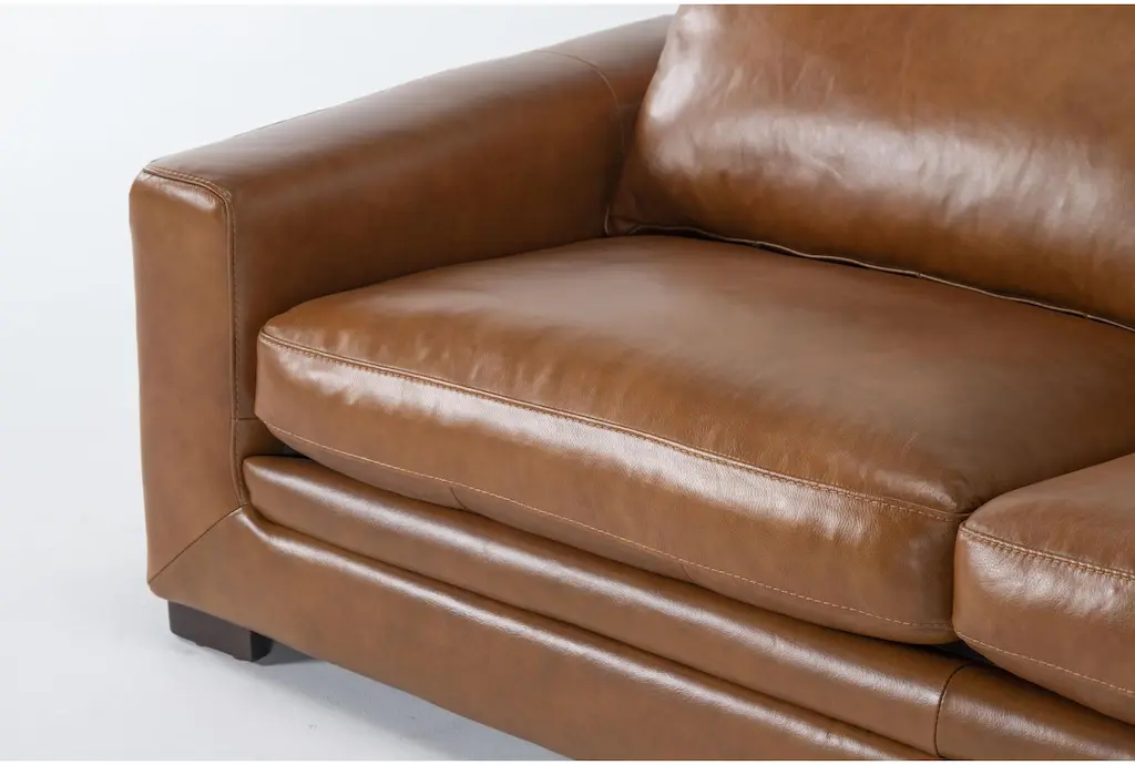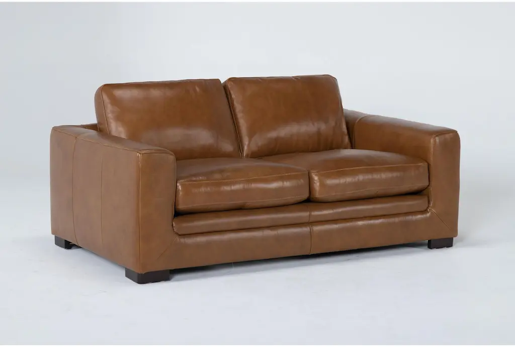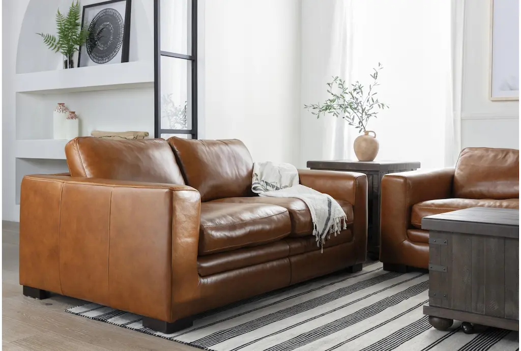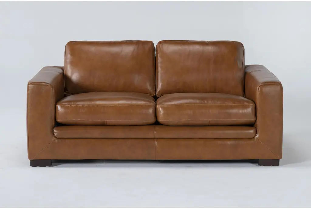 The Mason Brown Leather 70" Loveseat brings comfort and style to your living room. Featuring soft down cushions and track arms, this loveseat is perfect for small spaces. The 100% leather upholstery adds a touch of luxury and durability.