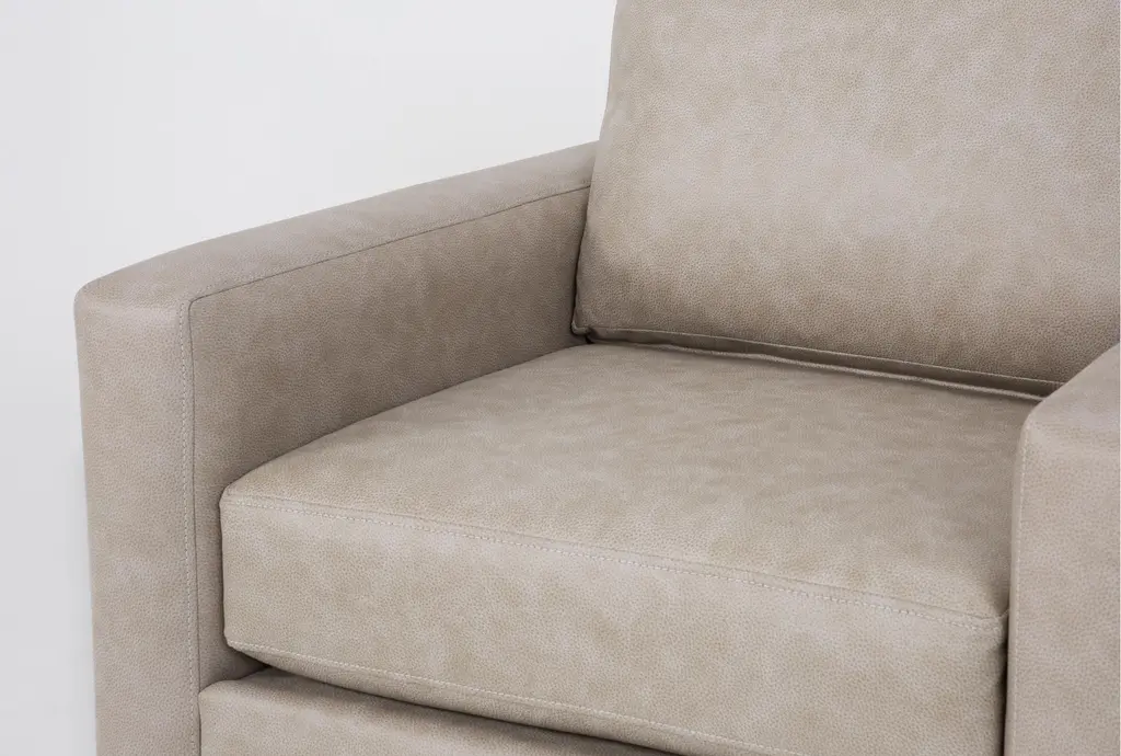 Clean lines and tailored style give our Mathers faux leather living room set mass appeal, not to mention the abundance of options you have when it comes to configuration and color. Made by and for Living Spaces, the collection is available in multiple hues and seating arrangements with a core design that is casual, comfortable and modern. In addition to hardwood and plywood track arm frames that are precision cut for strength, there are loose, reversible cushions that can be rotated to promote even wear and longevity. Finally, vegan faux leather ensures handsome, durable coverage.