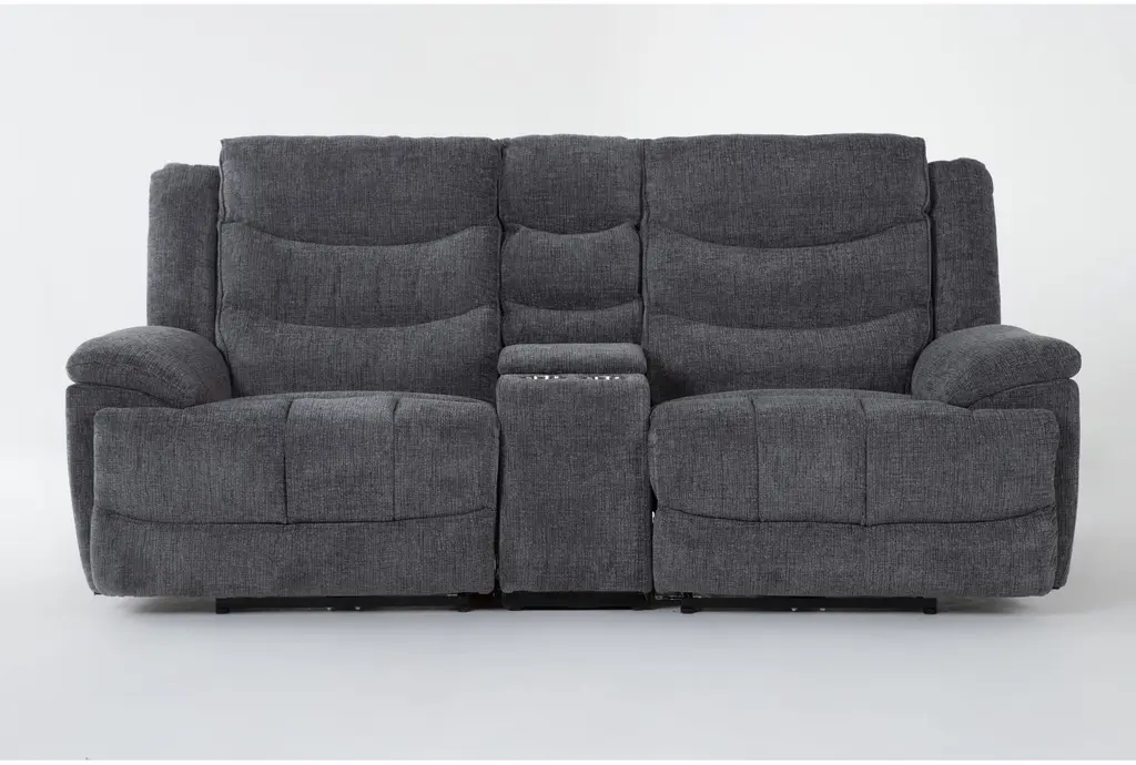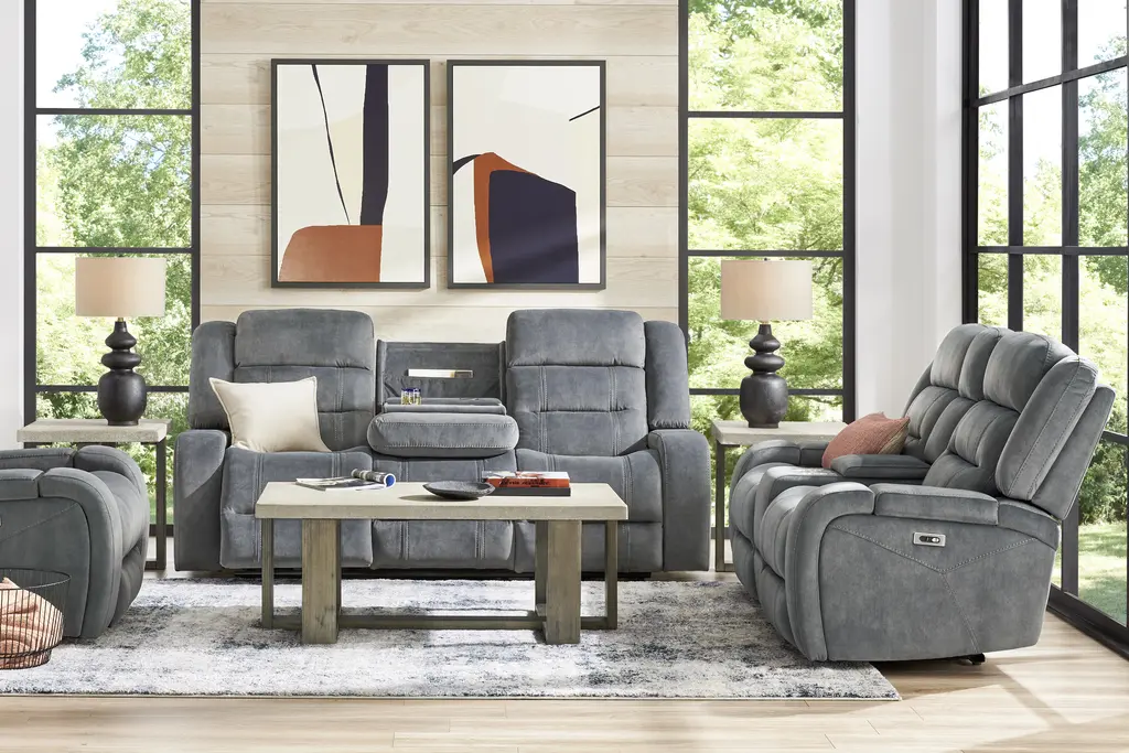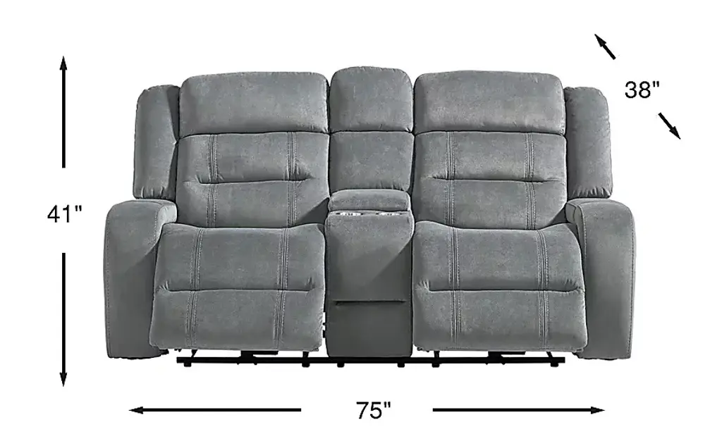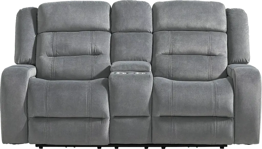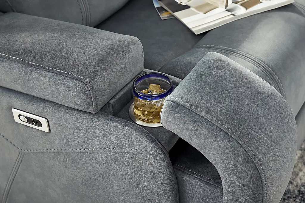 A calming hush settles, the room begins to feel less like a place and more like a quiet, comfortable pause as the McKinley collection's soft textures and clever luxury invite effortless relaxation. This classically styled loveseat is wrapped in soft graphite gray microfiber and showcases generously deep tufting for a cloudlike silhouette. Contrasting top-stitched seams add tailored definition throughout, while the seats and back feature highly decorative double stitching for a refined touch. The additional delight of power reclining includes power adjustable footrest and USB charging ports set into the control panels. Hidden cupholders tucked into the arms offer a sleek solution for keeping drinks within reach. For a delightful final touch, the center console comes with additional storage and cupholders. Upholstery: 100% polyester.