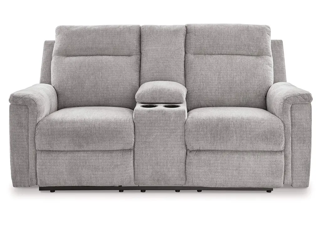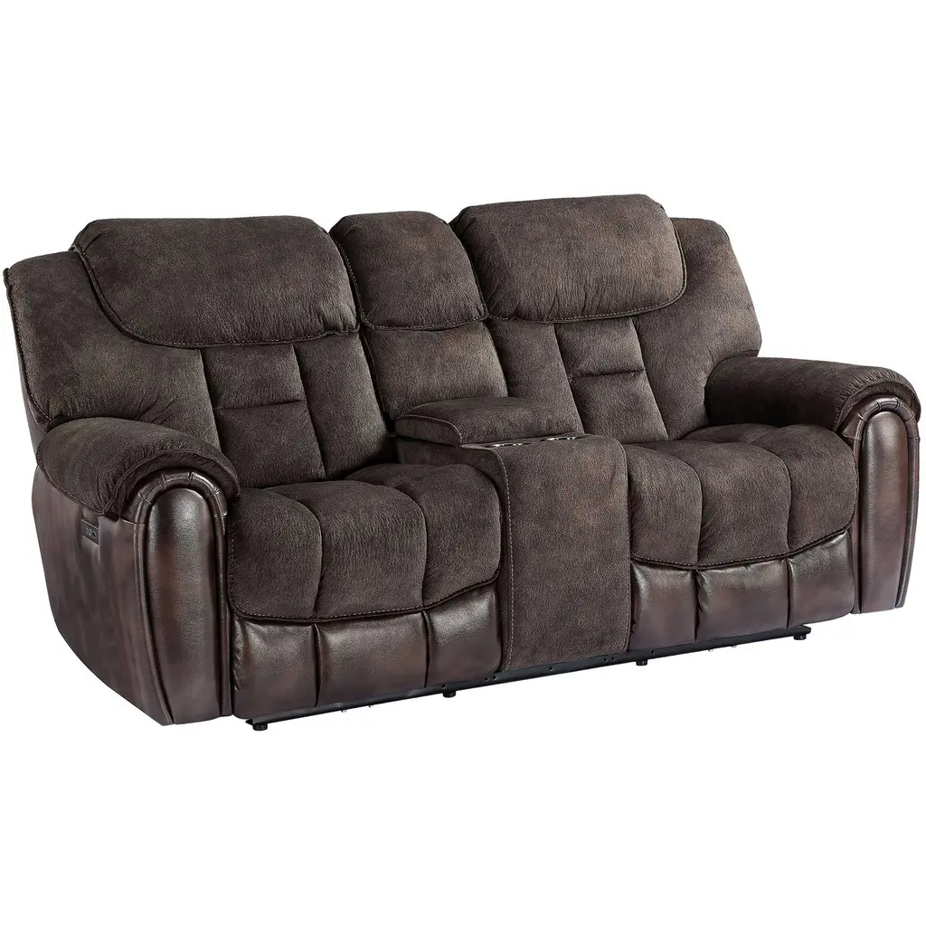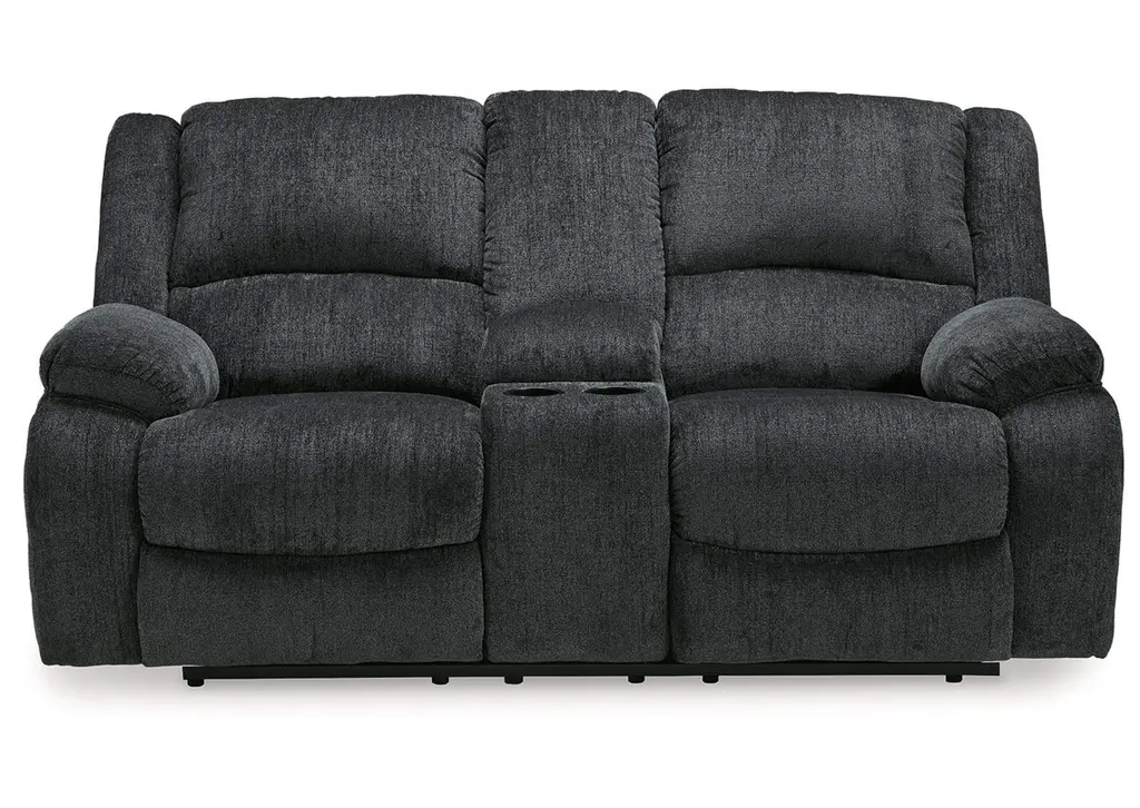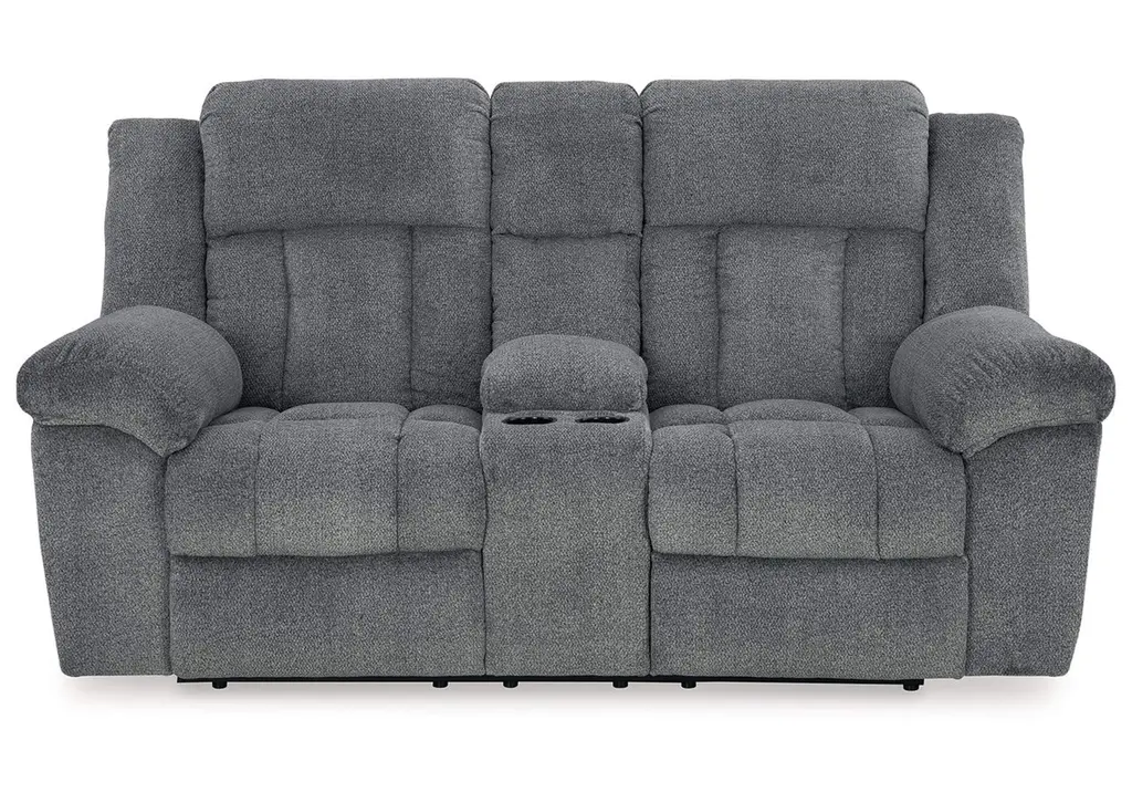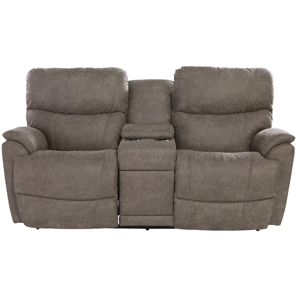 A calming hush settles, the room begins to feel less like a place and more like a quiet, comfortable pause as the McKinley collection's soft textures and clever luxury invite effortless relaxation. This classically styled loveseat is wrapped in soft graphite gray microfiber and showcases generously deep tufting for a cloudlike silhouette. Contrasting top-stitched seams add tailored definition throughout, while the seats and back feature highly decorative double stitching for a refined touch. The additional delight of power reclining includes power adjustable footrest and USB charging ports set into the control panels. Hidden cupholders tucked into the arms offer a sleek solution for keeping drinks within reach. For a delightful final touch, the center console comes with additional storage and cupholders. Upholstery: 100% polyester.