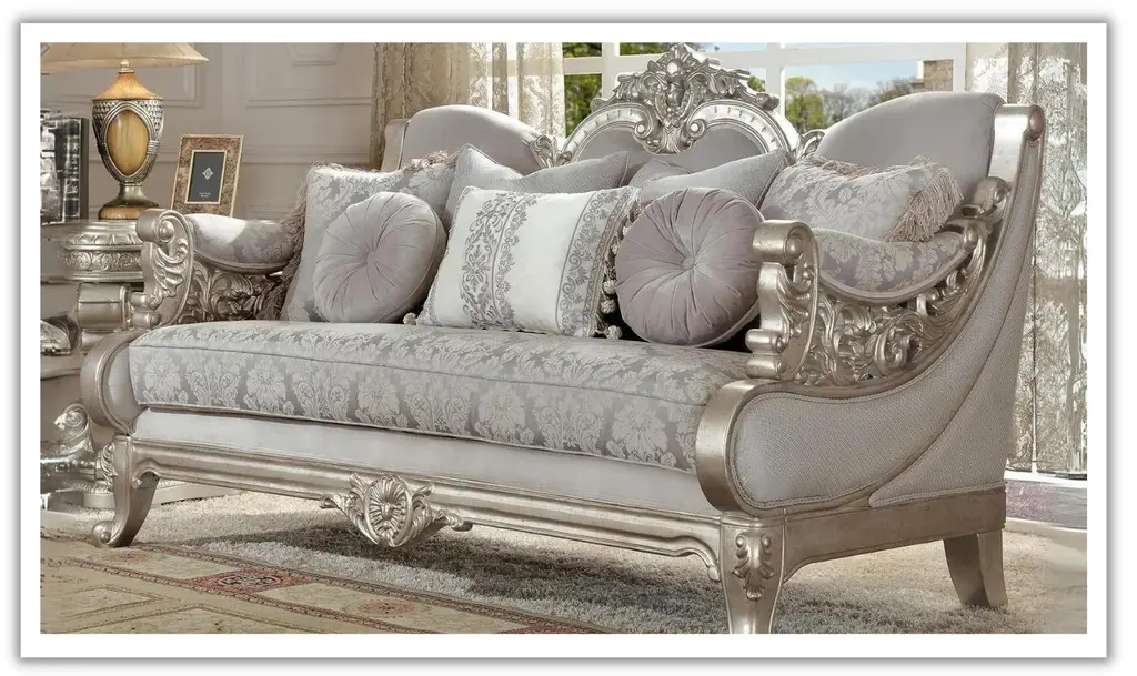 Experience cozy and classic elegance perfect for intimate spaces and moments with this loveseat. The traditional design, enriched with a champagne and silver brush finish, provides a luxurious yet warm aesthetic that is both inviting and stylish. Accompanied by three plush pillows, it is not just a seat but a haven where comfort and sophistication coexist in harmony, making every moment spent on it truly special.