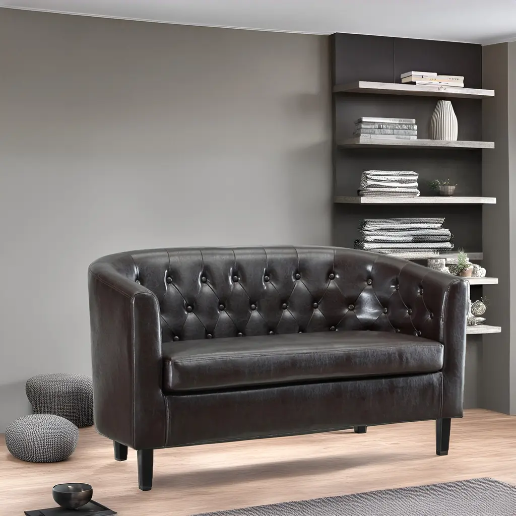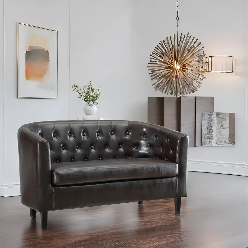 Midcentury Modern Button Tufted Faux Leather Barrel Loveseat - Comfy Tub Loveseat Sofa - Espresso