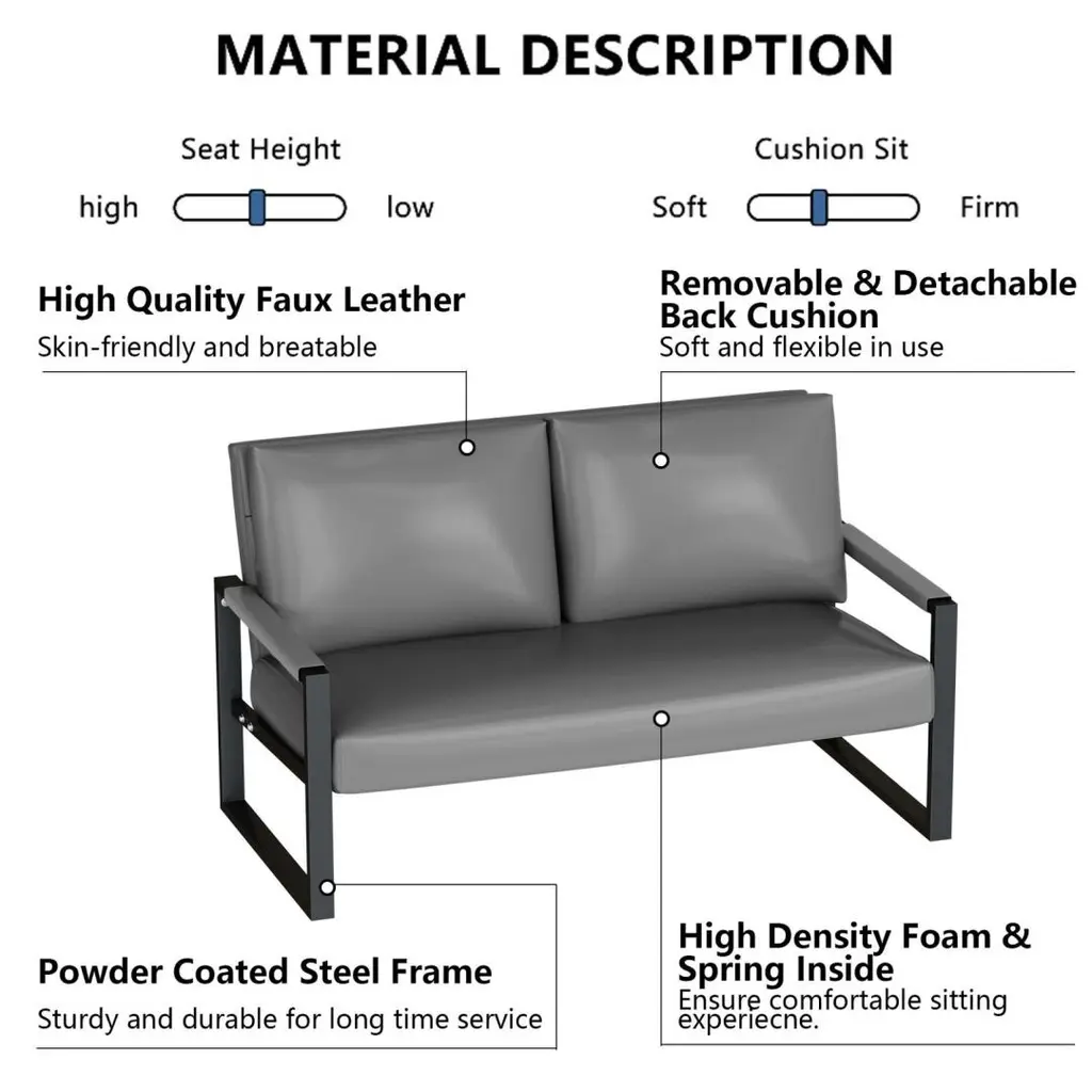 Introducing our Mieres Mid-Century Style Faux Leather Loveseat Sofa with Steel Frame, a perfect blend of modern classic aesthetics and comfort. This loveseat sofa is made of premium faux leather and a sturdy metal frame, ensuring both durability and comfort. The back cushion is removable and detachable, while the seat cushion is fixed. Simple assembly is required following the provided instructions, taking only 15 minutes.Features:Product Details: