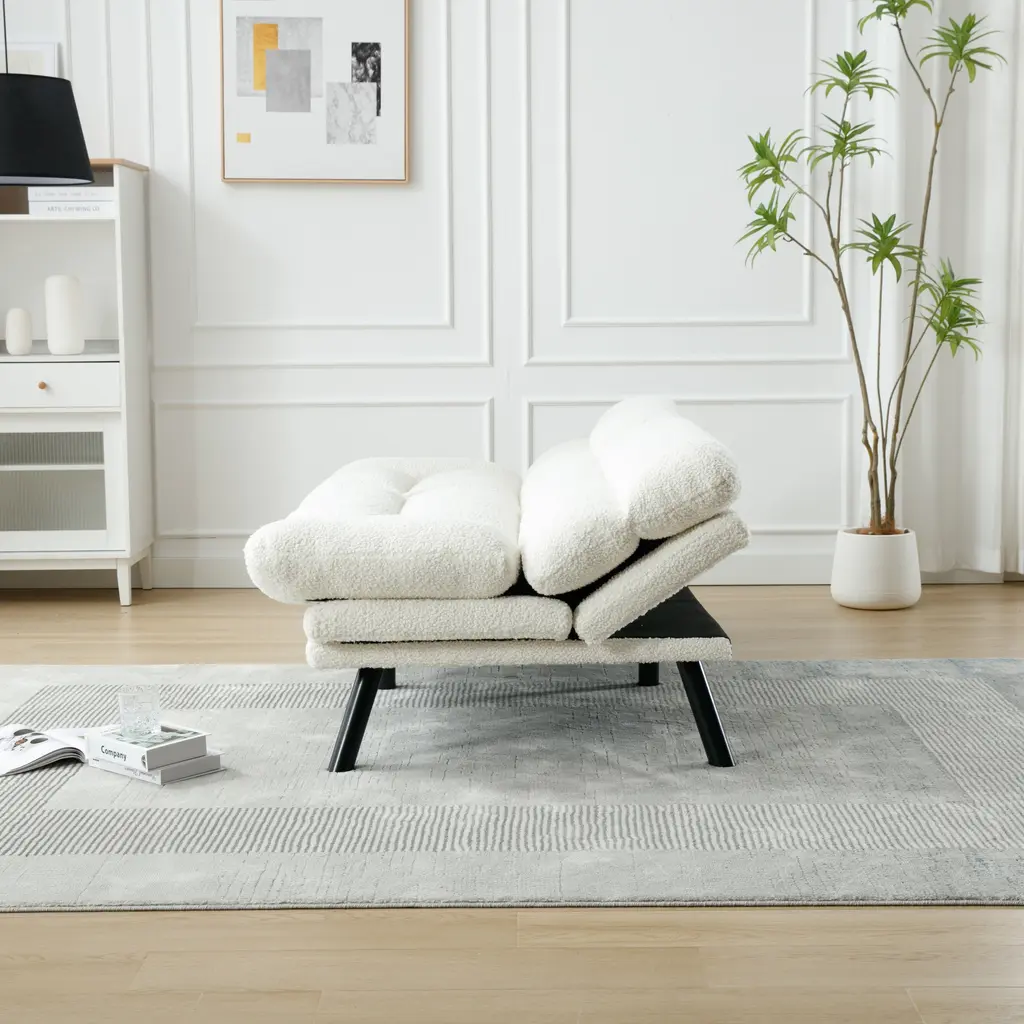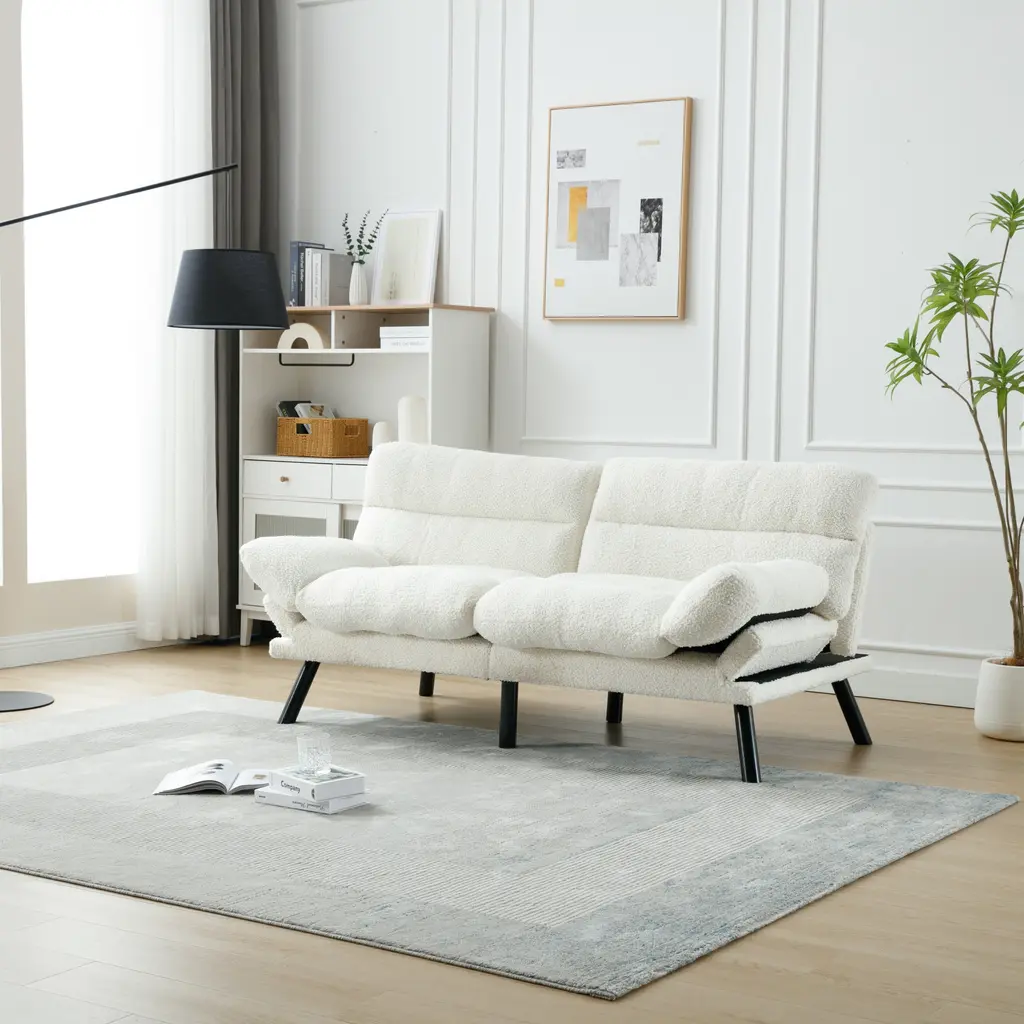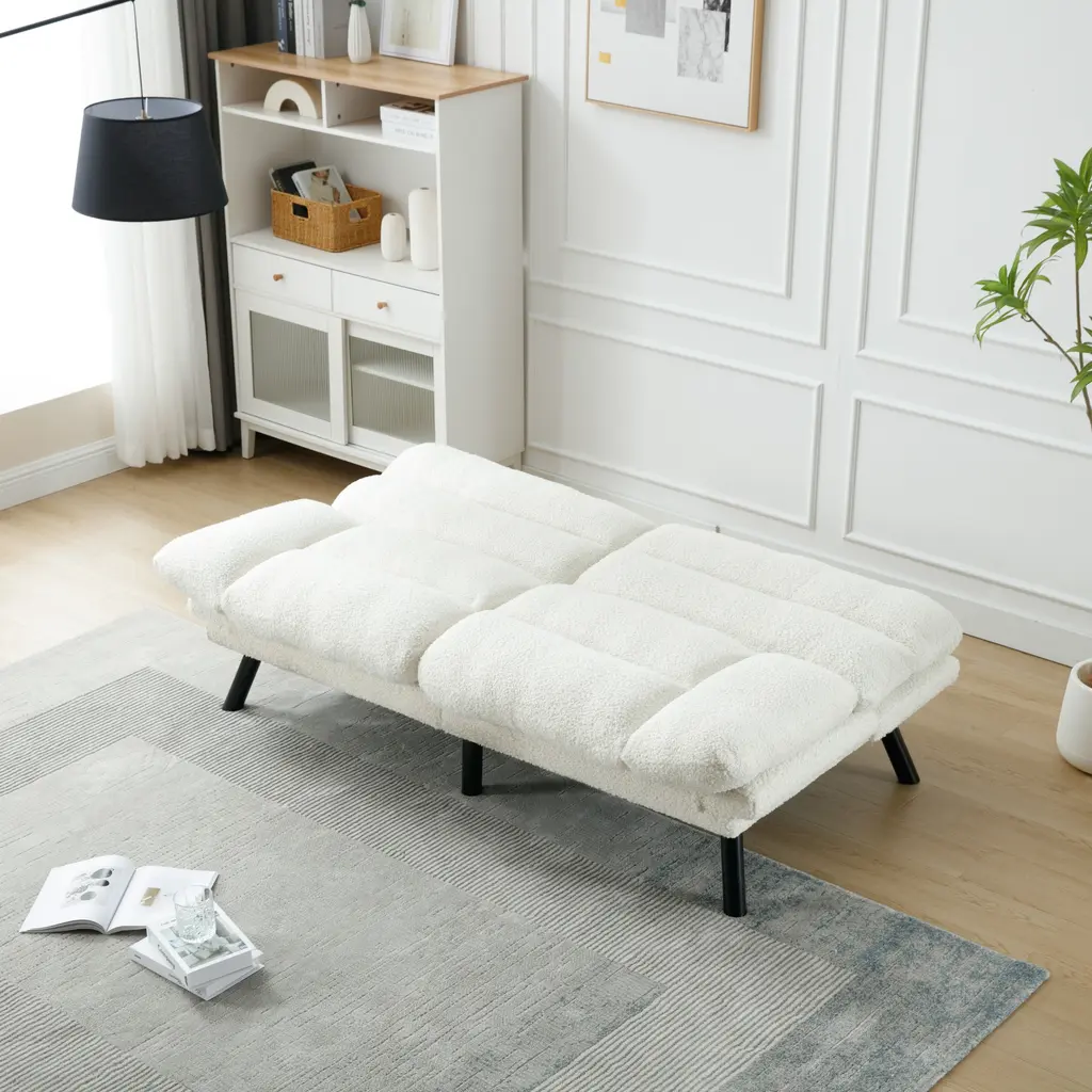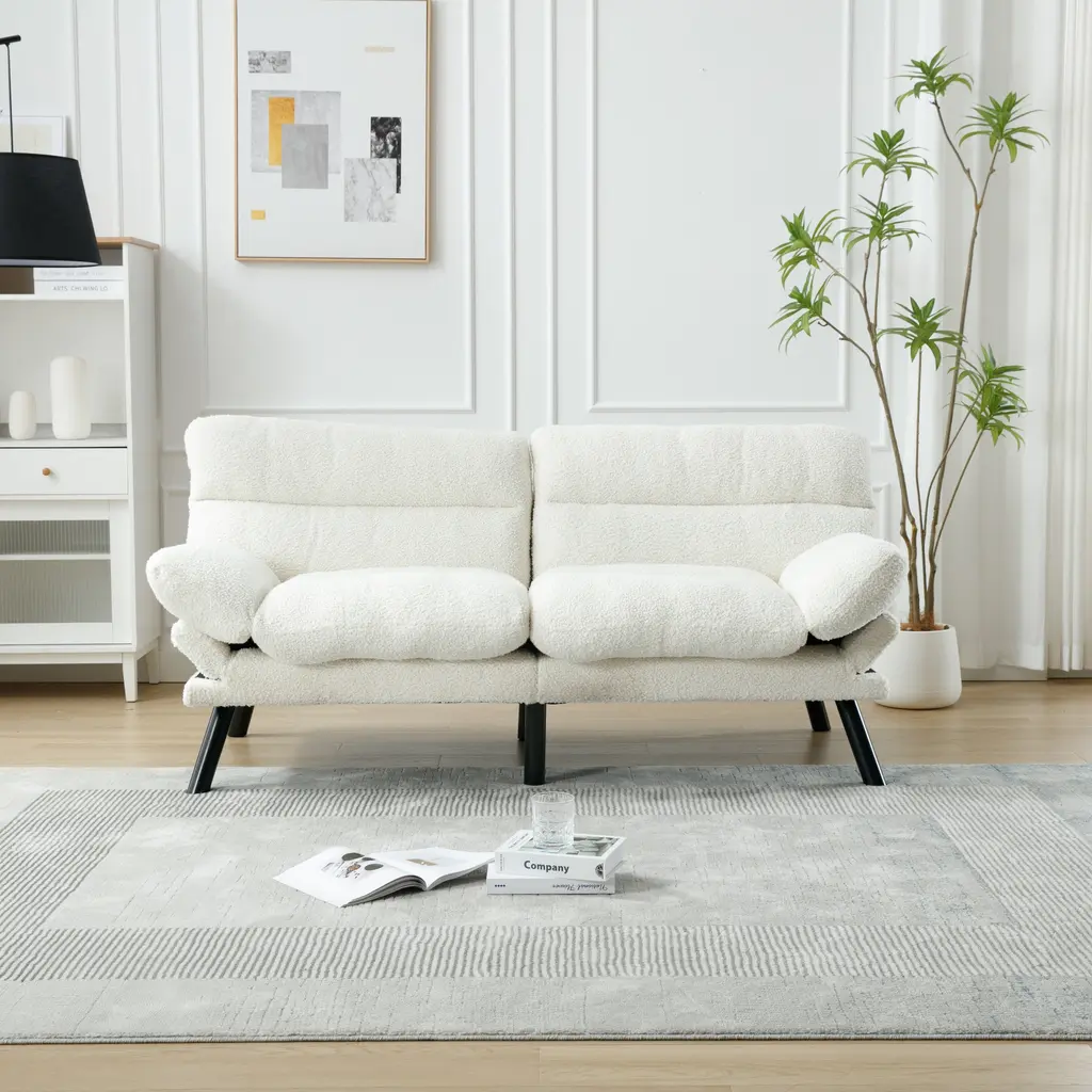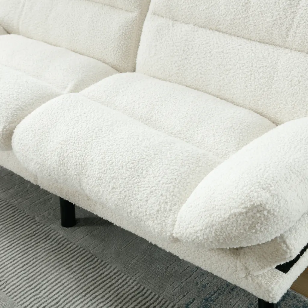 Product Features1.Product Dimensions: 70.08" W x 29.53" D x 31.5"; 80.36 lbs. Seat: 50" W x 20.08" D x 18.11" H in.; Seat back: 16.14" H. Weight Capacity: 600 lbs.2.Sturdy Construction: The Teddy fabric sofa features a high-quality wood frame and high-elastic S-shaped springs, providing a sturdy foundation that can support up to 600 pounds. The 6 metal legs further enhance the sofa's stability and durability.3.Ultimate Comfort: Crafted with breathable and skin-friendly Teddy fabric, this sofa offers a comfortable seating experience. The high-density sponge filling ensures perfect support for your body, allowing you to relax and unwind.4.Modern Style: Add a touch of modernity to your home with the sofa set. The sleek design and black metal legs create a chic and stylish look that combines vintage flair with contemporary living. The Teddy fabric upholstery adds elegance and sophistication to your living space.5.Compact Size: The teddy fabric sofa is designed to fit small spaces without compromising on comfort. With dimensions of 70.08" W x 29.53" D x 31.5" H, it provides ample seating while maximizing floor space in your living room, apartment, bedroom, dorm, or office.6.Easy Assembly: This sofa requires assembly, and all necessary tools and instructions are included for your convenience.