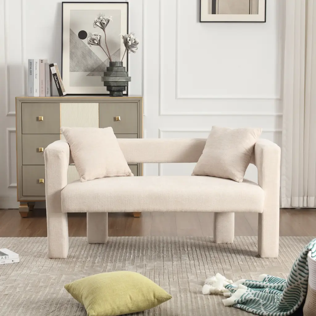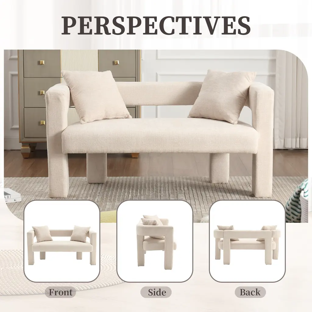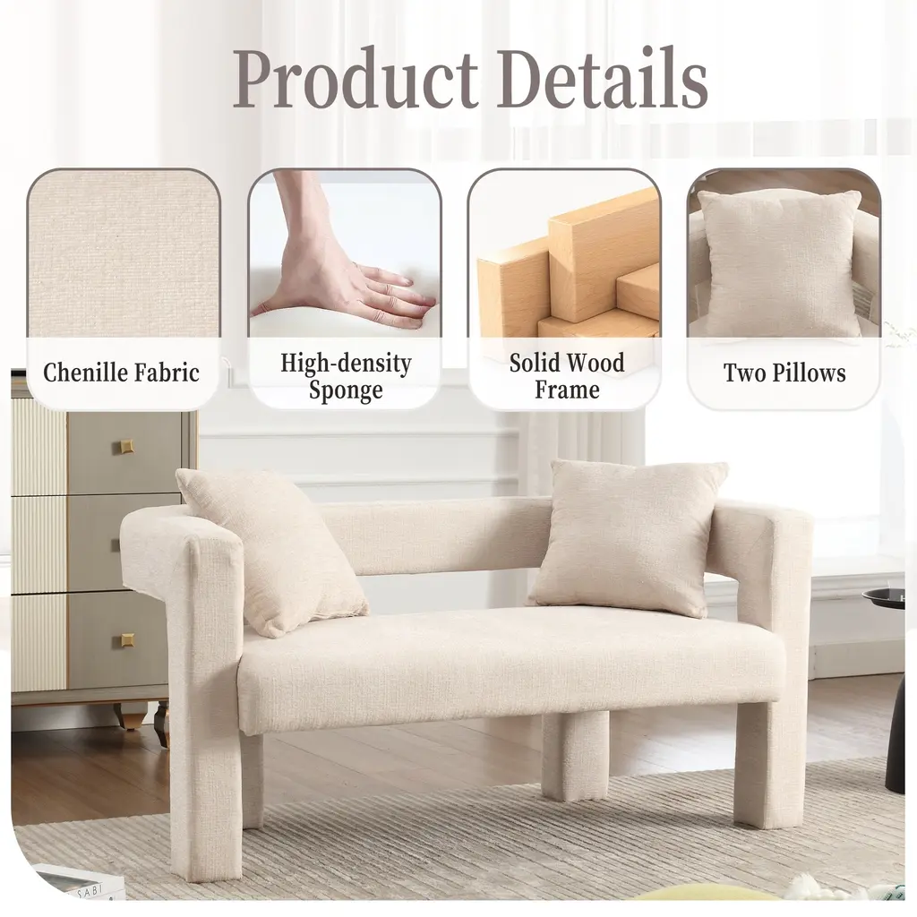 ▷2 Pillows This sofa is equipped with 2 small detachable pillows, allowing you to experience a visual feast of different designs. Excellent Structure Curved edges, padded with thick foam and upholstered with high-quality fabric, you can seat yourself in it comfortably for relaxation.The soft chenille fabric provides a comfortable sitting sensation, and the back backrest provides good support for your back to sit comfortably. Multifunctional Use This living room accent sofa, in fashionable and classic style, is suitable for various scenarios like dining room, living room, bedroom, dressing room, vanity room, etc. This is the best choice for your decorating a room or gifting to families and friends. Weights & Dimensions Upholstery Material Chenille Fabric Seat Fill Material Foam Weight Capacity 400 lb Frame Material PlyWood frame Arms Included Yes Removable Cushion Location Seat Country of Origin China Product size 51.18'' H*23.62'' W*25.59'' Back Height - Seat to Top of Back 9.06'' Leg Height 10.06'' Arm Height 9.06'' Seat Depth 19.29'' Seat Width 43.31'' Seat Height 9.06'' Feet material Plywood Net ▷Gross weight 46.20 ▷52.90LBS ▷Eco-friendly Solid Wood Frame: This double sofa is made of high-quality solid wood frame, which is sturdy, durable and environmentally friendly, providing you with long-lasting stability and safety. ▷Soft Chenille Fabric: The surface is covered with high-grade chenille fabric, which is soft, comfortable and delicate to the touch, adding warmth and luxury to your home space. ▷Arc Backrest Design: unique arc backrest design, elegant and comfortable, perfectly fit the human body curve, provide the ultimate backrest support. ▷Hollow Design: the hollow design between the backrest and cushion enhances the transparency and modernity of the sofa, adding a touch of fashion to your space. ▷Full Soft Package Foot Design: four sofa feet are fully soft package design, not only to protect your floor from scratches, but also to enhance the overall beauty of the sofa. ▷High-density Sponge Cushion: Filled with high-density sponge, soft and strong support to ensure that the sofa remains comfortable for a long time without deformation. ▷Equipped with Original Pillows: comes with 2 original pillows, perfect match with the sofa, adding a sense of comfort while also enhancing the visual effect of the sofa. ▷Multiple Color Choices: 5 colors are available for you to choose from, suitable for different home styles and personal preferences, easy to match your interior decor. ▷Suitable for All Spaces: Whether it is living room, study room or bedroom, this double sofa can be perfectly integrated to create a cozy lounge corner for you. ▷Easy to Install: Conveniently designed and equipped with detailed installation instructions and tools, the installation process is quick and easy, making it easy for you to own this cozy double sofa.