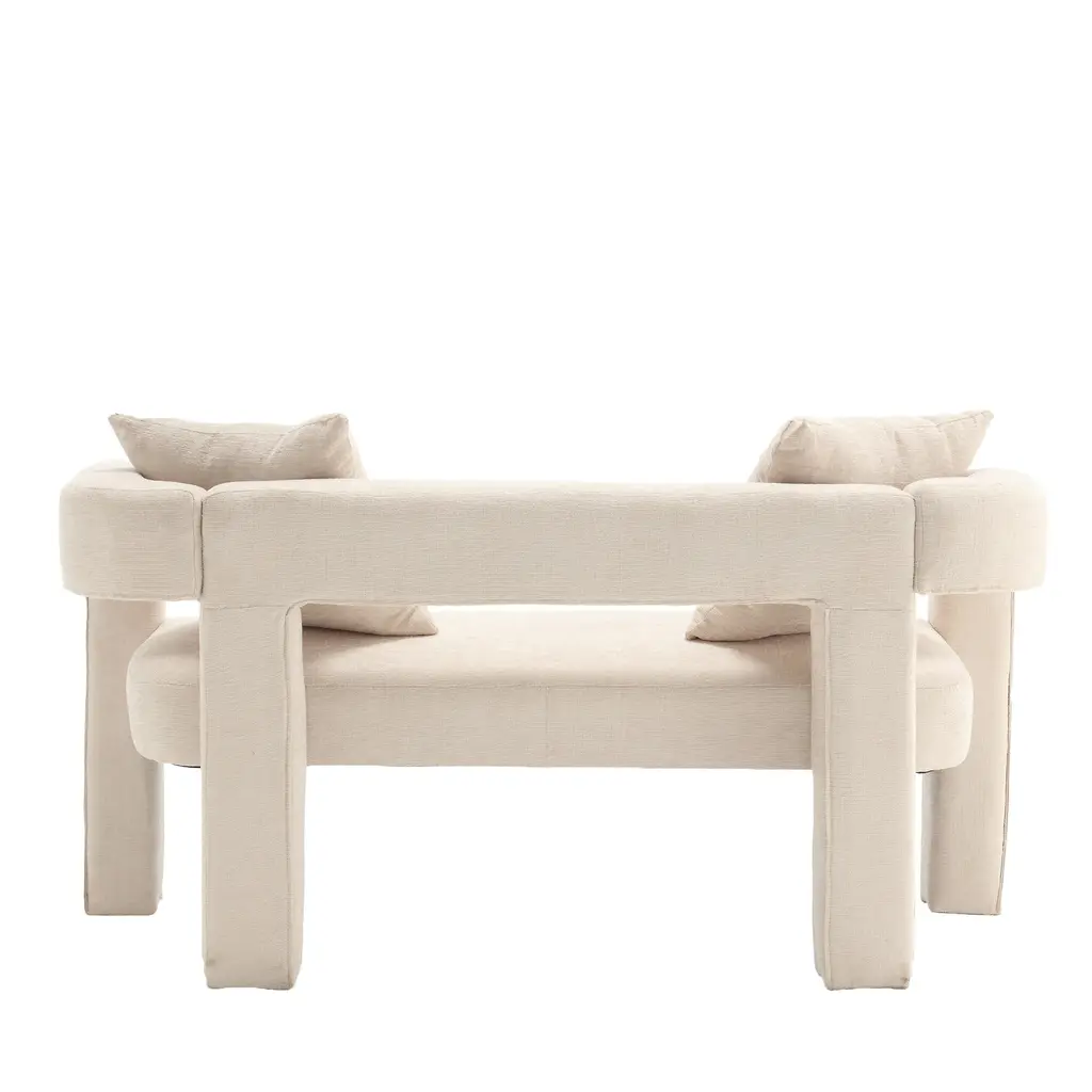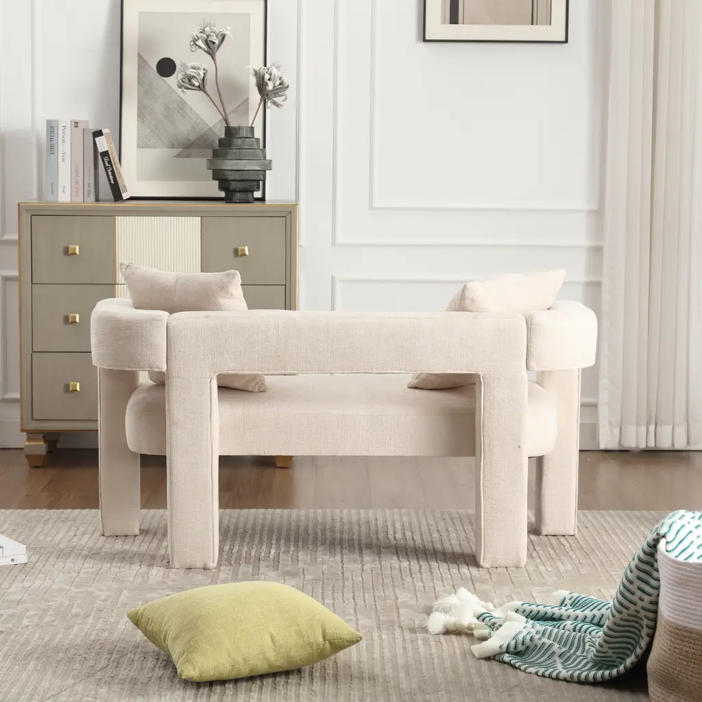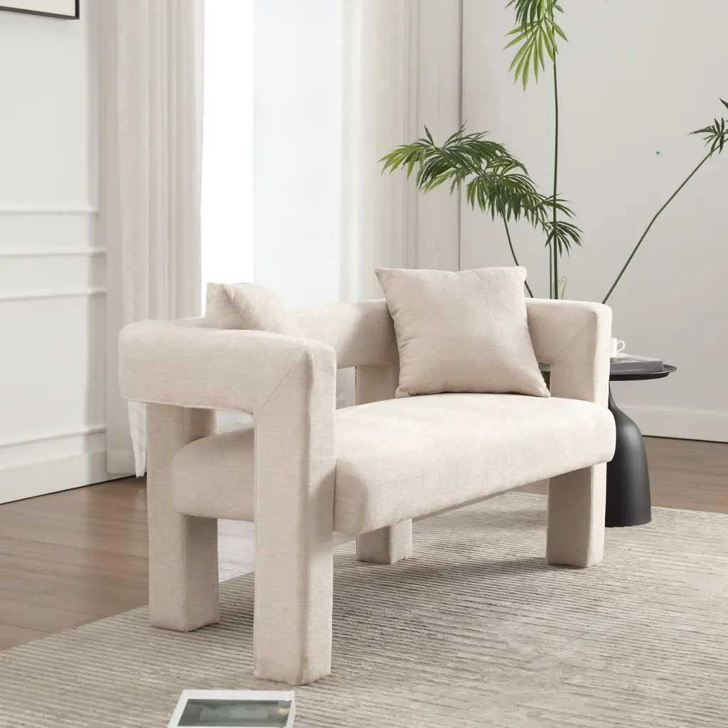 ▷2 Pillows This sofa is equipped with 2 small detachable pillows, allowing you to experience a visual feast of different designs. Excellent Structure Curved edges, padded with thick foam and upholstered with high-quality fabric, you can seat yourself in it comfortably for relaxation.The soft chenille fabric provides a comfortable sitting sensation, and the back backrest provides good support for your back to sit comfortably. Multifunctional Use This living room accent sofa, in fashionable and classic style, is suitable for various scenarios like dining room, living room, bedroom, dressing room, vanity room, etc. This is the best choice for your decorating a room or gifting to families and friends. Weights & Dimensions Upholstery Material Chenille Fabric Seat Fill Material Foam Weight Capacity 400 lb Frame Material PlyWood frame Arms Included Yes Removable Cushion Location Seat Country of Origin China Product size 51.18'' H*23.62'' W*25.59'' Back Height - Seat to Top of Back 9.06'' Leg Height 10.06'' Arm Height 9.06'' Seat Depth 19.29'' Seat Width 43.31'' Seat Height 9.06'' Feet material Plywood Net ▷Gross weight 46.20 ▷52.90LBS ▷Eco-friendly Solid Wood Frame: This double sofa is made of high-quality solid wood frame, which is sturdy, durable and environmentally friendly, providing you with long-lasting stability and safety. ▷Soft Chenille Fabric: The surface is covered with high-grade chenille fabric, which is soft, comfortable and delicate to the touch, adding warmth and luxury to your home space. ▷Arc Backrest Design: unique arc backrest design, elegant and comfortable, perfectly fit the human body curve, provide the ultimate backrest support. ▷Hollow Design: the hollow design between the backrest and cushion enhances the transparency and modernity of the sofa, adding a touch of fashion to your space. ▷Full Soft Package Foot Design: four sofa feet are fully soft package design, not only to protect your floor from scratches, but also to enhance the overall beauty of the sofa. ▷High-density Sponge Cushion: Filled with high-density sponge, soft and strong support to ensure that the sofa remains comfortable for a long time without deformation. ▷Equipped with Original Pillows: comes with 2 original pillows, perfect match with the sofa, adding a sense of comfort while also enhancing the visual effect of the sofa. ▷Multiple Color Choices: 5 colors are available for you to choose from, suitable for different home styles and personal preferences, easy to match your interior decor. ▷Suitable for All Spaces: Whether it is living room, study room or bedroom, this double sofa can be perfectly integrated to create a cozy lounge corner for you. ▷Easy to Install: Conveniently designed and equipped with detailed installation instructions and tools, the installation process is quick and easy, making it easy for you to own this cozy double sofa.