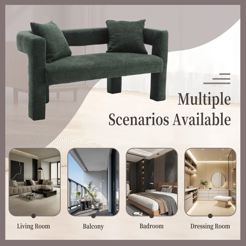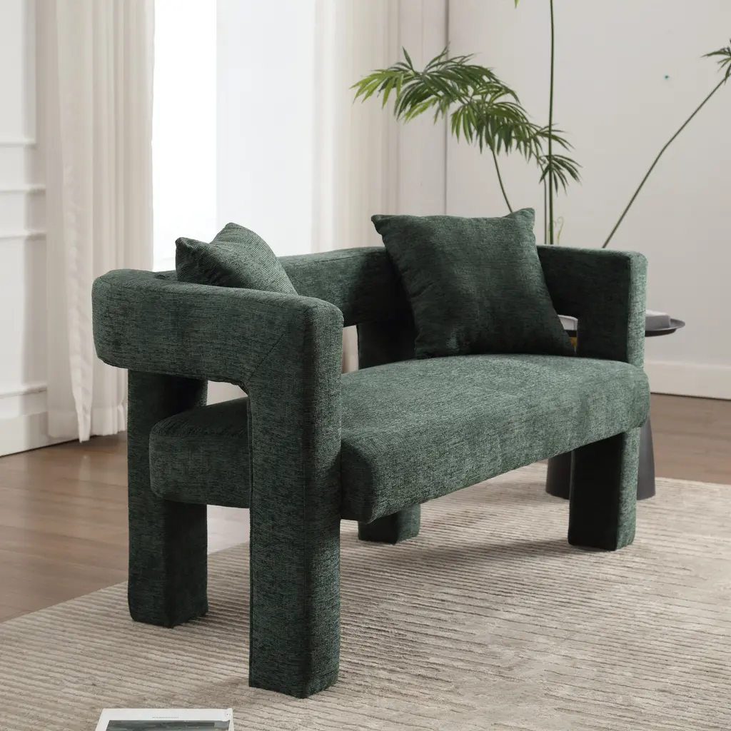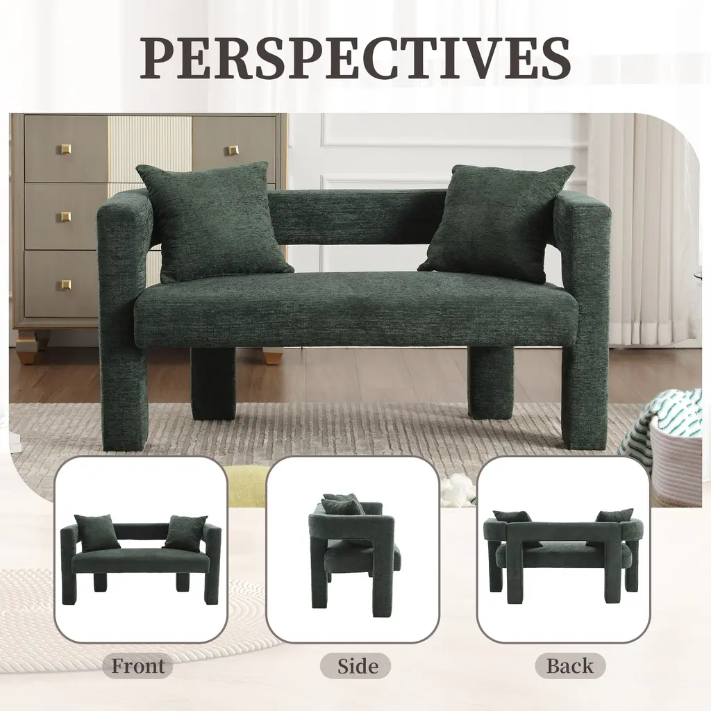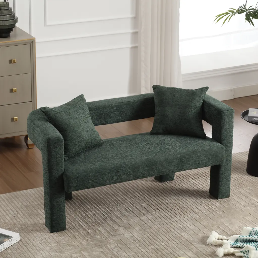 ▷2 Pillows This sofa is equipped with 2 small detachable pillows, allowing you to experience a visual feast of different designs. Excellent Structure Curved edges, padded with thick foam and upholstered with high-quality fabric, you can seat yourself in it comfortably for relaxation.The soft chenille fabric provides a comfortable sitting sensation, and the back backrest provides good support for your back to sit comfortably. Multifunctional Use This living room accent sofa, in fashionable and classic style, is suitable for various scenarios like dining room, living room, bedroom, dressing room, vanity room, etc. This is the best choice for your decorating a room or gifting to families and friends. Weights & Dimensions Upholstery Material Chenille Fabric Seat Fill Material Foam Weight Capacity 400 lb Frame Material PlyWood frame Arms Included Yes Removable Cushion Location Seat Country of Origin China Product size 51.18'' H*23.62'' W*25.59'' Back Height - Seat to Top of Back 9.06'' Leg Height 10.06'' Arm Height 9.06'' Seat Depth 19.29'' Seat Width 43.31'' Seat Height 9.06'' Feet material Plywood Net ▷Gross weight 46.20 ▷52.90LBS ▷Eco-friendly Solid Wood Frame: This double sofa is made of high-quality solid wood frame, which is sturdy, durable and environmentally friendly, providing you with long-lasting stability and safety. ▷Soft Chenille Fabric: The surface is covered with high-grade chenille fabric, which is soft, comfortable and delicate to the touch, adding warmth and luxury to your home space. ▷Arc Backrest Design: unique arc backrest design, elegant and comfortable, perfectly fit the human body curve, provide the ultimate backrest support. ▷Hollow Design: the hollow design between the backrest and cushion enhances the transparency and modernity of the sofa, adding a touch of fashion to your space. ▷Full Soft Package Foot Design: four sofa feet are fully soft package design, not only to protect your floor from scratches, but also to enhance the overall beauty of the sofa. ▷High-density Sponge Cushion: Filled with high-density sponge, soft and strong support to ensure that the sofa remains comfortable for a long time without deformation. ▷Equipped with Original Pillows: comes with 2 original pillows, perfect match with the sofa, adding a sense of comfort while also enhancing the visual effect of the sofa. ▷Multiple Color Choices: 5 colors are available for you to choose from, suitable for different home styles and personal preferences, easy to match your interior decor. ▷Suitable for All Spaces: Whether it is living room, study room or bedroom, this double sofa can be perfectly integrated to create a cozy lounge corner for you. ▷Easy to Install: Conveniently designed and equipped with detailed installation instructions and tools, the installation process is quick and easy, making it easy for you to own this cozy double sofa.