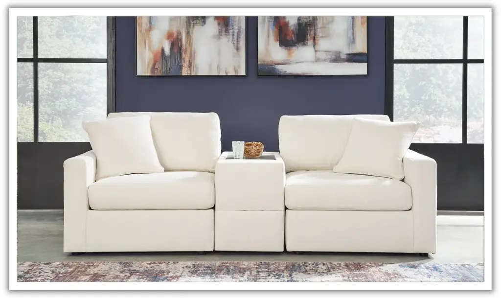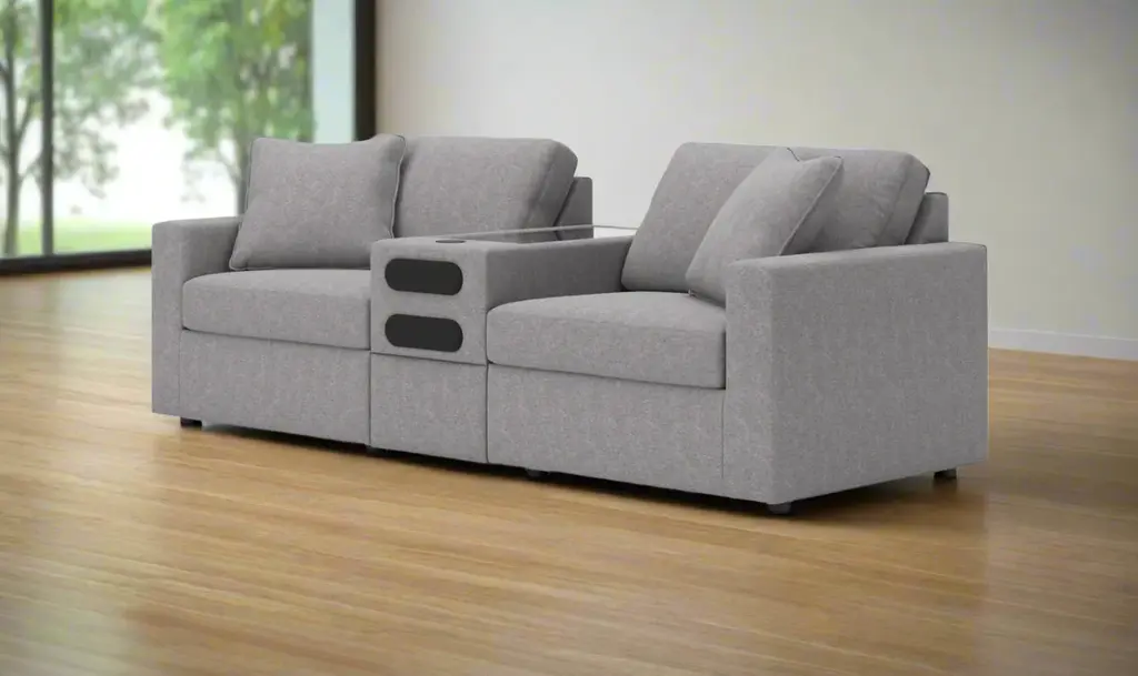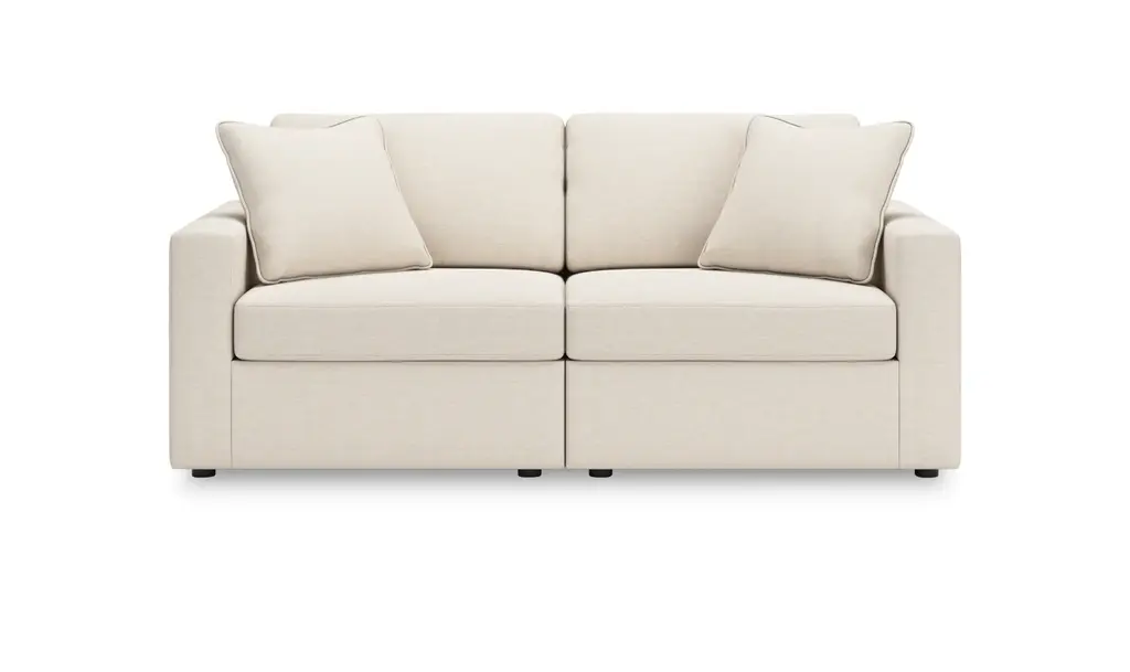 Effortlessly cool, endlessly adaptable. The Modern Heritage Modmax Loveseat combines stylish minimalism with unmatched versatility and comfort—perfect for today’s relaxed, high-functioning living spaces. This 2-Seater was designed for those who love contemporary aesthetics but crave practical lounging, this modular sofa delivers comfort, convenience, and customization in one sleek package. Upholstered in advanced Next-Gen Nuvella™ performance fabric, this loveseat is made for real life—soft to the touch, easy to clean, and built to resist stains and wear. Whether it’s a cozy night in or you're entertaining guests, the Modmax adapts to your needs with its floating modular design. Each piece is finished on all sides and connects seamlessly, allowing you to rearrange the layout effortlessly. Regular Loveseat With Storage Console With Audio Console A second configuration variation includes a classic storage console in place of the audio unit—ideal for those who prioritize streamlined utility.