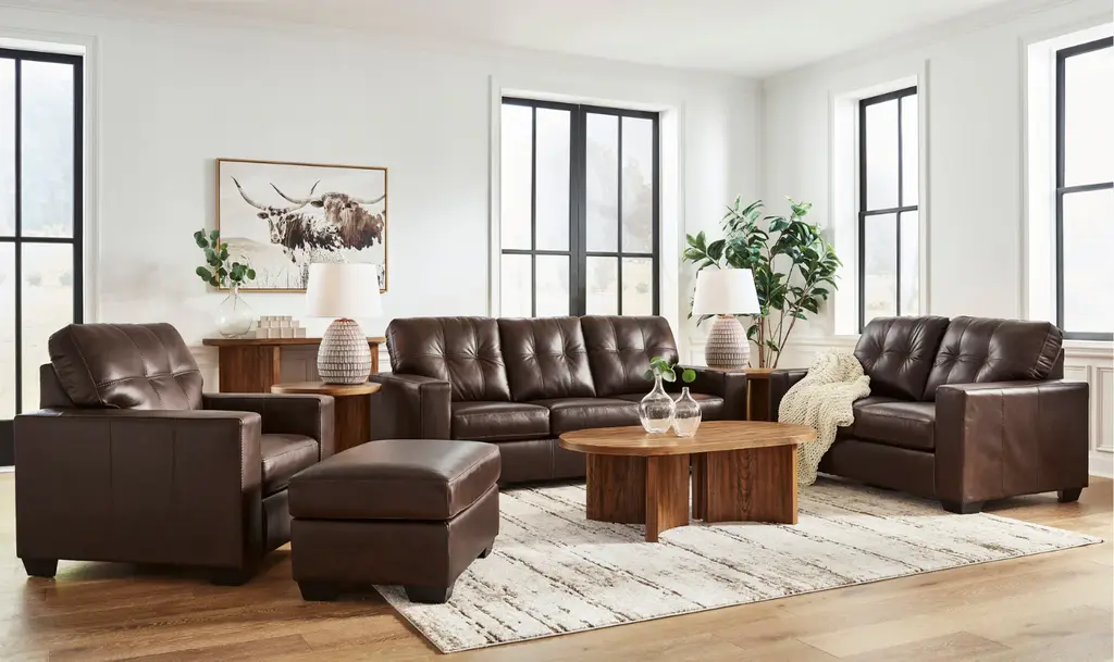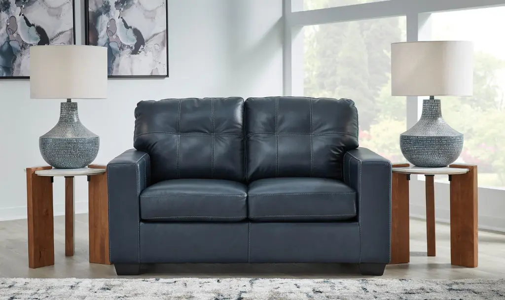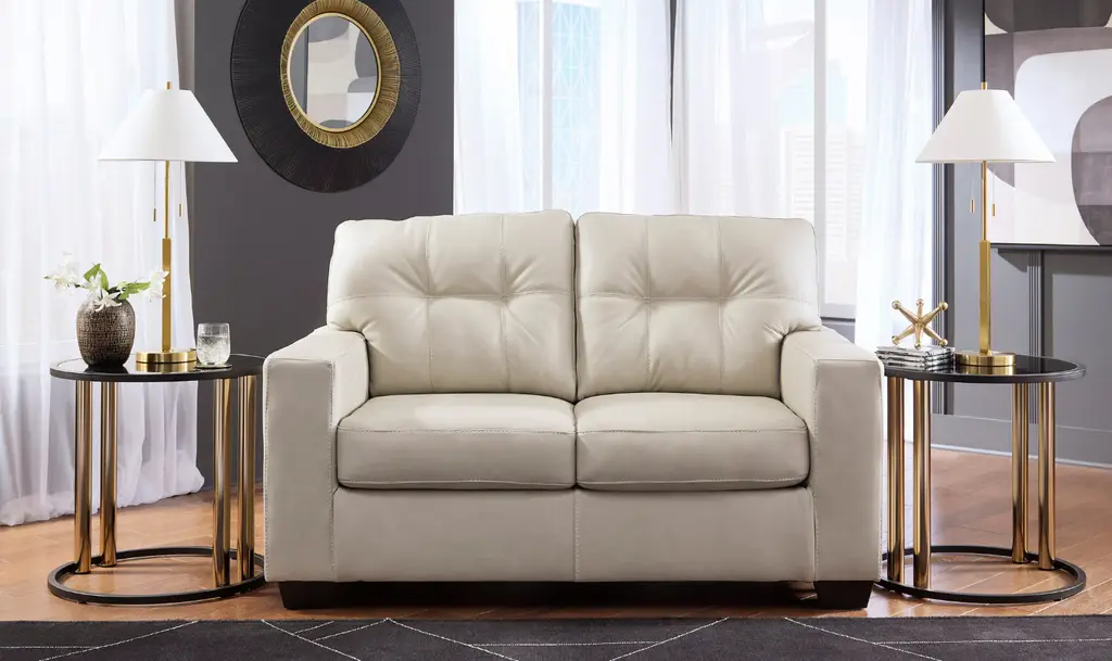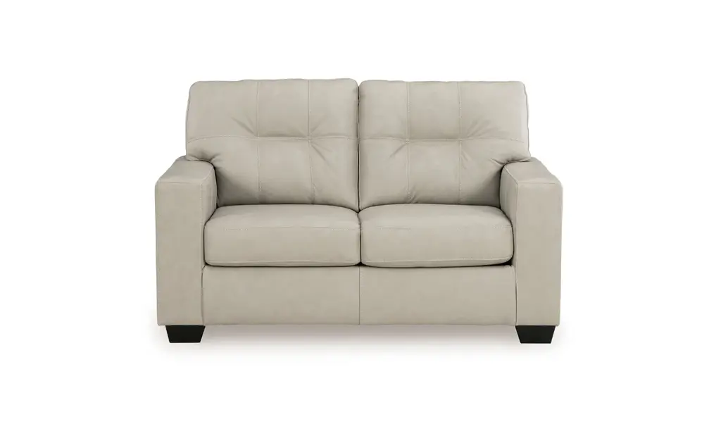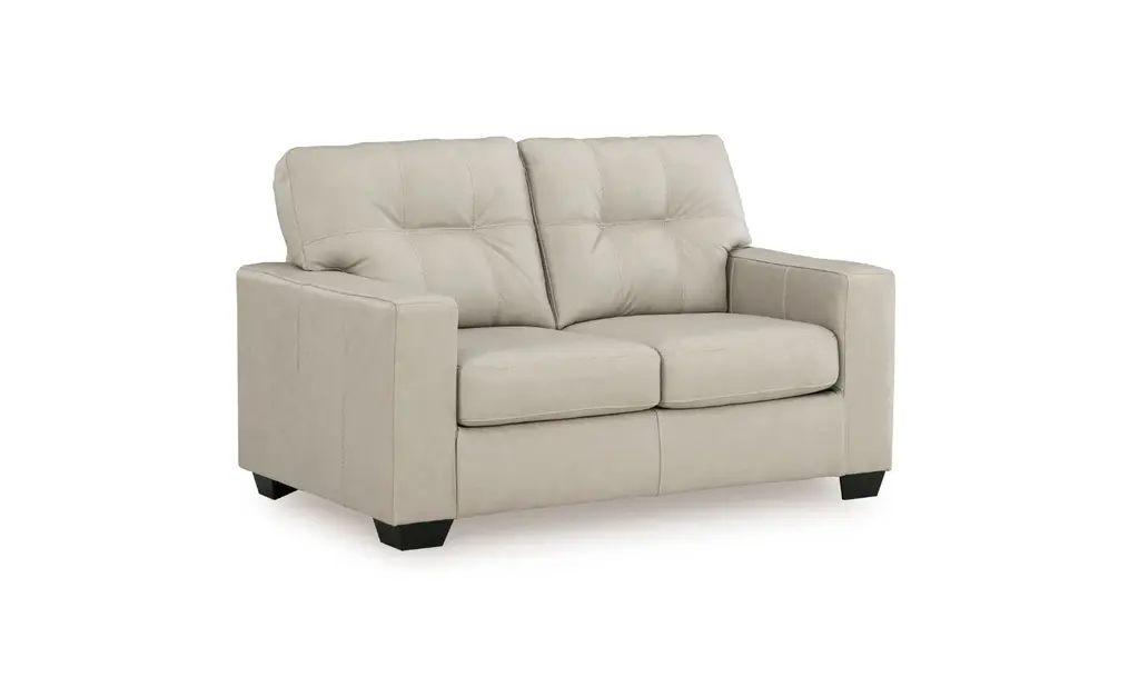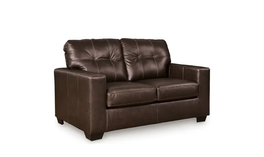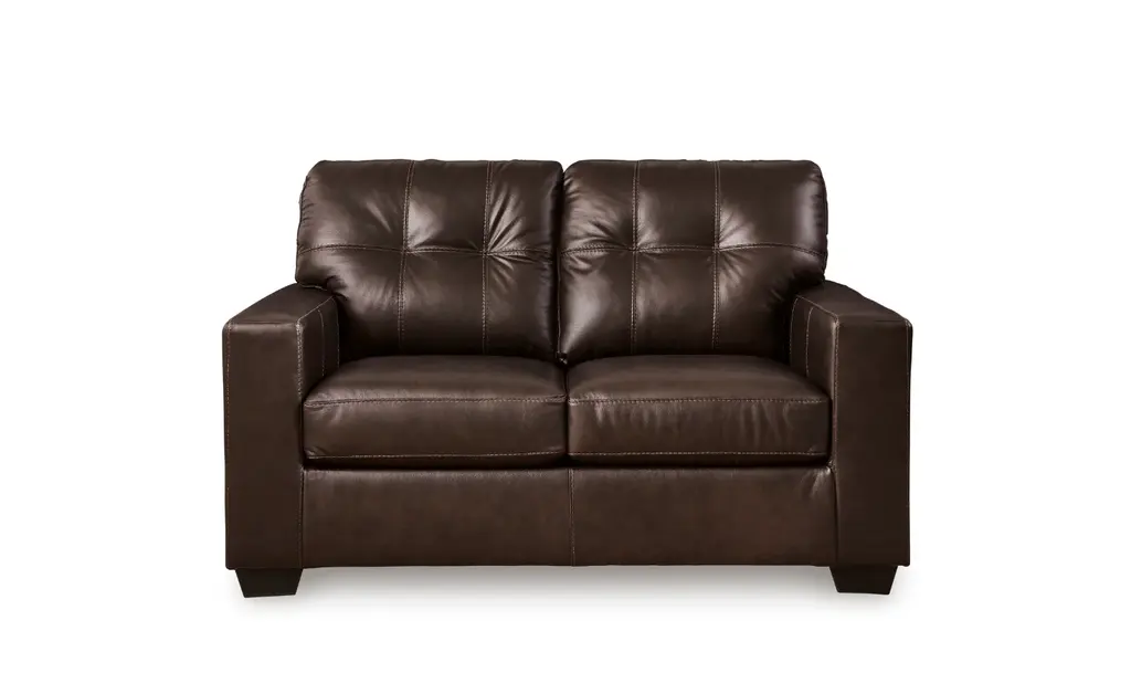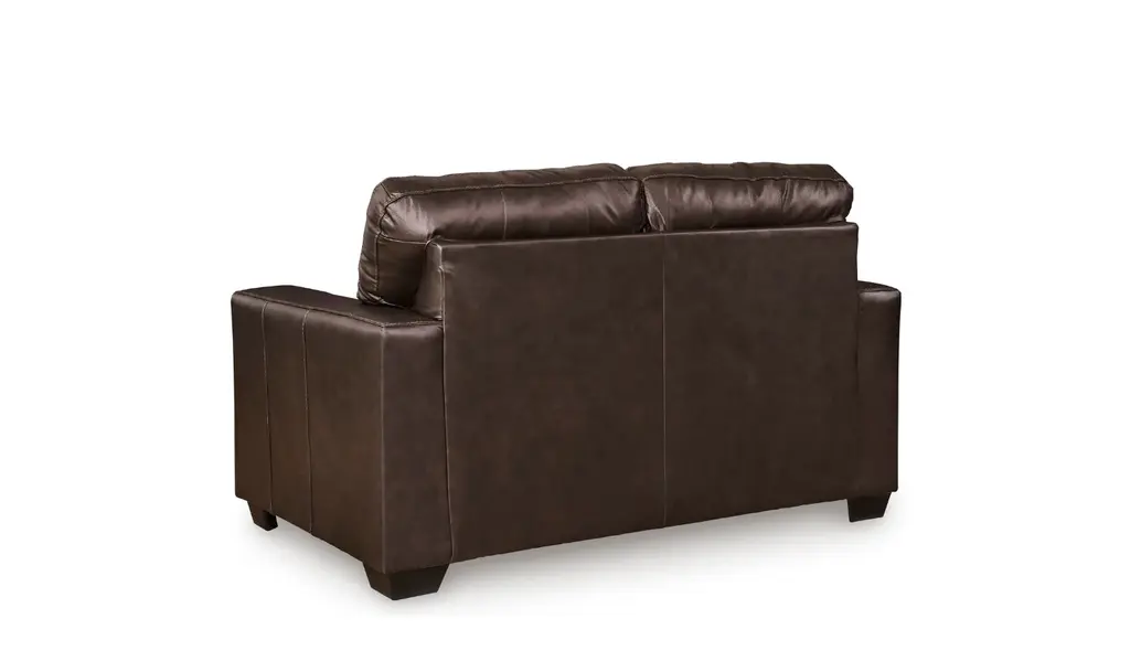 The Modern Heritage Santorine 2-Seater Loveseat with Track Arms is a versatile and stylish piece that fits seamlessly into both contemporary and traditional living spaces. Its clean, linear design, combined with track arms, gives it a modern yet timeless appeal. The combination of genuine leather and faux leather upholstery adds a sophisticated touch, with leather covering the seat, back, and arm cushions, while faux leather wraps the remaining areas for durability. The generously padded cushions, detailed with tufting, provide both visual interest and comfort, making this loveseat an inviting spot to relax. Designed with both form and function in mind, the Santorine loveseat is built on a corner-blocked frame for enhanced stability and durability. The attached back cushions offer a neat, tailored look, while the loose seat cushions filled with high-resiliency foam wrapped in polyfiber provide ample support and comfort. The platform foundation system delivers more even support and resists sagging better than traditional spring systems, ensuring the loveseat maintains its shape and comfort over time. Finished with exposed feet in a faux wood tone, the loveseat adds a refined touch to any room, making it a practical and attractive seating option for any home.