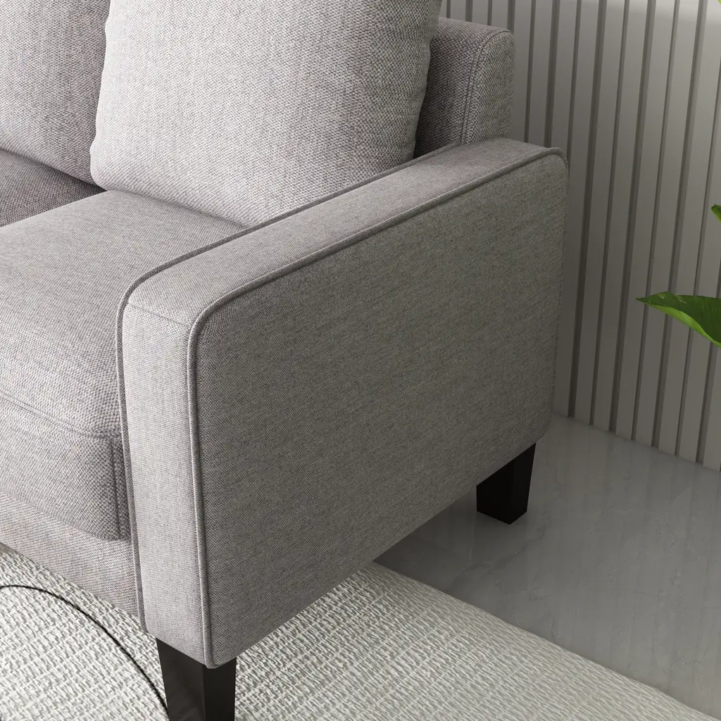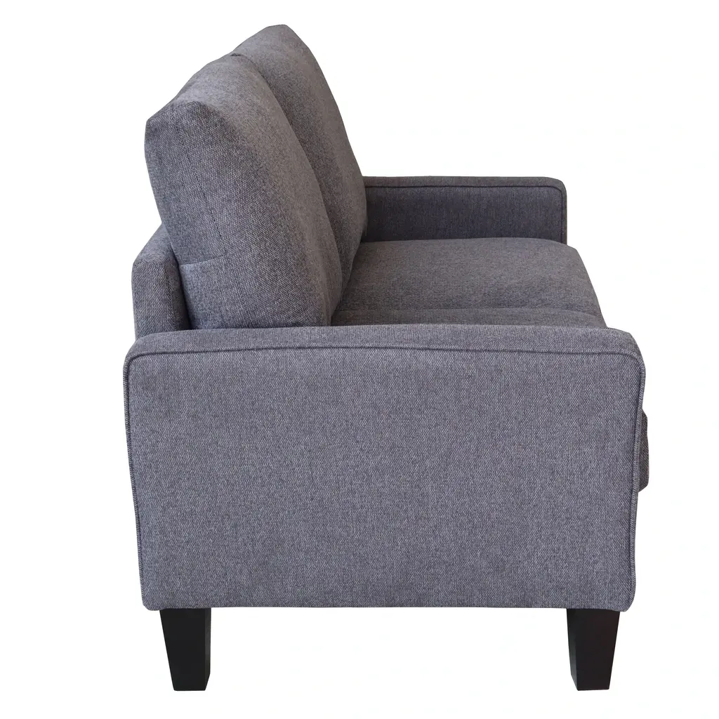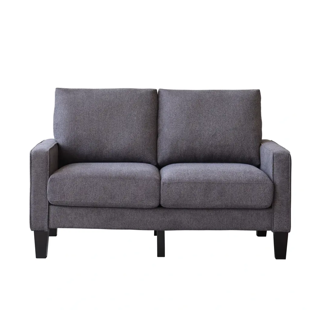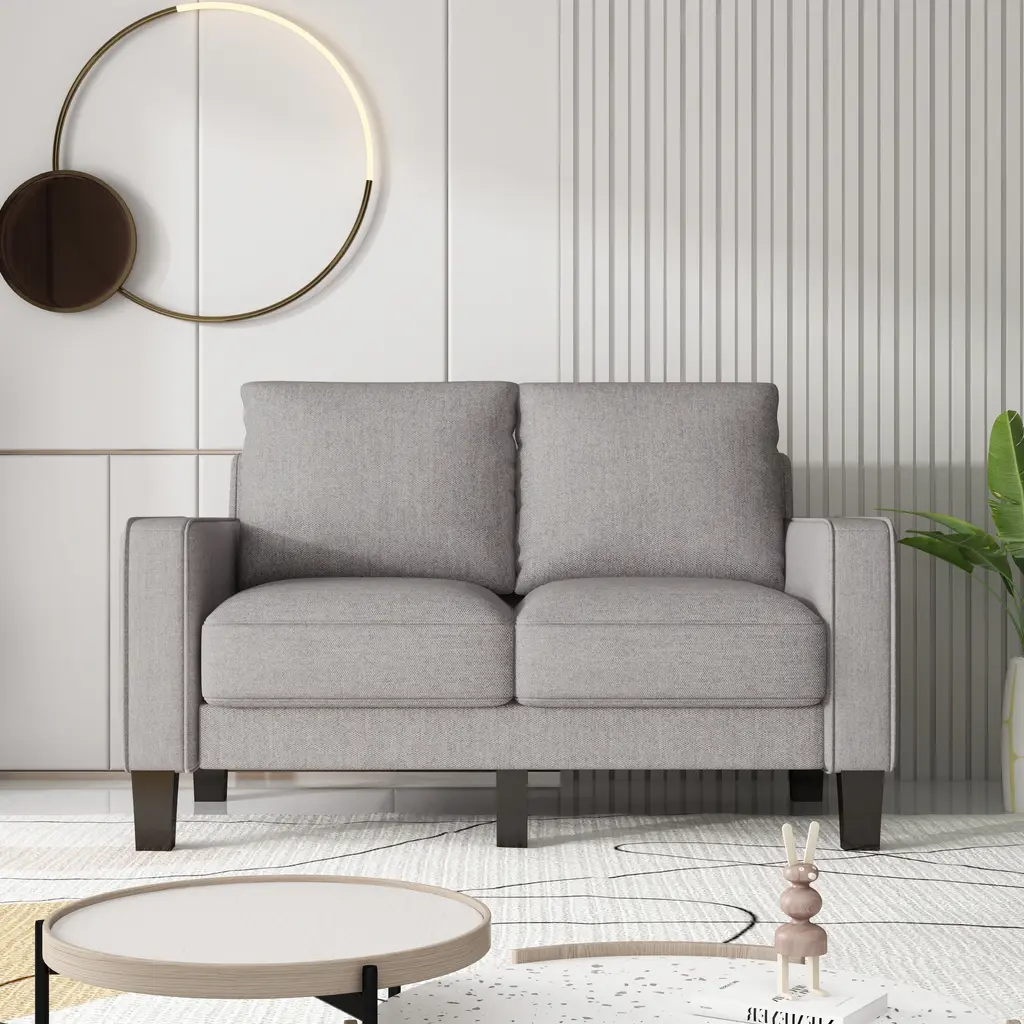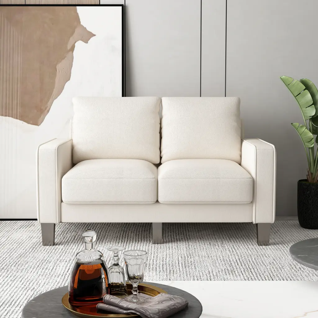 Experience comfort and style with our Modern Living Room Furniture Loveseat. Crafted from high-quality solid wood and metal, this loveseat boasts a sturdy structure and can support over 800lbs. Its high elastic sponge cushions, combined with soft and durable fabric, provide comfortable support for all. With compact dimensions, this loveseat is perfect for small spaces. Assembly is a breeze with all parts and instructions included. Enjoy the convenience of a wipe-clean fabric cleaner and a one-year warranty.Features: