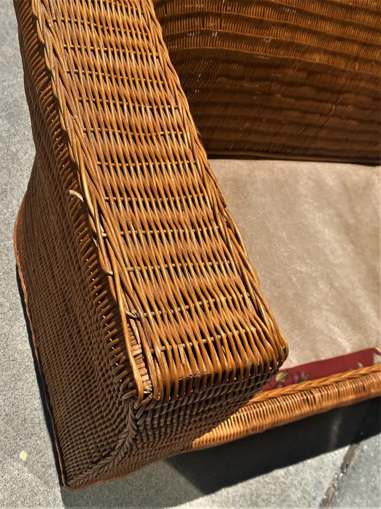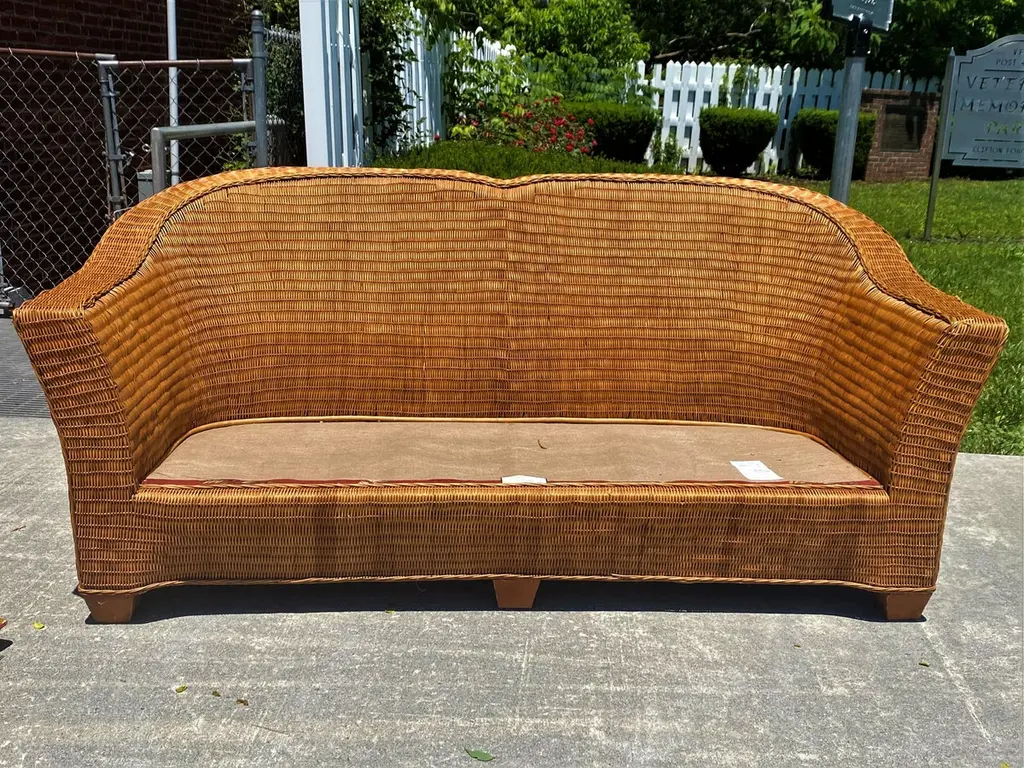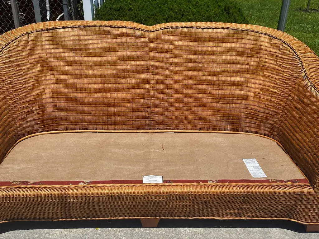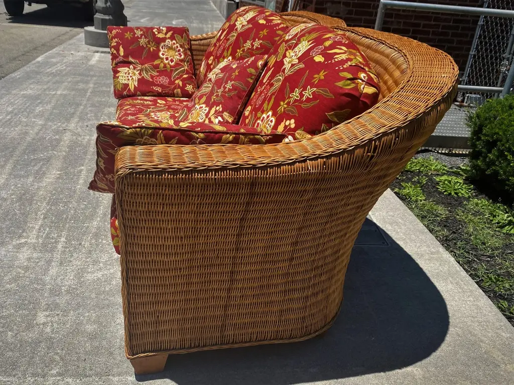 This is a wonderful modern style double hump back wicker sofa with beautiful brown & cranberry variegated background & floral upholstery which has a tag from M.C, Interiors & Fabrics, Gaithersburg, MD and a tag on the bottom of the sofa dating it 7/25/02. There is some wicker loss and breakage some of which is shown in the photos but the sofa is still sturdy and looks great! The piece is 83 inches wide, 41 inches deep and the back is 37 1/2 inches high. The seat is 68 inches wide, 26 inches deep and 18 inches high. The arms are 29 inches high. It does not come apart so if you want it inside, the door must be big enough.I have a matching chair and ottoman listed separately which is shown in the last photo.