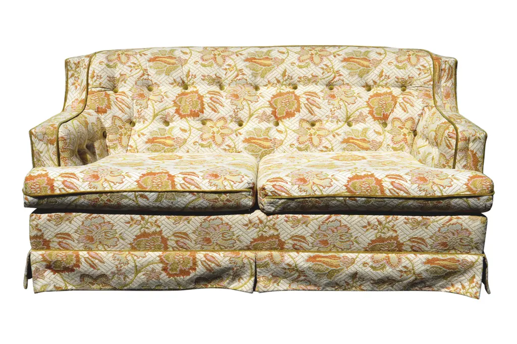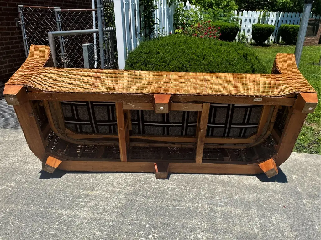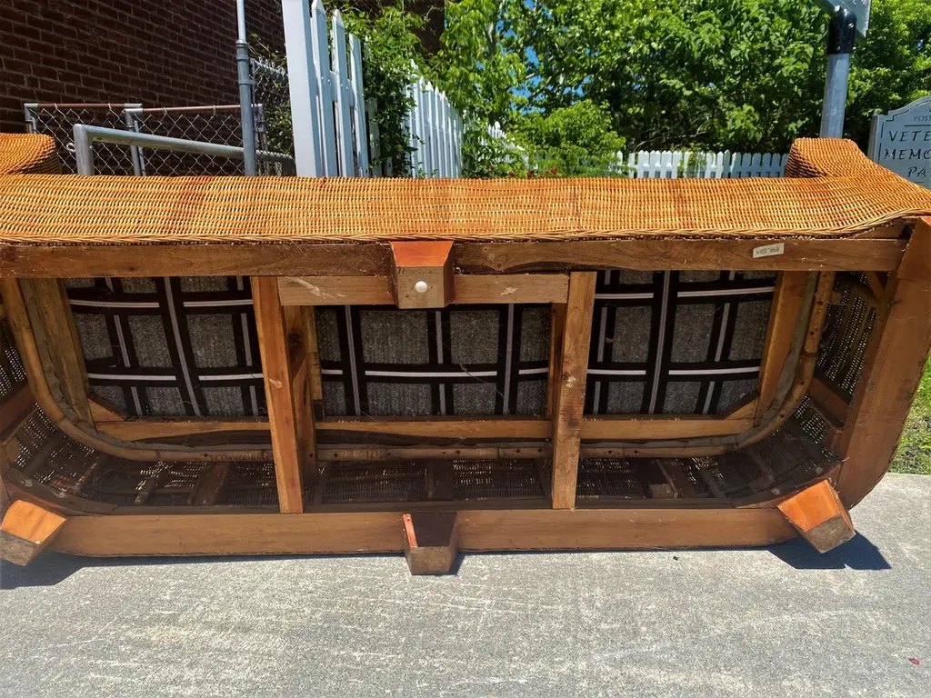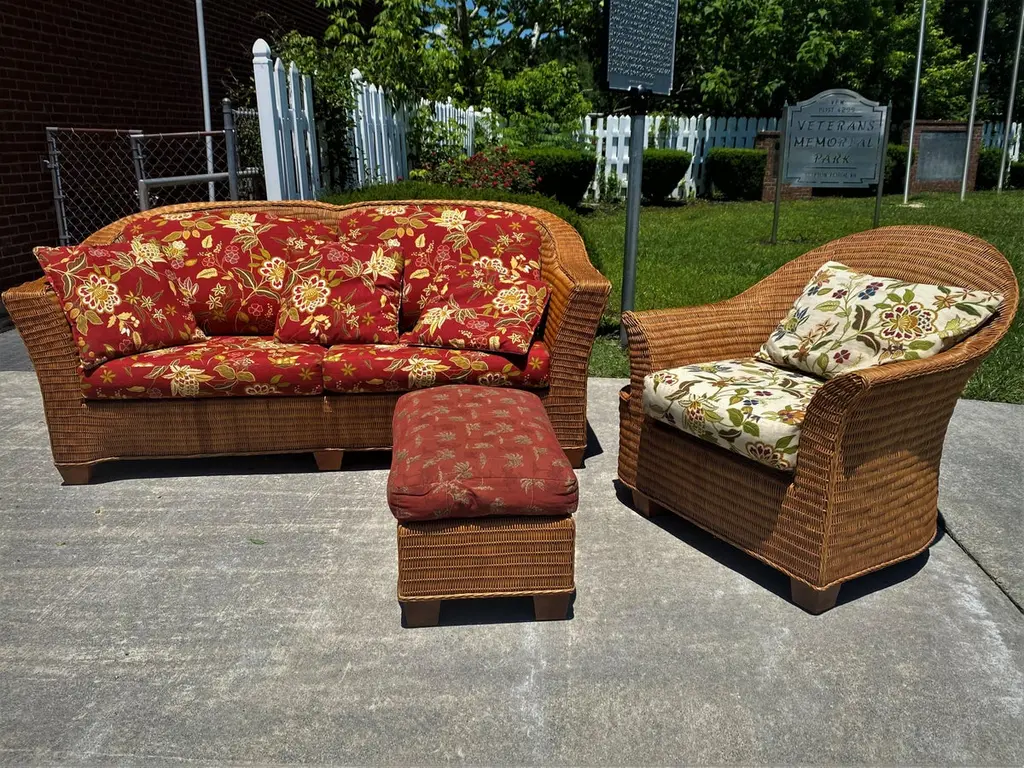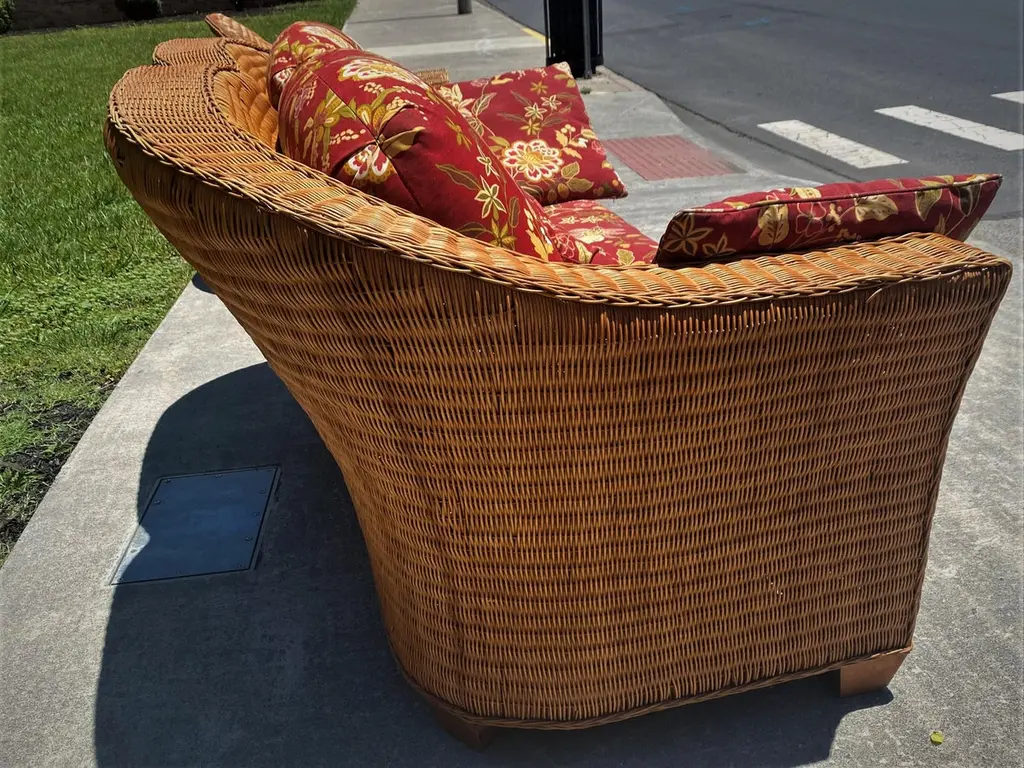 This is a wonderful modern style double hump back wicker sofa with beautiful brown & cranberry variegated background & floral upholstery which has a tag from M.C, Interiors & Fabrics, Gaithersburg, MD and a tag on the bottom of the sofa dating it 7/25/02. There is some wicker loss and breakage some of which is shown in the photos but the sofa is still sturdy and looks great! The piece is 83 inches wide, 41 inches deep and the back is 37 1/2 inches high. The seat is 68 inches wide, 26 inches deep and 18 inches high. The arms are 29 inches high. It does not come apart so if you want it inside, the door must be big enough.I have a matching chair and ottoman listed separately which is shown in the last photo.
