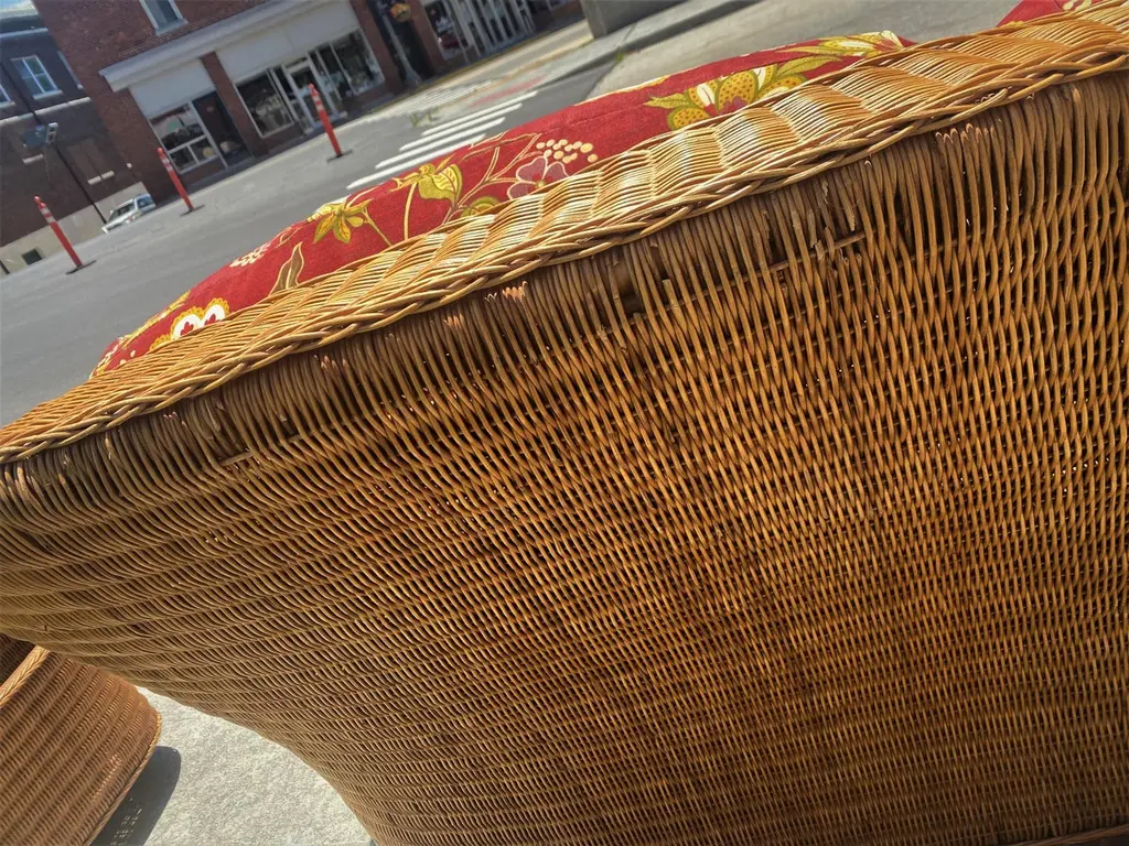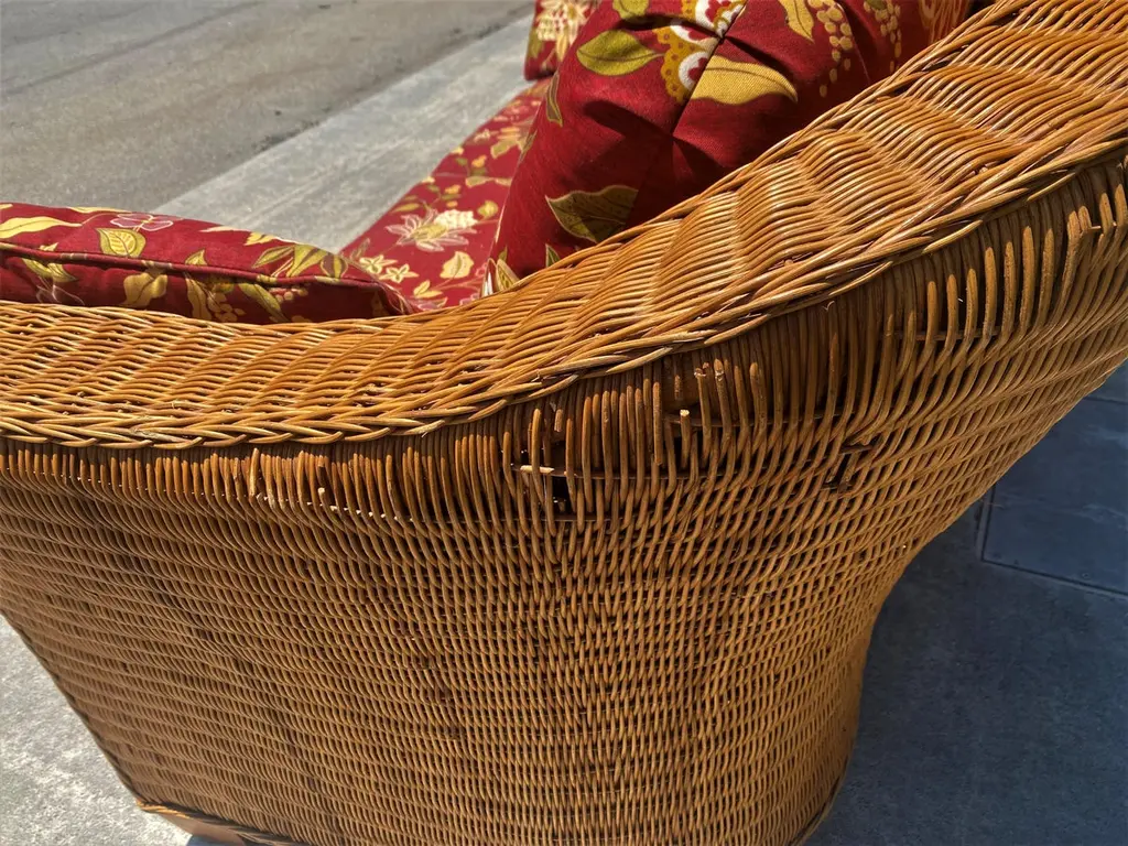 Modern Wicker Hump Back Red Floral Upholstered Loveseat