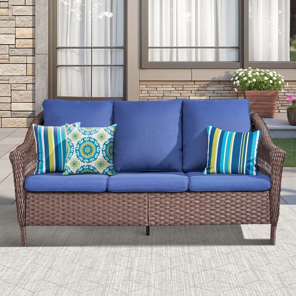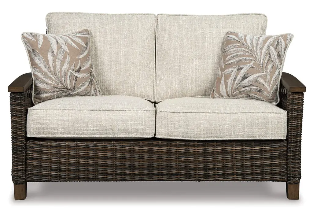 Casual beachside living meets contemporary style on the fabulous Montecello loveseat. This stylish seating for two is made with all-weather woven wicker in driftwood style shades of gray, tan and brown. Durable outdoor fabric, known for its incredible durability, resists fading, mold and mildew to create long lasting and comfortable outdoor seating that can be enjoyed for many seasons to come. Patterned toss pillows provide decorative flair while complementing the twine beige of the cushions.