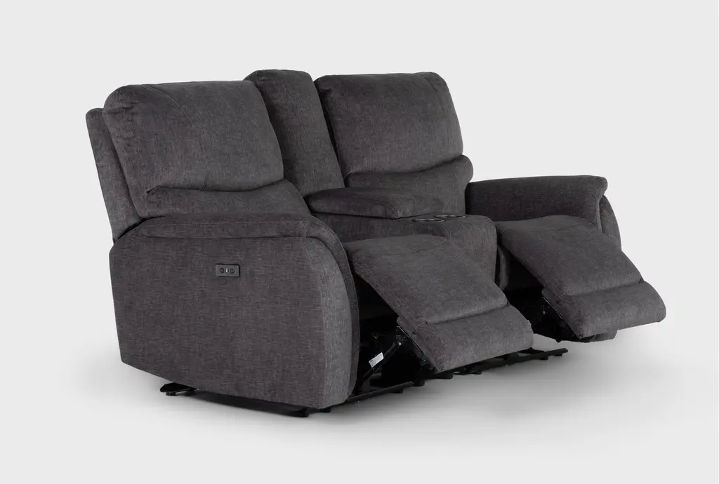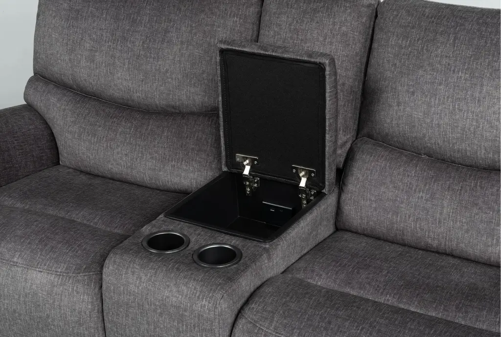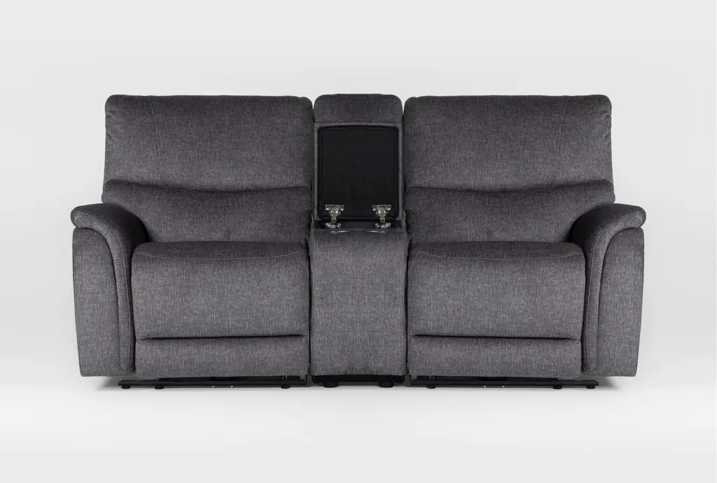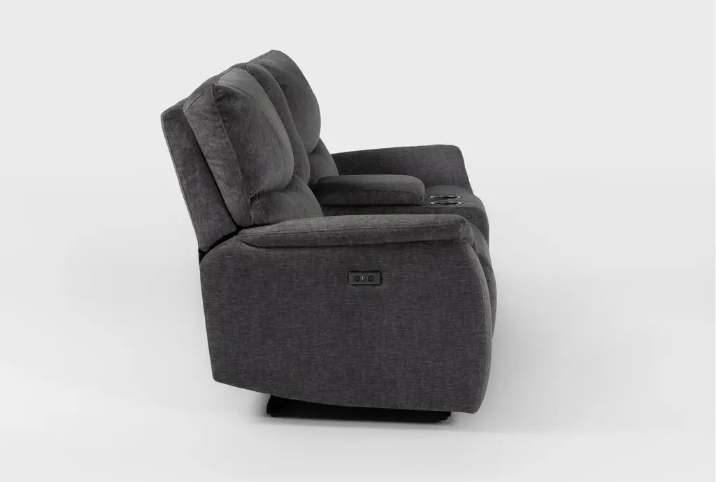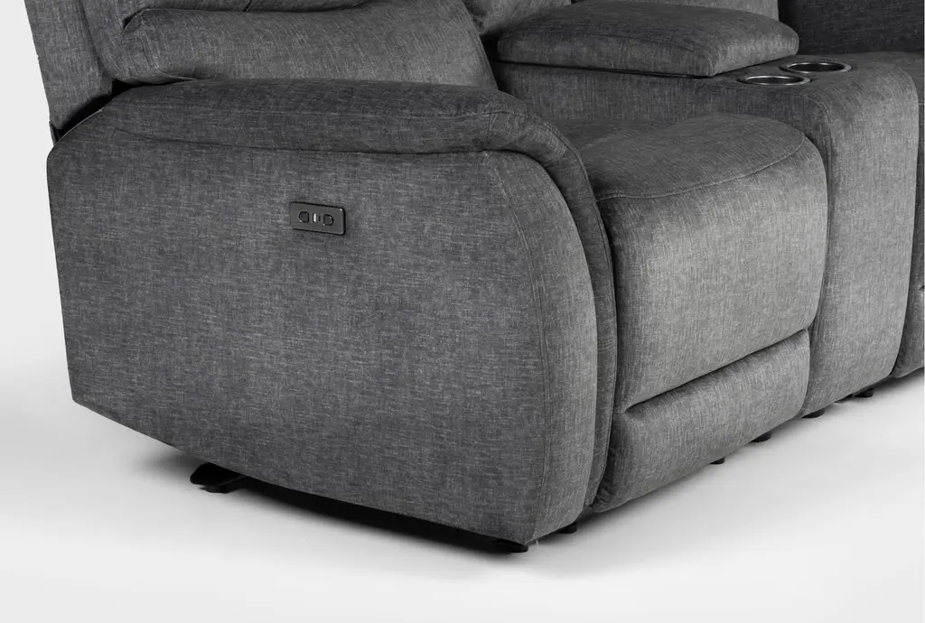 The Nash 3 Piece 77" Power Reclining Modular Console Loveseat offers superior comfort and functionality for your living room. Upholstered in gunmetal fabric, this loveseat is designed with relaxation in mind. The modular design allows for seamless integration into various living spaces.