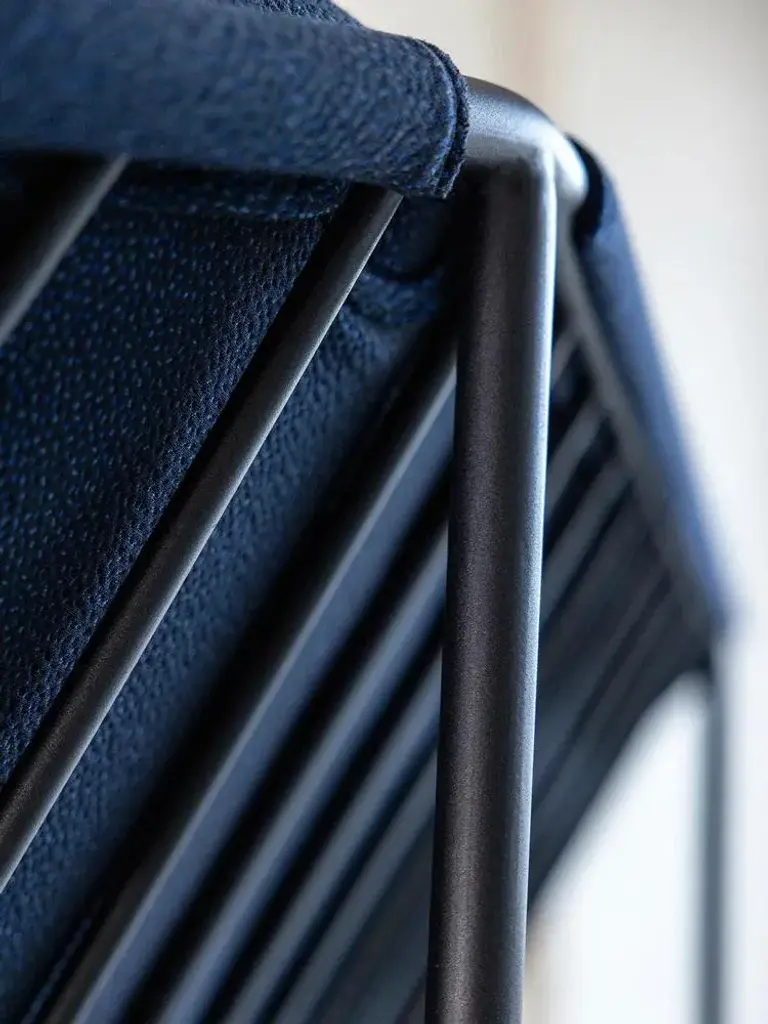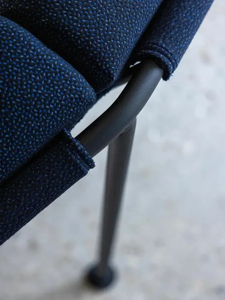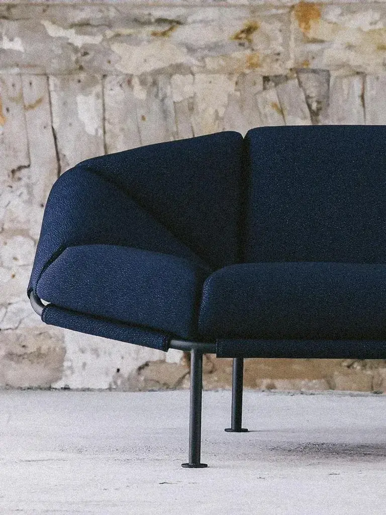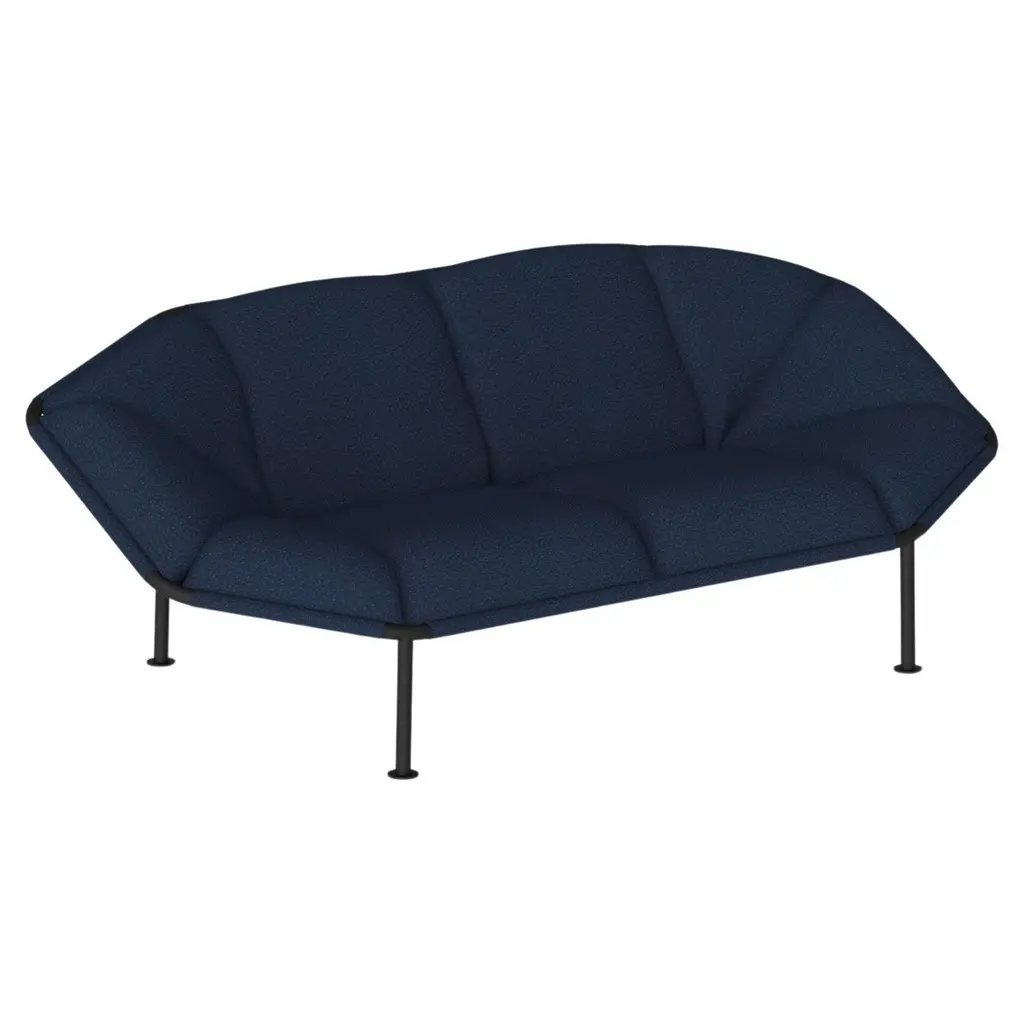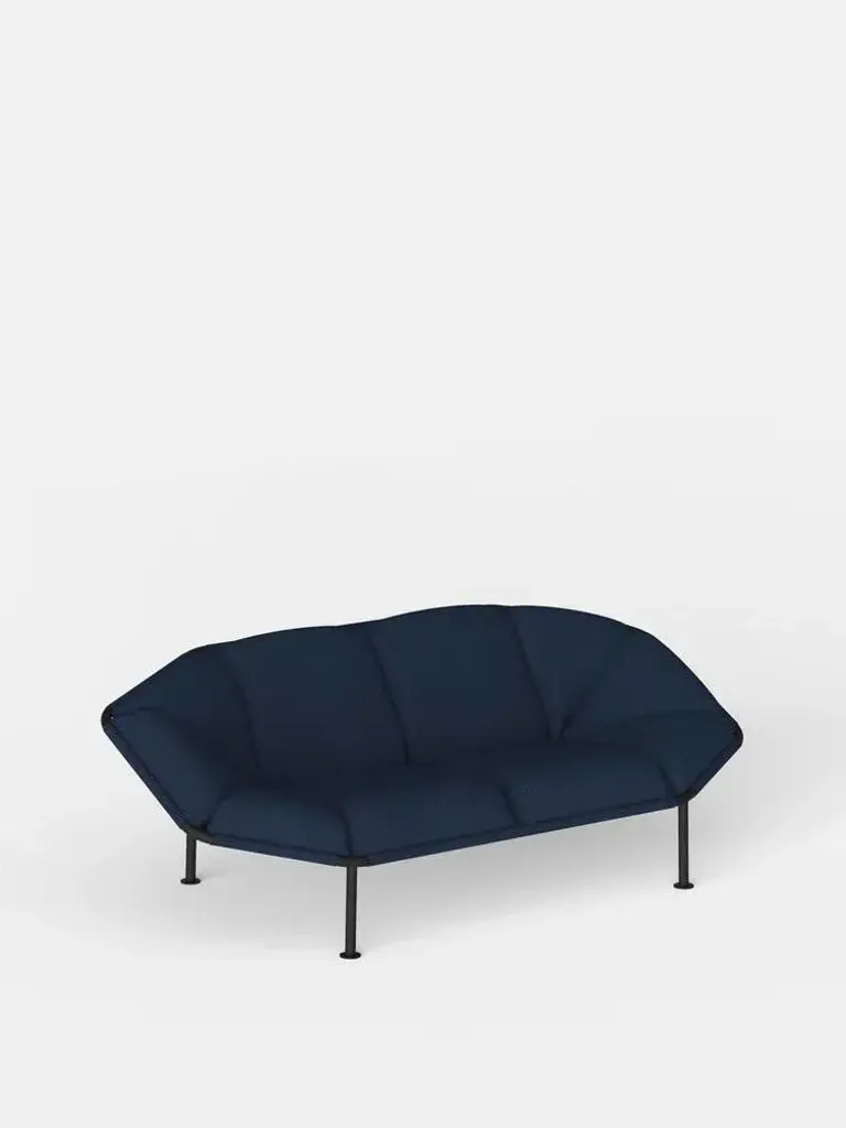 Navy blue atlas 2 seater sofa by kann design dimensions: d 94 x w 203 x h 78 cm. Materials: powder-coated steel, hr foam, fabric upholstery kvadrat sprinkles 794 (40% polyester filling, 30% wool, 20% polyester, 10% nylon). Available in other fabrics. atlas is a collection of sofas and armchairs that explores the possibilities of seating. Based on a research on comfort and durability, the structure is entirely made of powder-coated tubular steel. Fully visible, it is easily transportable and can be installed both indoors and outdoors. The seat is designed as an autonomous surface that can accommodate a multitude of positions. All of the cushions are attached to the frame using a clip system specially developed for the collection.