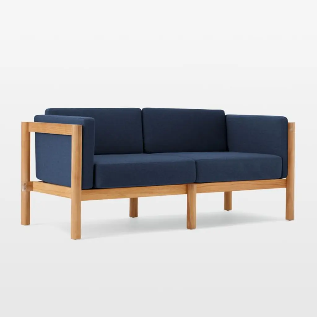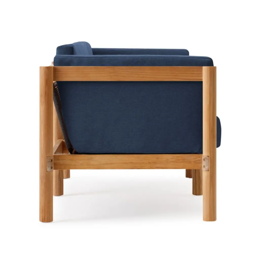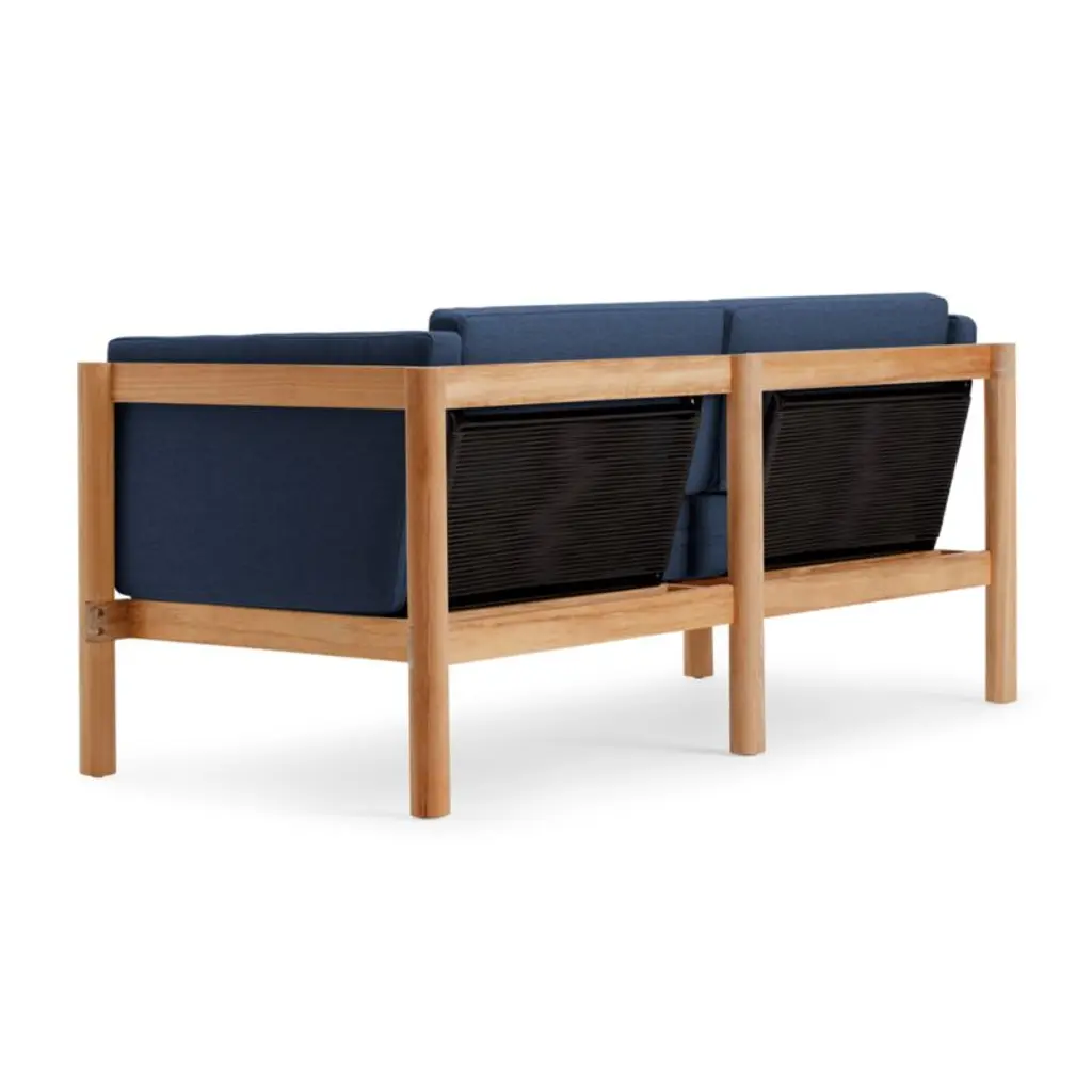 Angled at a slight recline, this deep-seated loveseat invites you to kick back and enjoy the great outdoors. Boxy seat and back cushions upholstered in navy blue are curl-up comfy, while slim side bolsters add a soft layer for draping arms. Natural teak shapes the chunky, rounded frame complemented by a hand-stretched polyester rope back. Offering living-room looks with surprising durability, the outdoor loveseat withstands the elements in weather-resistant teak and fast-drying foam cushions.Based in Phoenix, Neighbor crafts beautiful, durable furniture for outdoor living with premium materials such as Sunbrella fabrics and FSC®-certified teak. We're thrilled to partner with Neighbor in bringing you Haven, one of the company's first collections designed to build connection and expand livable square footage to outdoor spaces.By choosing FSC®-certified furniture, you are supporting responsible management of the world's forests.