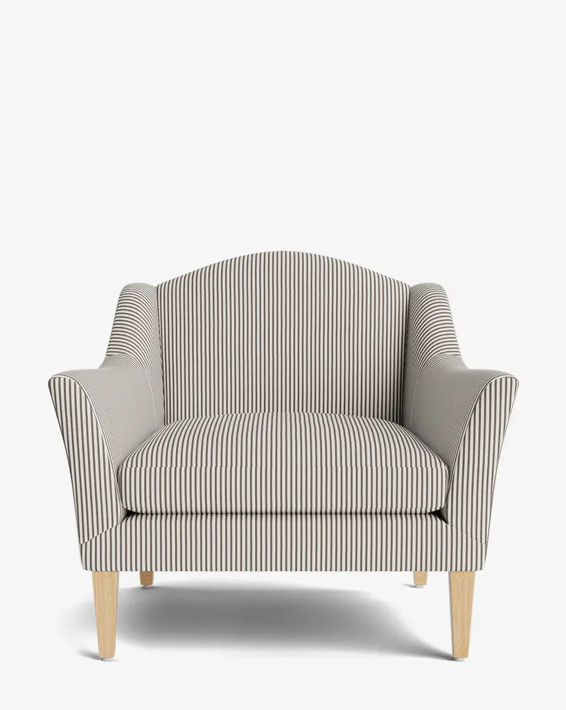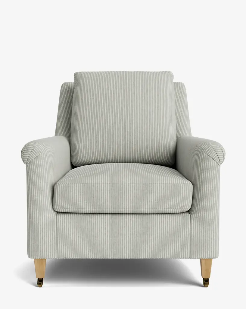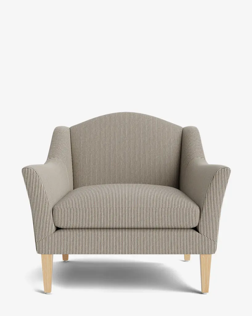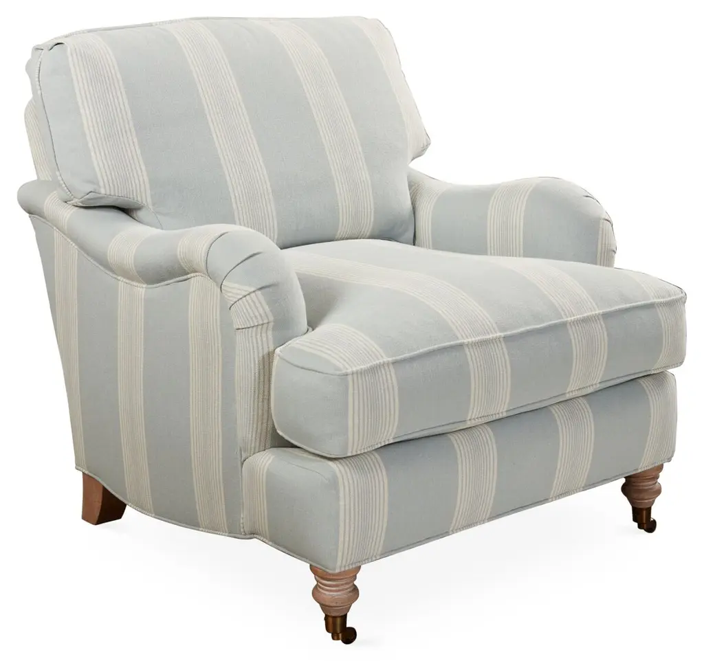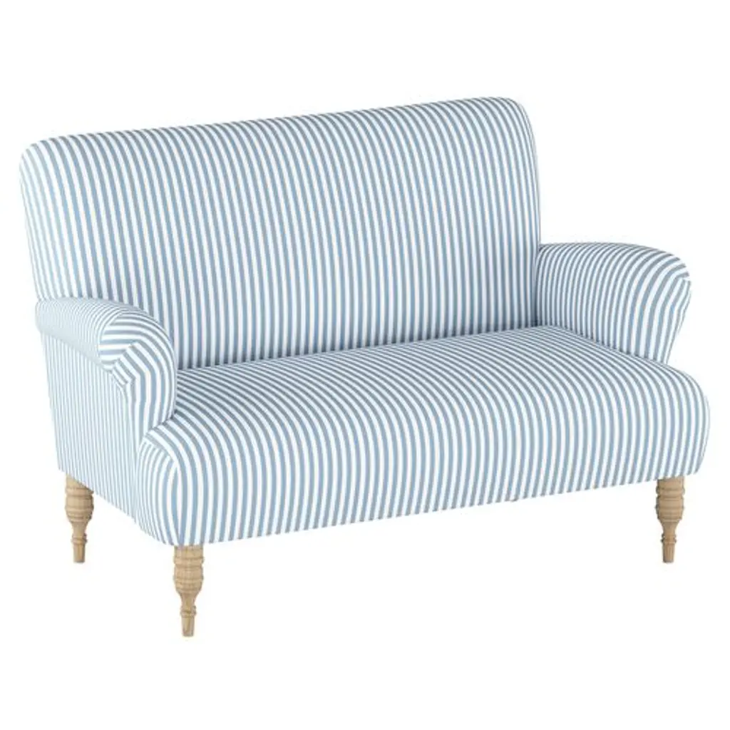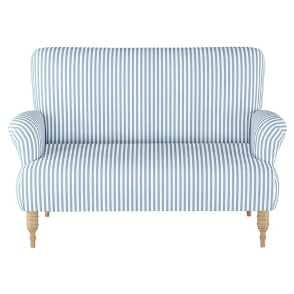 Resting on turned pine legs, this settee boasts versatile proportions, English arms, and neatly tailored upholstery. A generous foam-and-fiber fill ensures long-lasting comfort and support. Handcrafted in the USA.