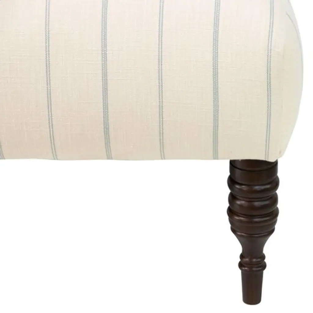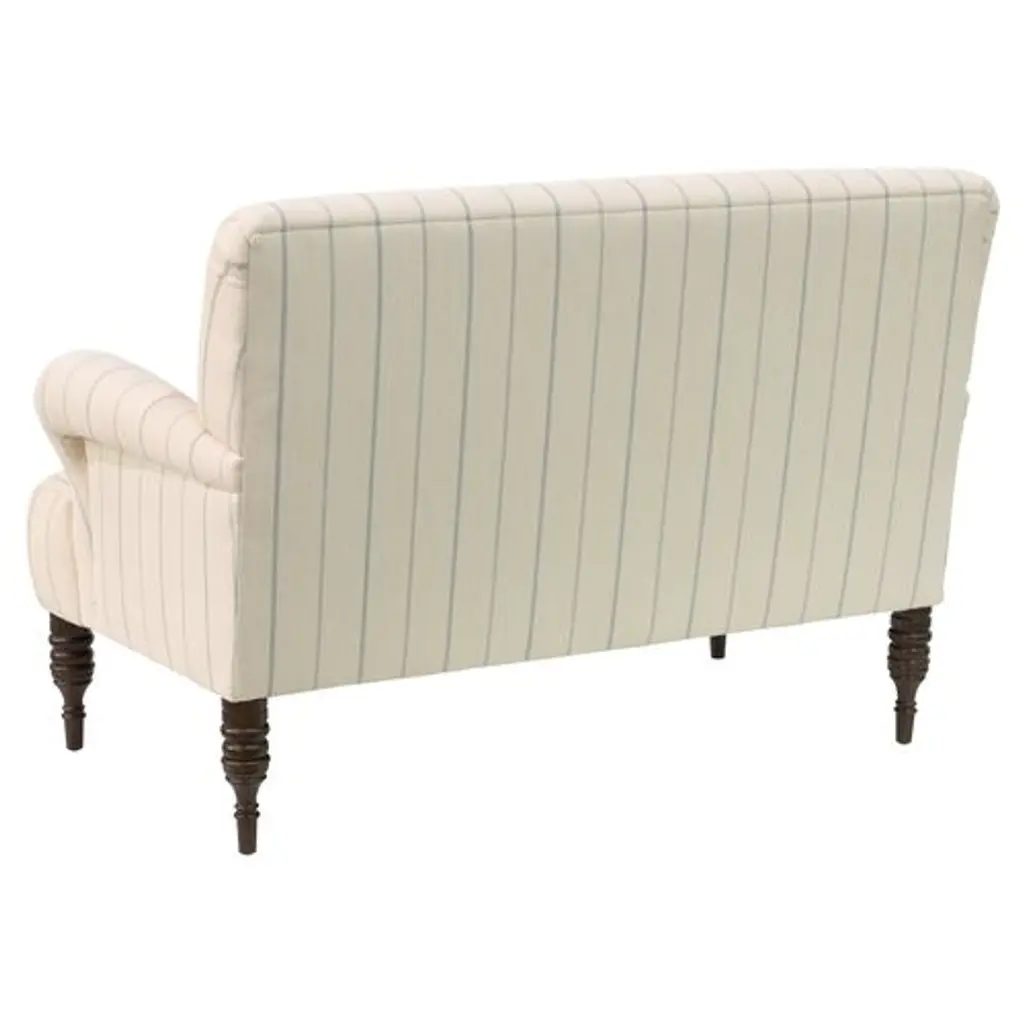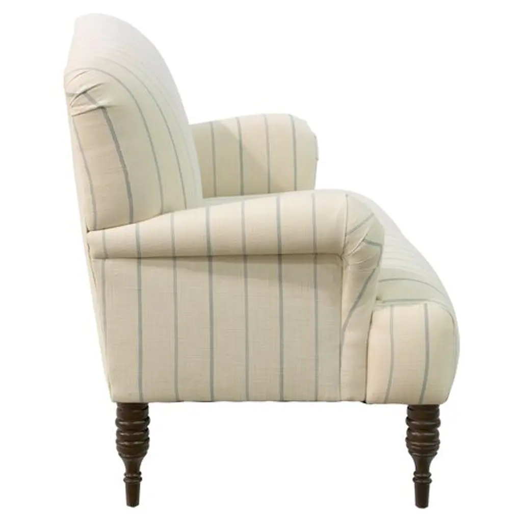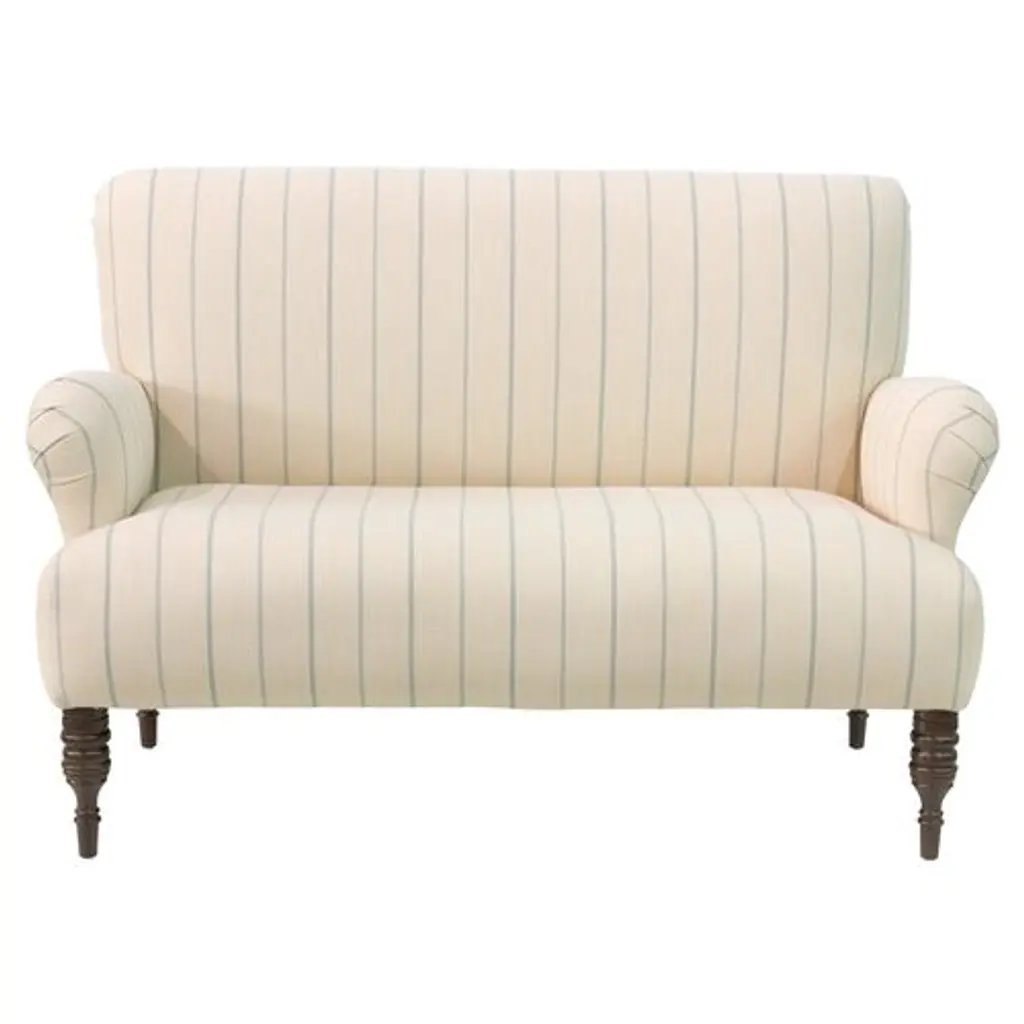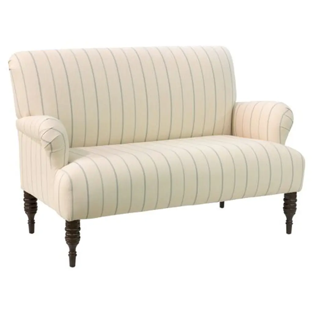 Resting on turned pine legs, this settee boasts versatile proportions, English arms, and neatly tailored upholstery. A generous foam-and-fiber fill ensures long-lasting comfort and support. Handcrafted in the USA.