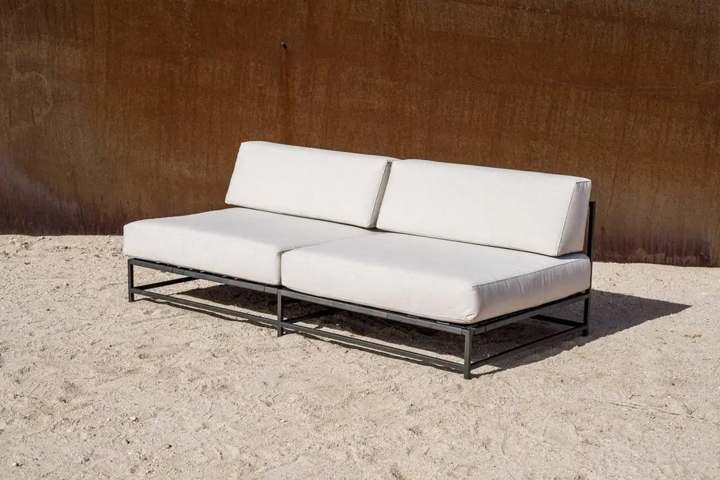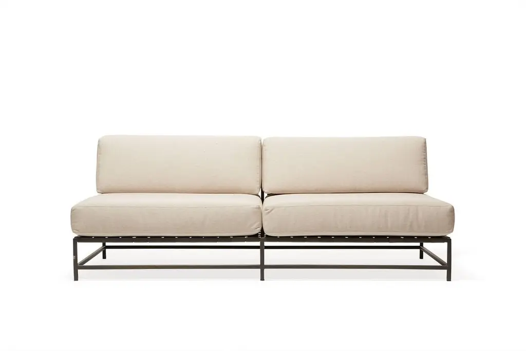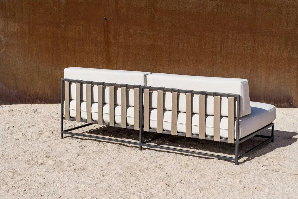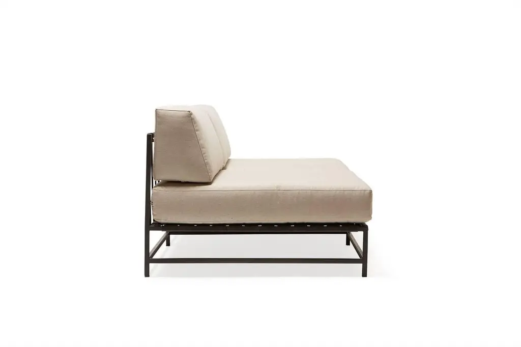 Inspired by weekend visits to the stark desert landscapes found a few hours east of Los Angeles, this collection is composed of steel frames that have been zinc primed and powder coated for rust resistance, interwoven stretch webbing for a soft and springy seating experience, and UV and weather resistant Sunbrella Heritage fabric. Custom dimensions, materials, and finishes are available. The loveseat can be a comfortable seat on its own, or used as part of our Modular Sectional.Shown here with cream upholstery and charcoal frame, with tan or black webbing. Other materials and finishes are available.This item is made to order, in Los Angeles.